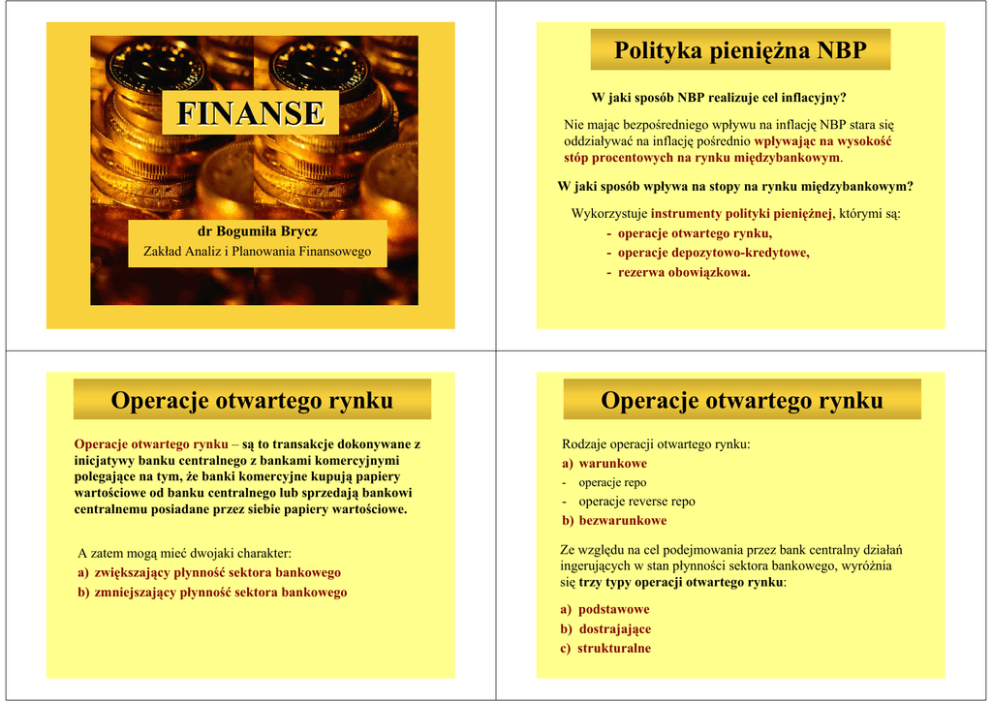 Polityka pienięŜna NBP FINANSE W jaki sposób NBP realizuje cel inflacyjny? Nie mając bezpośredniego wpływu na inflację NBP stara się oddziaływać na inflację pośrednio wpływając na wysokość stóp procentowych na rynku międzybankowym. W jaki sposób wpływa na stopy na rynku międzybankowym? Wykorzystuje instrumenty polityki pienięŜnej, którymi są: - operacje otwartego rynku, - operacje depozytowo-kredytowe, - rezerwa obowiązkowa. dr Bogumiła Brycz Zakład Analiz i Planowania Finansowego Operacje otwartego rynku Operacje otwartego rynku Operacje otwartego rynku – są to transakcje dokonywane z inicjatywy banku centralnego z bankami komercyjnymi polegające na tym, Ŝe banki komercyjne kupują papiery wartościowe od banku centralnego lub sprzedają bankowi centralnemu posiadane przez siebie papiery wartościowe. Rodzaje operacji otwartego rynku: a) warunkowe A zatem mogą mieć dwojaki charakter: a) zwiększający płynność sektora bankowego b) zmniejszający płynność sektora bankowego Ze względu na cel podejmowania przez bank centralny działań ingerujących w stan płynności sektora bankowego, wyróŜnia się trzy typy operacji otwartego rynku: - operacje repo - operacje reverse repo b) bezwarunkowe a) podstawowe b) dostrajające c) strukturalne Operacje otwartego rynku na okres 2 stycznia – 31 marca 2009 r. Zgodnie z ogłoszonym przez NBP harmonogramem operacji otwartego rynku na okres 2 stycznia – 31 marca 2009 r. NBP będzie w tym okresie przeprowadzał następujące operacje: - operacje podstawowe – przeprowadzane w kaŜdy piątek w postaci emisji 7-dniowych bonów pienięŜnych NBP lub, w przypadku pojawienia się niedoboru płynności w sektorze bankowym, 7-dniowych operacji repo; - operacje dostrajające – przeprowadzane w drugi wtorek miesiąca o charakterze zasilającym z 3-miesięcznym terminem zapadalności; - w przypadku potrzeby dodatkowego zasilenia sektora bankowego w płynność, w kaŜde pozostałe wtorki NBP będzie przeprowadzał operacje dostrajające repo z terminem zapadalności 91 dni; - kaŜdego dnia NBP będzie mógł przeprowadzać innego rodzaju dostrajające lub strukturalne operacje otwartego rynku - zasilające bądź absorbujące płynność. Operacje typu swap walutowy W październiku 2008 roku RPP poszerzyła zakres stosowanych przez NBP instrumentów polityki pienięŜnej – wprowadzono dodatkowy instrument, jakim jest swap walutowy. Transakcje typu swap walutowy – NBP kupuje (lub sprzedaje) złote za walutę obcą na rynku kasowym i jednocześnie odsprzedaje (lub odkupuje) je, w ramach transakcji, w określonej dacie. Obecnie stosowane operacje typu swap walutowy (komunikat NBP ze stycznia): - raz w tygodniu (w kaŜdy poniedziałek) przynajmniej do końca kwietnia 2009 r. będą przeprowadzane operacje typu swap walutowy na parach walut CHF/PLN, EUR/PLN i USD/PLN z 7-dniowym terminem zapadalności; - w przypadku potrzeby dodatkowego zasilenia w płynność w USD, moŜliwe będzie przeprowadzanie operacji typu swap walutowy na parze walut USD/PLN z terminem 7-dniowym, częściej niŜ raz w tygodniu. Operacje otwartego rynku S topa [%] Poprzez odpowiednie dobranie ilości przeprowadzanych operacji otwartego rynku NBP dąŜy do tego, by stopa procentowa, po jakiej poŜyczają sobie pieniądze banki komercyjne, tzw. WIBOR, była bliska wartości stopy referencyjnej Stopa referencyjna a SW WIBOR 7 6 5 4 3 2 1 WIBOR Re fe re ncyjna 09-03-02 09-01-02 08-11-02 08-09-02 08-07-02 08-05-02 08-03-02 08-01-02 07-11-02 07-09-02 07-07-02 07-05-02 07-03-02 0 07-01-02 WIBOR (warsaw interbank offered rate) - oprocentowanie po jakim banki udzielą poŜyczek innym bankom WIBID (warsaw interbank bid rate) - stopa procentowa jaką banki zapłacą za środki przyjęte w depozyt od innych banków W zaleŜności od okresu, na jaki banki poŜyczają/lokują środki, stosowane są róŜne stawki, np: O/N (over night) T/N (tomorrow next) SW (spot week) Operacje kredytowo-depozytowe S to pa [%] Transakcje kredytowo-depozytowe - banki komercyjne mają moŜliwość wypoŜyczania oraz lokowania środków w banku centralnym. Odbywa się to z inicjatywy banków komercyjnych, ale w ramach limitów i na warunkach ustalonych przez bank centralny. Stopy NBP a SW WIBOR 8 7 6 5 4 Stopy NBP a SW i O/N WIBOR 8 1 S W WIBOR Re fe re ncyjna De pozytowa 09-03-02 09-01-02 08-11-02 08-09-02 08-07-02 08-05-02 08-03-02 08-01-02 07-11-02 07-09-02 07-07-02 07-05-02 0 Lomba rdowa Kredyt redyskontowy Kredyt redyskontowy – kredyt zaciągany przez banki komercyjne w banku centralnym poprzez sprzedanie mu (oddanie do redyskonta) weksli wykupionych od klientów. 7 6 5 4 3 2 1 S W WIBOR Re fe re ncyjna De pozytowa Lomba rdowa 09-02-17 09-01-17 08-12-17 08-11-17 08-10-17 08-09-17 08-08-17 08-07-17 08-06-17 08-05-17 08-04-17 0 08-03-17 S to pa [%] 2 07-03-02 Operacje depozytowe - lokaty na rachunku terminowym w banku centralnym, zwane depozytami na koniec dnia. 3 07-01-02 Kredyt lombardowy - podstawowa forma refinansowania się banków komercyjnych w banku centralnym; jest formą krótkookresowej poŜyczki udzielanej bankom komercyjnym pod zastaw papierów wartościowych, oprocentowanej według stopy lombardowej. O/N WIBOR