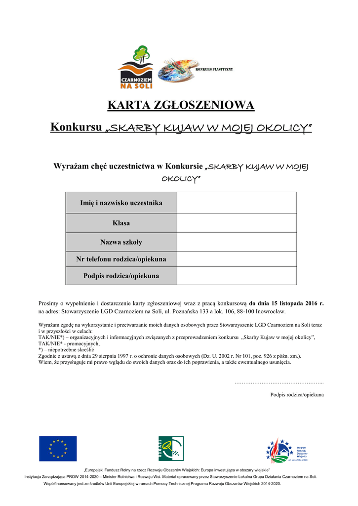 KARTA ZGŁOSZENIOWA Konkursu „SKARBY KUJAW W MOJEJ OKOLICY” Wyrażam chęć uczestnictwa w Konkursie „SKARBY KUJAW W MOJEJ OKOLICY” Imię i nazwisko uczestnika Klasa Nazwa szkoły Nr telefonu rodzica/opiekuna Podpis rodzica/opiekuna Prosimy o wypełnienie i dostarczenie karty zgłoszeniowej wraz z pracą konkursową do dnia 15 listopada 2016 r. na adres: Stowarzyszenie LGD Czarnoziem na Soli, ul. Poznańska 133 a lok. 106, 88-100 Inowrocław. Wyrażam zgodę na wykorzystanie i przetwarzanie moich danych osobowych przez Stowarzyszenie LGD Czarnoziem na Soli teraz i w przyszłości w celach: TAK/NIE*) – organizacyjnych i informacyjnych związanych z przeprowadzeniem konkursu „Skarby Kujaw w mojej okolicy”, TAK/NIE* - promocyjnych, *) – niepotrzebne skreślić Zgodnie z ustawą z dnia 29 sierpnia 1997 r. o ochronie danych osobowych (Dz. U. 2002 r. Nr 101, poz. 926 z późn. zm.). Wiem, że przysługuje mi prawo wglądu do swoich danych oraz do ich poprawienia, a także ewentualnego usunięcia. ………………………………………….. Podpis rodzica/opiekuna „Europejski Fundusz Rolny na rzecz Rozwoju Obszarów Wiejskich: Europa inwestująca w obszary wiejskie” Instytucja Zarządzająca PROW 2014-2020 – Minister Rolnictwa i Rozwoju Wsi. Materiał opracowany przez Stowarzyszenie Lokalna Grupa Działania Czarnoziem na Soli. Współfinansowany jest ze środków Unii Europejskiej w ramach Pomocy Technicznej Programu Rozwoju Obszarów Wiejskich 2014-2020.