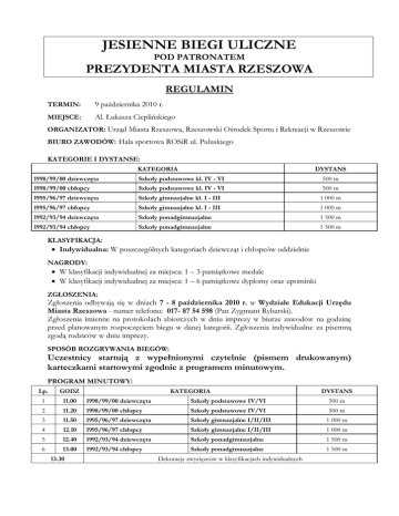 JESIENNE BIEGI ULICZNE POD PATRONATEM PREZYDENTA MIASTA RZESZOWA REGULAMIN TERMIN: 9 października 2010 r. MIEJSCE: Al. Łukasza Cieplińskiego ORGANIZATOR: Urząd Miasta Rzeszowa, Rzeszowski Ośrodek Sportu i Rekreacji w Rzeszowie BIURO ZAWODÓW: Hala sportowa ROSiR ul. Pułaskiego KATEGORIE I DYSTANSE: KATEGORIA DYSTANS 1998/99/00 dziewczęta Szkoły podstawowe kl. IV - VI 500 m 1998/99/00 chłopcy Szkoły podstawowe kl. IV - VI 500 m 1995/96/97 dziewczęta Szkoły gimnazjalne kl. I - III 1 000 m 1995/96/97 chłopcy Szkoły gimnazjalne kl. I - III 1 000 m 1992/93/94 dziewczęta Szkoły ponadgimnazjalne 1 500 m 1992/93/94 chłopcy Szkoły ponadgimnazjalne 1 500 m KLASYFIKACJA: Indywidualna: W poszczególnych kategoriach dziewcząt i chłopców oddzielnie NAGRODY: W klasyfikacji indywidualnej za miejsca: 1 – 3 pamiątkowe medale W klasyfikacji indywidualnej za miejsca: 1 – 6 pamiątkowe dyplomy oraz upominki ZGŁOSZENIA: Zgłoszenia odbywają się w dniach 7 - 8 października 2010 r. w Wydziale Edukacji Urzędu Miasta Rzeszowa - numer telefonu: 017- 87 54 598 (Pan Zygmunt Rybarski). Zgłoszenia imienne na protokołach zbiorczych w dniu imprezy w biurze zawodów na godzinę przed planowanym rozpoczęciem biegu w danej kategorii. Zgłoszenia indywidualne za pisemną zgodą rodziców w dniu imprezy. SPOSÓB ROZGRYWANIA BIEGÓW: Uczestnicy startują z wypełnionymi czytelnie (pismem drukowanym) karteczkami startowymi zgodnie z programem minutowym. PROGRAM MINUTOWY: Lp. GODZ 1 11.00 1998/99/00 dziewczęta Szkoły podstawowe IV/VI 500 m 2 11.20 1998/99/00 chłopcy Szkoły podstawowe IV/VI 500 m 3 11.50 1995/96/97 dziewczęta Szkoły gimnazjalne I/II/III 1 000 m 4 12.10 1995/96/97 chłopcy Szkoły gimnazjalne I/II/III 1 000 m 5 12.40 1992/93/94 dziewczęta Szkoły ponadgimnazjalne 1 500 m 13.00 1992/93/94 chłopcy Szkoły ponadgimnazjalne 1 500 m 6 13.30 KATEGORIA Dekoracje zwycięzców w klasyfikacjach indywidualnych DYSTANS