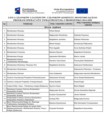 LISTA CZŁONKÓW I ZASTĘPCÓW CZŁONKÓW KOMITETU MONITORUJĄCEGO PROGRAM OPERACYJNY INFRASTRUKTURA I ŚRODOWISKO 2014-2020 Lp. Instytucja Imię i nazwisko członka Imię i nazwisko zastępcy członka Strona rządowa 1 Ministerstwo Rozwoju Witold Słowik 2 Ministerstwo Rozwoju Małgorzata Wierzbicka Gabriela Popowicz 3 Ministerstwo Rozwoju Magdalena Jasińska Elżbieta Pietraszko 4 Ministerstwo Rozwoju Marek Kalupa Konstancja Piątkowska 5 Ministerstwo Rozwoju Piotr Zygadło Anna Sulińska-Wójcik 6 Ministerstwo Finansów Barbara Styczeń Magdalena Rudnicka 7 Ministerstwo Energii Agnieszka Michalska Marcin Janiak 8 Ministerstwo Kultury i Dziedzictwa Narodowego Karolina Tylus-Sowa Przemysław Niedźwiecki 9 Ministerstwo Rolnictwa i Rozwoju Wsi Magdalena Nowicka Katarzyna Pawlikowska 10 Ministerstwo Środowiska Aleksandra Piotrowicz - Przyłuska 11 Ministerstwo Zdrowia Anna Goławska Małgorzata Iwanicka-Michałowicz 12 Centrum Koordynacji Projektów Środowiskowych Aleksandra Wosztyl Anna Zawiła-Niedźwiecka 13 Centrum Unijnych Projektów Transportowych Paweł Szaciłło Paweł Engel 14 Instytut Nafty i Gazu - Państwowy Instytut Badawczy Szymon Kawa Maria Migdał 15 16 17 18 19 Narodowy Fundusz Ochrony Środowiska i Gospodarki Wodnej Narodowy Fundusz Ochrony Środowiska i Gospodarki Wodnej Wojewódzki Fundusz Ochrony Środowiska i Gospodarki Wodnej w Katowicach Biuro Pełnomocnika Rządu ds. Równego Traktowania, Kancelaria Premiera Biuro Pełnomocnika Rządu do spraw Osób Niepełnosprawnych, Ministerstwo Rodziny, Pracy i Polityki Społecznej Małgorzata Skucha Dorota Zawadzka-Stępniak Krystian Szczepański Jacek Gdański Andrzej Pilot Małgorzata Kuchna Barbara Szymborska Rita Kameduła-Tomaszewska Krzysztof Kosiński Magdalena Szymańska LISTA CZŁONKÓW I ZASTĘPCÓW CZŁONKÓW KOMITETU MONITORUJĄCEGO PROGRAM OPERACYJNY INFRASTRUKTURA I ŚRODOWISKO 2014-2020 Lp. Instytucja Imię i nazwisko członka Imię i nazwisko zastępcy członka Strona pozarządowa 20 Business Centre Club Ryszard Pazdan Marcin Tumanow 21 Centrum Zrównoważonego Transportu Krzysztof Rytel Marta Wiśniewska 22 Forum Związków Zawodowych Jan Przywoźny Zenon Kopyściński 23 Fundacja WWF Polska Tobiasz Adamczewski Julia Krzyszkowska 24 Konfederacja Lewiatan Łukasz Dyba Daria Kulczycka 25 Konferencja Rektorów Akademickich Szkół Polskich Jan Szmidt Anna Dobrowolska 26 Krajowa Izba Gospodarcza Józef Marek Kowalczyk Krzysztof Kawczyński 27 NSZZ "Solidarność" Bogdan Kubiak Kazimierz Grajcarek 28 Ogólnopolskie Porozumienie Związków Zawodowych Leszek Miętek Bożena Gawryluk 29 Polska Rada Organizacji Młodzieżowych Beata Matyjaszczyk Wiesław Turzyński 30 Pracodawcy Rzeczypospolitej Polskiej Grzegorz Byszewski Ewa Płodzień - Pałasz Jakub Krzysztof Adamski Anna Pielaszek 32 Związek Ochotniczych Straży Pożarnych RP Renata Cybor Leszek Filipiak 33 Związek Rzemiosła Polskiego Marta Jankowska Andrzej Stępnikowski 34 Związek Stowarzyszeń Polska Zielona Sieć Joanna Furmaga Piotr Nieznański 31 SISKOM – Stowarzyszenie Integracji Stołecznej Komunikacji Strona samorządowa 35 Unia Metropolii Polskich Michał Olszewski Maciej Fijałkowski 36 Unia Miasteczek Polskich Stanisław Bodys Anna Szokaluk 37 Związek Gmin Wiejskich RP Edward Trojanowski Paweł Tomczak 38 Związek Miast Polskich Henryk Zaguła Katarzyna Jurczak-Klocek 39 Związek Powiatów Polskich Krzysztof Nosal Jarosław Komża 40 Związek Województw RP Olgierd Geblewicz LISTA OBSERWATORÓW KOMITETU MONITORUJĄCEGO PROGRAM OPERACYJNY INFRASTRUKTURA I ŚRODOWISKO 2014-2020 lp. Nazwisko i imię Instytucja 1 Adamowicz Agata Ministerstwo Finansów 2 Aulak Maciej Ministerstwo Rozwoju 3 Bąkowski Marek Polska Izba Informatyki i Telekomunikacji 4 Bieniaszewska Monika Ministerstwo Rozwoju 5 Czajkowska Iwona Ministerstwo Rozwoju 6 Jaworski Krzysztof Ministerstwo Rozwoju 7 Kalisz Karina Ministerstwo Rozwoju 8 Kaźmierczak Sławomir PKP Polskie Linie Kolejowe S.A. 9 Kracoń Edyta Ministerstwo Rozwoju 10 Kuczyńska Magdalena Polskie Towarzystwo Przesyłu i Rozdziału Energii Elektrycznej 11 Lewicki Arkadiusz Związek Banków Polskich 12 Milwicz Monika GDDKiA 13 Orliński Jarosław Ministerstwo Rozwoju 14 Paluszyński Wiesław Polska Izba Informatyki i Telekomunikacji 15 Ptaszyński Michał Ministerstwo Rozwoju 16 Szpila Michał Izba Gospodarcza Gazownictwa 17 Wilde Justyna Ministerstwo Rozwoju 18 Krzysztof Wybieralski PKP Polskie Linie Kolejowe S.A. 19 Zając Sylwester Ministerstwo Rozwoju 20 Zdun Paweł Ministerstwo Rozwoju Strona 3 z 3 Komitet Monitorujący POIiŚ jest współfinansowany ze środków Unii Europejskiej i budżetu państwa
