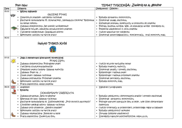 TEMAT TYGODNIA: Plan zajęć Data 05.01 Działania Zwierzęta są głodne Umiejętności - Dziecko : Wizyta logopedy GŁODNE PTAKI Zmarznięty ptaszek- ćwiczenia ruchowe Słuchanie opowiadania M. Kownackiej „Śpiewająca choinka” Rozmowa na temat tekstu. Zabawa dydaktyczna: Jak pomóc wróbelkowi? Oglądanie książek, albumów poświęconych ptakom Ćwiczenie oddechowe: Opadające piórko Wykonanie ćwiczeń na karcie pracy Rozwija sprawność motoryczną Doskonali uwagę słuchową Kształtuje postawę opiekuńczą w stosunku do ptaków Poznaję budowę wróbla. Wie, że populacja wróbli zmniejsza się Poszerza wiadomości o życiu ptaków Ćwiczy właściwy tor oddechu Doskonali spostrzegawczość, koncentrację, oraz motorykę małą Ćwiczy mięśnie narządów mowy Rozwija inwencję twórczą Doskonali analizę i syntezę słuchową Rozpoznaje i nazywa ptaki Rozpoznaje i nazywa przysmaki ptaków Doskonali percepcję słuchową Rozwija motorykę małą 06.01 Święto Trzech Króli 07.01 08.01 Joga z elementami gimnastyki korekcyjnej PTAKI ZIMĄ Zabawa dydaktyczna: Poznajemy ptaki Ćwiczenia dźwiękonaśladowcze Układamy ptaka cudaka- zabawa twórcza Zabawa: Ptak na…? Znam ptaki- zabawa ruchowa Zabawa poznawcza: Przysmaki ptaków Wykonanie ćwiczeń na karcie pracy Praca plastyczna: Atlas ptaków Angielski Rytmika DOKARMIAMY ZWIERZĘTA Zabawa grupowa: Jaka to głoska? Wyprawa do lasu- zabawa ruchowa Słuchanie opowiadania H. Zdzitowieckiej: „Przy leśnych paśnikach” Chodzimy według wzoru- zabawa ruchowa Zabawy przy piosence: „Głodny ptaszek” Wykonanie ćwiczeń na karcie pracy Zabawa relaksacyjna: Jesteśmy w lesie Praca plastyczna: Zwierzęta zimą Zgodnie z programem Rozwija umiejętność dokonywania analizy i syntezy słuchowej Doskonali sprawność motoryczną Poznaje warunki panujące zimą w lesie , wie czym dokarmiamy zwierzęta Ćwiczy orientację w przestrzeni, przestrzega reguł w zabawie Rozwija umiejętności wokalne Utrwala zdobyte wiadomości Zmniejsza napięcie psychofizyczne, odpręża się 09.01 MÓWIMY WYRAŹNIE Gimnastyka buzi i języka- ćwiczenia artykulacyjne Zabawa słuchowa: Różnice pomiędzy słowami Recytowanie fragmentu wiersza J. Brzechwy: „Entliczek, pentliczek” Kaczka Kwaczka- nauka wyliczanki Zabawa dydaktyczna: Prawda to czy plotka? Dotknij czegoś- zabawa ruchowa Zabawa plastyczna: Ptaszek gazeciuszek Usprawnia język i wargi Doskonali analizę i syntezę słuchową Próbuje uzyskać właściwie brzmiącą artykulację Utrwala głoski: c, cz Określa logiczną wartość zdań Rozwija umiejętność dostrzegania określonych cech przedmiotów Tworzy formę przestrzenną z gazet, rozwija twórczość