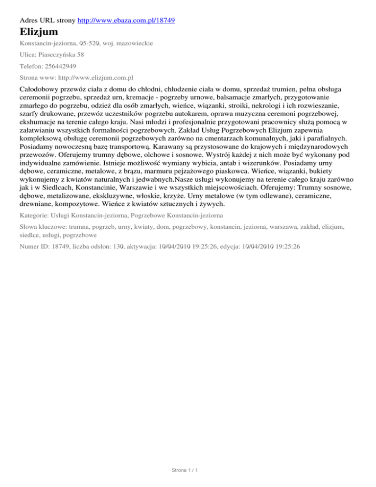 Adres URL strony http://www.ebaza.com.pl/18749 Elizjum Konstancin-jeziorna, 05-520, woj. mazowieckie Ulica: Piaseczyńska 58 Telefon: 256442949 Strona www: http://www.elizjum.com.pl Całodobowy przewóz ciała z domu do chłodni, chłodzenie ciała w domu, sprzedaż trumien, pełna obsługa ceremonii pogrzebu, sprzedaż urn, kremacje - pogrzeby urnowe, balsamacje zmarłych, przygotowanie zmarłego do pogrzebu, odzież dla osób zmarłych, wieńce, wiązanki, stroiki, nekrologi i ich rozwieszanie, szarfy drukowane, przewóz uczestników pogrzebu autokarem, oprawa muzyczna ceremoni pogrzebowej, ekshumacje na terenie całego kraju. Nasi młodzi i profesjonalnie przygotowani pracownicy służą pomocą w załatwianiu wszystkich formalności pogrzebowych. Zakład Usług Pogrzebowych Elizjum zapewnia kompleksową obsługę ceremonii pogrzebowych zarówno na cmentarzach komunalnych, jaki i parafialnych. Posiadamy nowoczesną bazę transportową. Karawany są przystosowane do krajowych i międzynarodowych przewozów. Oferujemy trumny dębowe, olchowe i sosnowe. Wystrój każdej z nich może być wykonany pod indywidualne zamówienie. Istnieje możliwość wymiany wybicia, antab i wizerunków. Posiadamy urny dębowe, ceramiczne, metalowe, z brązu, marmuru pejzażowego piaskowca. Wieńce, wiązanki, bukiety wykonujemy z kwiatów naturalnych i jedwabnych.Nasze usługi wykonujemy na terenie całego kraju zarówno jak i w Siedlcach, Konstancinie, Warszawie i we wszystkich miejscowościach. Oferujemy: Trumny sosnowe, dębowe, metalizowane, ekskluzywne, włoskie, krzyże. Urny metalowe (w tym odlewane), ceramiczne, drewniane, kompozytowe. Wieńce z kwiatów sztucznych i żywych. Kategorie: Usługi Konstancin-jeziorna, Pogrzebowe Konstancin-jeziorna Słowa kluczowe: trumna, pogrzeb, urny, kwiaty, dom, pogrzebowy, konstancin, jeziorna, warszawa, zakład, elizjum, siedlce, usługi, pogrzebowe Numer ID: 18749, liczba odsłon: 130, aktywacja: 10/04/2010 19:25:26, edycja: 10/04/2010 19:25:26 Strona 1 / 1