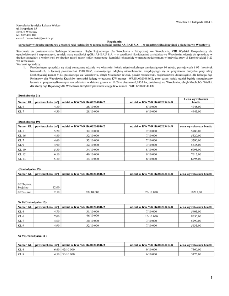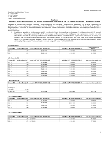 Wrocław 18 listopada 2014 r. Kancelaria Syndyka Łukasz Welcer ul. Krupnicza 15 50-075 Wrocław tel. 609 496 187 e-mail : [email protected] Regulamin sprzedaży w drodze przetargu z wolnej ręki udziałów w nieruchomości spółki AS-BAU S.A. – w upadłości likwidacyjnej z siedzibą we Wrocławiu Stosownie do postanowienia Sędziego Komisarza Sądu Rejonowego dla Wrocławia - Fabrycznej we Wrocławiu, VIII Wydział Gospodarczy ds. upadłościowych i naprawczych, syndyk masy upadłości spółki AS-BAU S.A. – w upadłości likwidacyjnej z siedzibą we Wrocławiu, oferuje do sprzedaży w drodze sprzedaży z wolnej ręki (w drodze aukcji ustnej) niżej oznaczone komórki lokatorskie w garażu podziemnym w budynku przy ul Drohobyckiej 9-23 we Wrocławiu. Warunki sprzedaży: 1. Przedmiotem sprzedaży są niżej oznaczone udziały we własności lokalu niemieszkalnego zawierającego 90 miejsc postojowych i 95 komórek lokatorskich, o łącznej powierzchni 1518,50m², stanowiącego odrębną nieruchomość, znajdującego się w przyziemiu budynku przy ulicy Drohobyckiej numer 9-23, położonego we Wrocławiu, obręb Muchobór Wielki, powiat wrocławski, województwo dolnośląskie, dla którego Sąd Rejonowy dla Wrocławia Krzyków prowadzi księgę wieczystą KW numer WR1K/00204846/2, przy czym każdy udział będzie sprzedawany łącznie z przyporządkowanym mu udziałem w działce gruntu nr 11/24 o obszarze 0,0335 ha, położonej we Wrocławiu, obręb Muchobór Wielki, dla której Sąd Rejonowy dla Wrocławia Krzyków prowadzi księgę KW numer WR1K/00203414/8. (Drohobycka 21) Numer KL powierzchnia [m²] udział w KW WR1K/00204846/2 udział w KW WR1K/00203414/8 Cena wywoławcza brutto KL 6 4,30 28/10 000 6/10 000 4945,00 KL 7 4,30 28/10 000 6/10 000 4945,00 (Drohobycka 19) udział w KW WR1K/00203414/8 cena wywoławcza brutto KL 5 5,20 32/10 000 7/10 000 5980,00 KL 16 4,80 32/10 000 7/10 000 5520,00 KL 7 4,60 32/10 000 7/10 000 5290,00 KL 9 4,90 32/10 000 7/10 000 5635,00 KL 10 5,30 34/10 000 8/10 000 6095,00 KL 12 6,10 40/10 000 9/10 000 7015,00 KL 13 5,30 34/10 000 8/10 000 6095,00 udział w KW WR1K/00203414/8 cena wywoławcza brutto 20/10 000 16215,00 udział w KW WR1K/00203414/8 cena wywoławcza brutto Numer KL powierzchnia [m²] udział w KW WR1K/00204846/2 (Drohobycka 15) Numer KL powierzchnia [m²] 0/26b pom. Socjalne 12,00 0/26a - wc 2,10 udział w KW WR1K/00204846/2 93/ 10 000 Nr 8 (Drohobycka 13) Numer KL powierzchnia [m²] udział w KW WR1K/00204846/2 KL 4 4,70 5405,00 7,00 31/10 000 46/10 000 7/10 000 KL 6 10/10 000 8050,00 KL 7 4,60 30/10 000 7/10 000 5290,00 KL 9 4,90 32/10 000 7/10 000 5635,00 udział w KW WR1K/00203414/8 cena wywoławcza brutto Nr 9 (Drohobycka 11) Numer KL powierzchnia [m²] udział w KW WR1K/00204846/2 KL 4 6,40 42/10 000 9/10 000 7360,00 KL 8 4,50 30/10 000 6/10 000 5175,00 1 Nr 5 (Drohobycka 9) Numer KL powierzchnia [m²] udział w KW WR1K/00204846/2 28/10 000 KL 2 4,20 udział w KW WR1K/00203414/8 cena wywoławcza brutto 6/10 000 4830,00 KL 3 4,70 31/10 000 7/10 000 5405,00 KL 7 4,60 30/10 000 7/10 000 5290,00 2. 3. 4. 5. 6. 7. 8. 9. 10. 11. 12. 13. 14. 15. 16. 17. 18. 19. 20. 21. 22. Informacyjnie syndyk podaje, iż z własnością całego lokalu objętego księgą wieczystą KW numer WR1K/00204846/2 łączy się udział wynoszący 2.142/10.000 w częściach wspólnych budynku i w gruncie, to jest w działce 11/23, objętych księgą wieczysta KW numer WR1K/00203411/7. Nabywcy poszczególnych udziałów będą uprawnieni do korzystania z komórek wyszczególnionych w powyższej tabeli. Nabywcy poszczególnych udziałów wyrażają zgodę na zawieranie przez syndyka masy upadłości Spółki „AS-BAU” Spółka Akcyjna we Wrocławiu, umów o podział do korzystania z pozostałych udziałów lokalu obejmujących dotychczas nie sprzedane udziały odpowiadające miejscom postojowym i komórkom lokatorskim. Sprzedaż nastąpi w drodze aukcji ustnej. Aukcja będzie prowadzona osobno w stosunku do każdej ze zbywanych par udziałów dla każdej kolejnej komórki lokatorskiej zgodnie z numeracją podaną w ust. 1. W aukcji mogą uczestniczyć wyłącznie osoby fizyczne i prawne, którym przysługuje prawo własności lub współwłasności któregokolwiek lokalu położonego w budynku przy ul. Drohobyckiej 9-23 we Wrocławiu, pod warunkiem przesłania najpóźniej do dnia 1 grudnia 2014 roku godzina 10.00, na email [email protected] informacji o zamiarze uczestnictwa w przetargu, obejmującej: - imię i nazwisko/nazwę, - numer księgi wieczystej prowadzonej dla lokalu położonego w budynku przy ul. Drohobyckiej 9-23, którego oferent jest właścicielem lub współwłaścicielem, lub wskazanie, iż jest współwłaścicielem osiedlowych dróg wewnętrznych z oznaczeniem numeru księgi wieczystej, w której jest ujawniony. - potwierdzenie wpłaty wadium w kwocie 500 zł od każdej pary udziałów w nieruchomościach, którą oferent jest zainteresowany na rachunek bankowy AS-BAU S.A. w upadłości likwidacyjnej ul. Rogowska nr 117 B, 54-440 Wrocław, nr: 67 1240 6670 1111 0010 5405 3617. Przystępujący do przetargu powinien okazać dowód osobisty lub aktualny odpis z KRS spółki, zaś w przypadku zamiaru złożenia ofert przez pełnomocnika przedłożyć pełnomocnictwo w oryginale. Niespełnienie któregokolwiek z warunków określonych w ust 5 i 6 powyżej, spowoduje niedopuszczenie do udziału w aukcji. Aukcja zostanie przeprowadzona w Garażu Podziemnym przy ul. Drohobyckiej 9-23 w dniu 1 grudnia 2014 roku, o godz. 18:30. Cena wywoławcza każdej zbywanej pary udziałów brutto w tym podatek VAT w obowiązującej w dacie zawarcia umowy sprzedaży stawce została wskazana w ust 1. Aukcję poprowadzi syndyk. Złożenie jednej oferty wystarcza do odbycia aukcji. Minimalne postąpienie w toku aukcji ustalone będzie w wysokości 50 złotych. Wyboru najkorzystniejszej oferty dokona syndyk, przy czym wyłącznym kryterium wyboru będzie cena. Zawarcie