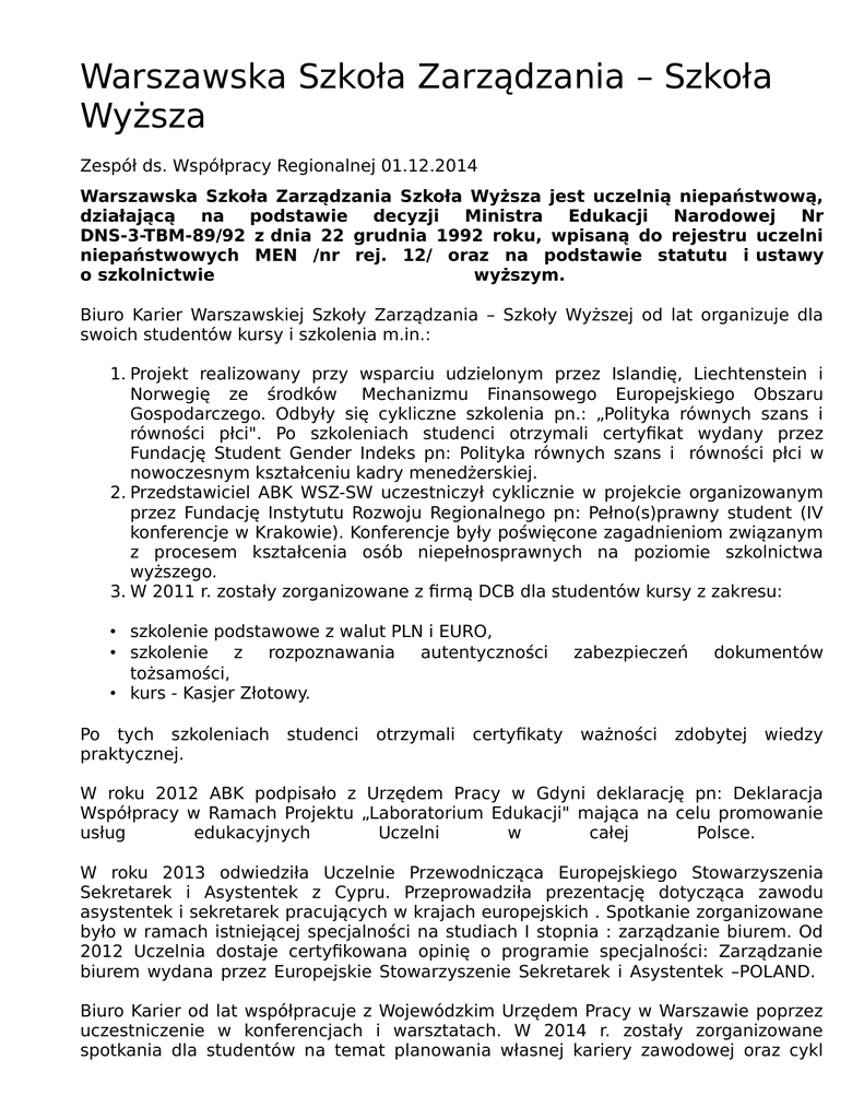 Warszawska Szkoła Zarządzania – Szkoła Wyższa Zespół ds. Współpracy Regionalnej 01.12.2014 Warszawska Szkoła Zarządzania Szkoła Wyższa jest uczelnią niepaństwową, działającą na podstawie decyzji Ministra Edukacji Narodowej Nr DNS-3-TBM-89/92 z dnia 22 grudnia 1992 roku, wpisaną do rejestru uczelni niepaństwowych MEN /nr rej. 12/ oraz na podstawie statutu i ustawy o szkolnictwie wyższym. Biuro Karier Warszawskiej Szkoły Zarządzania – Szkoły Wyższej od lat organizuje dla swoich studentów kursy i szkolenia m.in.: 1. Projekt realizowany przy wsparciu udzielonym przez Islandię, Liechtenstein i Norwegię ze środków Mechanizmu Finansowego Europejskiego Obszaru Gospodarczego. Odbyły się cykliczne szkolenia pn.: „Polityka równych szans i równości płci". Po szkoleniach studenci otrzymali certyfikat wydany przez Fundację Student Gender Indeks pn: Polityka równych szans i równości płci w nowoczesnym kształceniu kadry menedżerskiej. 2. Przedstawiciel ABK WSZ-SW uczestniczył cyklicznie w projekcie organizowanym przez Fundację Instytutu Rozwoju Regionalnego pn: Pełno(s)prawny student (IV konferencje w Krakowie). Konferencje były poświęcone zagadnieniom związanym z procesem kształcenia osób niepełnosprawnych na poziomie szkolnictwa wyższego. 3. W 2011 r. zostały zorganizowane z firmą DCB dla studentów kursy z zakresu: • szkolenie podstawowe z walut PLN i EURO, • szkolenie z rozpoznawania autentyczności tożsamości, • kurs - Kasjer Złotowy. Po tych szkoleniach praktycznej. studenci otrzymali certyfikaty zabezpieczeń ważności dokumentów zdobytej wiedzy W roku 2012 ABK podpisało z Urzędem Pracy w Gdyni deklarację pn: Deklaracja Współpracy w Ramach Projektu „Laboratorium Edukacji" mająca na celu promowanie usług edukacyjnych Uczelni w całej Polsce. W roku 2013 odwiedziła Uczelnie Przewodnicząca Europejskiego Stowarzyszenia Sekretarek i Asystentek z Cypru. Przeprowadziła prezentację dotycząca zawodu asystentek i sekretarek pracujących w krajach europejskich . Spotkanie zorganizowane było w ramach istniejącej specjalności na studiach I stopnia : zarządzanie biurem. Od 2012 Uczelnia dostaje certyfikowana opinię o programie specjalności: Zarządzanie biurem wydana przez Europejskie Stowarzyszenie Sekretarek i Asystentek –POLAND. Biuro Karier od lat współpracuje z Wojewódzkim Urzędem Pracy w Warszawie poprzez uczestniczenie w konferencjach i warsztatach. W 2014 r. zostały zorganizowane spotkania dla studentów na temat planowania własnej kariery zawodowej oraz cykl spotkań pn. "Bezpieczny Wyjazd-bezpieczny Powrót". Celem spotkań było upowszechnienie informacji nt. europejskiego rynku pracy oraz zapoznanie się z siecią europejskiego pośrednictwa pracy EURES. W czerwcu 2014 r. przedstawiciel ABK wziął udział w konferencji pn: „Monitorowanie karier zawodowych absolwentów. Metody jakościowe i ich rola w badaniach rynku pracy", organizowaną przez Uniwersytet Warszawski i Fundację Rozwoju Edukacji Szkolnictwa Wyższego. W lipcu br. ABK zorganizowało wspólnie z Wojewódzką Komendą OHP "Mobilny Kiermasz Pracy". Przedstawiciel OHP udzielał studentom informacji o aktualnych ofertach pracy m.in. wakacyjnej oraz pomagała w napisaniu dokumentów rekrutacyjnych. Elżbieta e-mail: tel.: Warszawska ul. 01-204 Woźniakowska koordynator ds. Biura [email protected] 22 862 33 40 Szkoła Zarządzania Siedmiogrodzka Warszawa Szkoła 3A Karier Wyższa