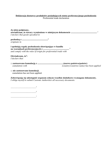 Deklaracja dostawcy produktów posiadających status preferencyjnego pochodzenia Preferential trade declaration Ja niżej podpisany, oświadczam, że towary wymienione w niniejszym dokumencie .............................................. 1 I declare that goods specified in pochodzą z ..............................................2 originate in i spełniają reguły pochodzenia obowiązujące w handlu na warunkach preferencyjnych z .............................................. 3 and comply with the rules of origin for preferential trade with Oświadczam, że4: I declare that: □ zastosowano kumulację z ..............................................(nazwa państwa/państw) cumulation with (country/countries name) has been applied □ nie zastosowano kumulacji. cumulation has not been applied. Zobowiązuję się udostępnić organom celnym wszelkie dodatkowe wymagane dokumenty. I oblige myself to submit Customs Authorities all necessary documents. .............................................5 .............................................6 .............................................7 1 Jeżeli deklaracja dotyczy tylko niektórych towarów wymienionych w niniejszym dokumencie, powinny one zostać wyraźnie wskazane i oznaczone w następujący sposób: “.......... wymienione w niniejszej fakturze i oznaczone .......... pochodzą z ..........” If declaration refers to only certain items specified in the indicated document, they should be clearly stated in the following way: “..........specified in .......... and marked as ..........originate in..........” 2 Wspólnota, państwo, grupa państw lub terytorium, z którego pochodzą towary. Union, country, group of countries, territory of goods origin. 3 Odpowiednie państwo, grupa państw lub terytorium. Adequate country, group of countries, territory. 4 Wypełnić w razie potrzeby jedynie w odniesieniu do towarów posiadających status preferencyjnego pochodzenia w ramach przepisów regulujących handel na warunkach preferencyjnych z jednym z państw, o których mowa w art. 3 i 4 właściwego protokołu w sprawie pochodzenia, w stosunku do którego stosuje się paneurośródziemnomorską kumulację pochodzenia. Fill in only when goods are of preferential origin, according to the rules of origin for preferential trade with one of the countries mentioned in article 3 and 4 of relevant protocol on place of origin allowing application of PanEuroMediterranean cumulation. 5 Miejsce i data. Place and date. 6 Nazwisko i stanowisko w przedsiębiorstwie. Name and job title. 7 Podpis. Signature.
