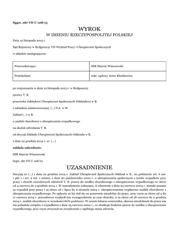 Sygn. akt VII U 128/15 WYROK W IMIENIU RZECZYPOSPOLITEJ POLSKIEJ Dnia 12 listopada 2015 r. Sąd Rejonowy w Bydgoszczy VII Wydział Pracy i Ubezpieczeń Społecznych w składzie następującym: Przewodniczący: SSR Marcin Winczewski Protokolant: sekr. sądowy Artur Kluskiewicz po rozpoznaniu w dniu 12 listopada 2015 r. w Bydgoszczy sprawy T. B. przeciwko Zakładowi Ubezpieczeń Społecznych Oddziałowi w B. z udziałem zainteresowanej (...) S.A. w W. Zakład (...) w B. o zasiłek chorobowy z ubezpieczenia wypadkowego na skutek odwołania T. B. od decyzji Zakładu Ubezpieczeń Społecznych Oddziału w B. z dnia 22 grudnia 2014 r. nr (...) oddala odwołanie. SSR Marcin Winczewski Sygn. akt VII U 128/15 UZASADNIENIE Decyzją nr (...) z dnia 22 grudnia 2014 r. Zakład Ubezpieczeń Społecznych Oddział w B., na podstawie art. 6 ust. 1 pkt 1 i art. 9 ust. 1 ustawy z dnia 30 października 2002 r. o ubezpieczeniu społecznym z tytułu wypadków przy pracy i chorób zawodowych odmówił T. B. prawa do zasiłku chorobowego z ubezpieczenia wypadkowego za okres od 4 czerwca do 2 grudnia 2014 r. W uzasadnieniu wskazano, iż zdarzenie z dnia 25 czerwca 2004 r. zostało uznane za wypadek przy pracy i za okres od 1 lipca do 9 sierpnia 2004 r. ubezpieczonemu wypłacono zasiłek chorobowy z ubezpieczenia wypadkowego. Po upływie 10 lat stał się on ponownie niezdolny do pracy, przy czym za okres od 4 do 17 czerwca 2014 r. pracodawca wypłacił mu wynagrodzenie za czas choroby, a za okres od 18 czerwca do 2 grudnia 2014 r. zasiłek chorobowy w wysokości 80% podstawy. W ocenie lekarza orzecznika, obecna niezdolność do pracy nie ma jednakże związku z wypadkiem z dnia 25 czerwca 2004 r., co skutkuje brakiem prawa do zasiłku z ubezpieczenia wypadkowego, przy czym otrzymał on świadczenie z ogólnego stanu zdrowia. Odwołanie od powyższej decyzji wniósł T. B., domagając się przyznania prawa do zasiłku chorobowego z ubezpieczenia wypadkowego. W uzasadnieniu wskazał, że w dniu 25 czerwca 2004 r. uległ wypadkowi przy pracy. Absencja chorobowa w okresie od 26 czerwca do 9 sierpnia 2004 r. nie dała oczekiwanych rezultatów, a po powrocie do pracy dalej odczuwał bóle w kolanie. Dopiero rezonans magnetyczny z dnia 9 czerwca 2010 r. wykazał naderwanie więzadła i niestabilność kolana. Zabieg operacyjny odbył się dnia 5 czerwca 2014 r. i nadal odczuwa niedyspozycje kolana. W odpowiedzi na odwołanie Zakład Ubezpieczeń Społecznych Oddział w B. wniósł o jego oddalenie, podtrzymując stanowisko przedstawione w zaskarżonej decyzji. Postanowieniem z dnia 26 maja 2015 r. (k. 64) Sąd wezwał do udziału w sprawie w charakterze zainteresowanej (...) S.A. w W. Zakład (...) w B., która jednakże nie zajęła jakiegokolwiek stanowiska w sprawie. Sąd ustalił, co następuje: T. B. jest zatrudniony w (...) S.A. w W. Zakładzie (...) w B., na podstawie umowy o pracę, na stanowisku toromistrza. Dnia 25 czerwca 2004 r. rozpoczął swą pracę na stacji W.. W trakcie wykonywanego obchodu, około godziny 14.40, potknął się o tłuczeń i przewrócił na prawe kolano. Po zdarzeniu udał się do lekarza. Zdarzenie to zostało uznane za wypadek przy pracy zarówno przez pracodawcę, jak i przez Zakład Ubezpieczeń Społecznych, a za okres od 1 lipca do 9 sierpnia 2004 r. ubezpieczonemu wypłacono wówczas zasiłek chorobowy z ubezpieczenia wypadkowego. (okoliczności bezsporne, ponadto dowód: protokół ustalenia okoliczności i przyczyn wypadku przy pracy z dnia 9 lipca 2004 r. – k. 8; przesłuchanie ubezpieczonego – k. 64-65) Po upływie blisko 10 lat od wypadku przy pracy T. B. stał się ponownie niezdolny do pracy, przy czym za okres od 4 do 17 czerwca 2014 r. pracodawca wypłacił mu wynagrodzenie za czas choroby, a za okres od 18 czerwca do 2 grudnia 2014 r. zainteresowana Spółka wypłaciła także zasiłek chorobowy w związku z ogólnym stanem zdrowia – z ubezpieczenia chorobowego. Zaskarżoną decyzją natomiast odmówiono mu prawa do zasiłku chorobowego za okres od 4 czerwca do 2 grudnia 2014 r. z ubezpieczenia wypadkowego. (okoliczności bezsporne, ponadto dowód: decyzja ZUS z dnia 22 grudnia 2014 r. – k. 40 akt ZUS; przesłuchanie ubezpieczonego – k. 64-65) T. B. był niezdolny do pracy w okresie od 4 czerwca do 2 grudnia 2014 r. w związku z ogólnym stanem zdrowia, a niezdolność ta nie miała związku z wypadkiem przy pracy z dnia 25 czerwca 2004 r. Po zdarzeniu z 2004 r., w którym ubezpieczony doznał urazu prawego kolana, był leczony zachowawczo, także z dostawowym podawaniem leków sterydowych (Diprophos). Po dniu 9 sierpnia 2004 r. wrócił przy tym do świadczenia pracy, którą wykonywał także przed zdarzeniem. W okresie od 11 do 14 września 2007 r. był leczony w Szpitalu Wojewódzkim im. (...) w B. w Oddziale (...), z rozpoznaniem: uszkodzenie rogu tylnego łąkotki przyśrodkowej stawu kolanowego prawego. Dnia 12 września 2007 r. przeprowadzono leczenie operacyjne – artroskopię operacyjną prawego stawu kolanowego, z usunięciem rogu tylnego łąkotki przyśrodkowej. Następnie był leczony w poradni ortopedycznej. Dnia 9 czerwca 2010 r. wykonano badanie MR stawu kolanowego prawego – stwierdzono usunięcie łąkotki przyśrodkowej oraz podejrzenie złamania rogu tylnego łąkotki bocznej. Dnia 31 lipca 2013 r. ponownie wykonano badanie MR stawu kolanowego prawego – stwierdzono stan po zerwaniu ACL, stan po częściowym usunięciu łąkotki przyśrodkowej kolana prawego. W okresie od 4 do 13 czerwca 2014 r. ubezpieczony był leczony szpitalnie w Oddziale Chirurgii Urazowej i Ortopedii Szpitala w I., z rozpoznaniem: uszkodzenie ACL kolana prawego, Chm MCF 2st, MCT 3st, stan po częściowej meniscektomii przyśrodkowej, artroskopowa rekonstrukcja ACL/BTB. Przeprowadzono wówczas leczenie operacyjne – anatomiczną artroskopową rekonstrukcję ACL/BTB, a następnie zalecono leczenie w poradni ortopedycznej. Jednostka chorobowa, na którą ubezpieczo