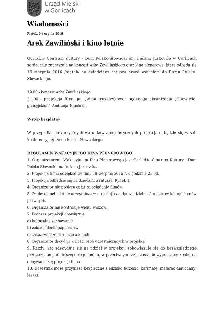 Wiadomości Piątek, 5 sierpnia 2016 Arek Zawiliński i kino letnie Gorlickie Centrum Kultury - Dom Polsko-Słowacki im. Dušana Jurkoviča w Gorlicach serdecznie zapraszają na koncert Arka Zawilińskiego oraz kino plenerowe, które odbędą się 19 sierpnia 2016 /piątek/ na dziedzińcu ratusza przed wejściem do Domu PolskoSłowackiego. 19.00 - koncert Arka Zawilińskiego 21.00 - projekcja filmu pt. „Wino truskawkowe” będącego ekranizacją „Opowieści galicyjskich” Andrzeja Stasiuka. Wstęp bezpłatny! W przypadku niekorzystnych warunków atmosferycznych projekcja odbędzie się w sali konferencyjnej Domu Polsko-Słowackiego. REGULAMIN WAKACYJNEGO KINA PLENEROWEGO 1. Organizatorem Wakacyjnego Kina Plenerowego jest Gorlickie Centrum Kultury - Dom Polsko-Słowacki im. Dušana Jurkoviča. 2. Projekcja filmu odbędzie się dniu 19 sierpnia 2016 r. o godzinie 21:00. 3. Projekcja odbędzie się na dziedzińcu ratusza, Rynek 1. 4. Organizator nie pobiera opłat za oglądanie filmów. 5. Osoby niepełnoletnie uczestniczą w projekcji na odpowiedzialność rodziców lub opiekunów prawnych. 6. Organizator nie kontroluje wieku widzów. 7. Podczas projekcji obowiązuje: a) kulturalne zachowanie b) zakaz palenia papierosów c) zakaz wnoszenia i picia alkoholu. 8. Organizator decyduje o ilości osób uczestniczących w projekcji. 9. Każdy, kto zdecyduje się na udział w projekcji zobowiązuje się do bezwzględnego przestrzegania niniejszego regulaminu, w przeciwnym razie zostanie wyproszony z miejsca odbywania się projekcji filmu. 10. Uczestnik może przynieść bezpieczne siedzisko (krzesło, karimatę, materac dmuchany, leżak).