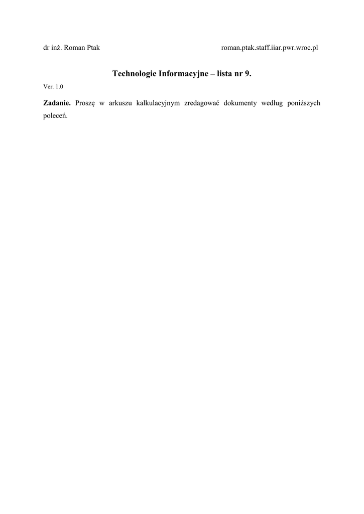 dr inż. Roman Ptak roman.ptak.staff.iiar.pwr.wroc.pl Technologie Informacyjne – lista nr 9. Ver. 1.0 Zadanie. Proszę w arkuszu kalkulacyjnym zredagować dokumenty według poniższych poleceń. Wykresy w Excelu Zad. 1. Opracuj wykres funkcji sinus na przedziale 0-360o. Przykład poniżej. 1 0,5 0 0 30 60 90 120 150 180 210 240 270 300 330 360 -0,5 -1 Zad. 2. Opracuj wykresy innych funkcji trygonometrycznych stosując różne typy wykresów. Zad. 3. Stosując wykres giełdowy (z czterema seriami danych) opracuj daty życia i panowania władców Polski. Informacje zaczerpnij z Internetu np. http://pl.wikipedia.org/wiki/W%C5%82adcy_Polski Władca Urodzony Daty panowania Zmarły Mieszko I 930 960-992 992 Bolesław I Chrobry 967 992-1025 1025 Mieszo II Lambert 990 1025-1034 1034 Kazimierz I Odnowiciel 1016 1034-1058 1058 … Word — łączenie lub osadzanie arkusza programu Excel Wstawianie obiektu połączonego lub obiektu osadzonego z pliku programu Excel 1. Otwórz dokument programu Word i arkusz programu Excel zawierający dane, na postawie których chcesz utworzyć obiekt połączony lub osadzony. 2. Przełącz się do programu Excel, a następnie zaznacz cały arkusz, zakres komórek lub wykres. 3. Naciśnij klawisze CTRL+C. 4. Przełącz się do dokumentu programu Word, a następnie kliknij miejsce, w którym mają być wyświetlane dane. 5. Z menu głównego wybierz pozycję Wklej specjalnie. 6. Na liście Jako zaznacz pozycję Arkusz programu Microsoft Office Excel — obiekt. 7. Kliknij opcję Wklej, aby wstawić obiekt osadzony, lub kliknij opcję Wklej łącze, aby wstawić łącze do obiektu. Więcej informacji: http://office.microsoft.com/pl-pl/word/HA101208101045.aspx