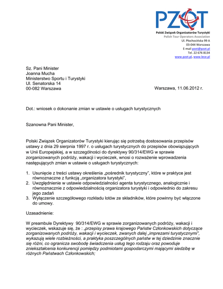 Sz. Pani Minister Joanna Mucha Ministerstwo Sportu i Turystyki Ul. Senatorska 14 00-082 Warszawa Polski Związek Organizatorów Turystyki Polish Tour Operators Association Ul. Płochocińska 99 A 03-‐044 Warszawa E-‐mail [email protected] Tel. 22 676 8134 www.pzot.pl, www.lece.pl Warszawa, 11.06.2012 r. Dot.: wniosek o dokonanie zmian w ustawie o usługach turystycznych Szanowna Pani Minister, Polski Związek Organizatorów Turystyki kierując się potrzebą dostosowania przepisów ustawy z dnia 29 sierpnia 1997 r. o usługach turystycznych do przepisów obowiązujących w Unii Europejskiej, a w szczególności do dyrektywy 90/314/EWG w sprawie zorganizowanych podróży, wakacji i wycieczek, wnosi o rozważenie wprowadzenia następujących zmian w ustawie o usługach turystycznych: 1. Usunięcie z treści ustawy określenia „pośrednik turystyczny”, które w praktyce jest równoznaczne z funkcją „organizatora turystyki”, 2. Uwzględnienie w ustawie odpowiedzialności agenta turystycznego, analogicznie i równoznacznie z odpowiedzialnością organizatora turystyki i odpowiednio do zakresu jego zadań 3. Wyłączenie szczegółowego rozkładu lotów ze składników, które powinny być włączone do umowy. Uzasadnienie: W preambule Dyrektywy 90/314/EWG w sprawie zorganizowanych podróży, wakacji i wycieczek, wskazuje się, że : „przepisy prawa krajowego Państw Członkowskich dotyczące zorganizowanych podróży, wakacji i wycieczek, zwanych dalej „imprezami turystycznymi”, wykazują wiele rozbieżności, a praktyka poszczególnych państw w tej dziedzinie znacznie się różni, co ogranicza swobodę świadczenia usług tego rodzaju oraz powoduje zniekształcenia konkurencji pomiędzy podmiotami gospodarczymi mającymi siedzibę w różnych Państwach Członkowskich; „ustanowienie wspólnych reguł dotyczących imprez turystycznych przyczyni się do usunięcia tych przeszkód i tym samym do powstania wspólnego rynku w sferze usług, umożliwiając w ten sposób podmiotom gospodarczym mającym siedzibę w jednym Państwie Członkowskim świadczenie usług w pozostałych Państwach Członkowskich, a konsumentom Wspólnoty czerpanie korzyści z porównywalnych warunków zakupu we wszystkich Państwach Członkowskich” oraz dalej “rozbieżności w przepisach chroniących konsumentów w poszczególnych Państwach Członkowskich odstraszają konsumentów z jednego Państwa Członkowskiego od dokonywania zakupu imprez turystycznych w innym Państwie Członkowskim” Ta argumentacja jednoznacznie przemawia za potrzebą wyeliminowania rozbieżności pomiędzy przepisami dyrektywy 90/314/EWG a ustawą o usługach turystycznych. Ad 1. Usunięcie z treści ustawy określenia „pośrednik turystyczny” W ustawie o usługach turystycznych wprowadzono określenie „pośrednik turystyczny”, którego sztuczny i niezrozumiały opis jest w praktyce równoznaczny z przedsiębiorcą organizującym imprezę turystyczną czyli organizatorem turystyki. W dyrektywie jako usługodawcy występują jedynie „organizator” oraz „punkt sprzedaży detalicznej”, który w naszej ustawie bardzo trafnie określono jako „agenta turystycznego”. W świetle dyrektywy, nasz „pośrednik turystyczny” jest elementem zbędnym, który tylko zaciemnia (rozmywa) status podmiotów funkcjonujących w turystyce i z tego względu powinien zostać usunięty z tekstu ustawy. Ad 2. Uwzględnienie w ustawie odpowiedzialności agenta turystycznego. W polskiej praktyce i orzecznictwie przyjęto zasadę wyłącznej odpowiedzialności organizatora turystyki za świadczenie usługi turystycznej. Uważa się, że za wszystkie etapy przygotowywania, oferowania imprezy turystycznej, jej sprzedaży, rezerwacji i realizacji odpowiada wyłącznie organizator turystyki. Zupełnie inaczej tematykę odpowiedzialności potraktowano w dyrektywie 90/314/EWG, na której powinna się przecież wzorować nasza ustawa o usługach turystycznych. W wielu przepisach dyrektywy, w których jest mowa o odpowiedzialności i/lub obowiązkach usługodawcy wobec klienta, używa się zawsze łącznie określenia ”organizator imprezy turystycznej i/lub punkt sprzedaży detalicznej”. Kilka przykładów: „ organizator imprezy turystycznej i/lub punkt sprzedaży detalicznej powinien być zobowiązany do zagwarantowania, że informacja podana w materiałach opisowych dotyczących imprezy nie wprowadza w błąd, a broszury udostępniane konsumentom zawierają wyczerpującą i rzetelną informację” (preambuła). “ organizator i/lub punkt sprzedaży detalicznej powinien być́ odpowiedzialny wobec konsumenta za właściwe wykonanie zobowiązań́ wynikających z umowy; co więcej, 2 organizator i/lub punkt sprzedaży detalicznej powinien ponosić odpowiedzialność za szkodę wyrządzoną konsumentowi z tytułu niewykonania lub niewłaściwego wykonania umowy, chyba że wadliwe wykonanie umowy nie wynika z jego winy ani z winy innego usługodawcy” (preambuła) “ jeżeli organizator i/lub punkt sprzedaży detalicznej są odpowiedzialni za niewykonanie lub niewłaściwe wykonanie usług składających się̨ na imprezę turystyczną, taka odpowiedzialność powinna być ograniczona zgodnie z konwencjami międzynarodowymi …” (preambuła) „ Przed zawarciem umowy, organizator i/lub punkt sprzedaży detalicznej udzielą konsumentowi, na piśmie lub w innej odpowiedniej formie, ogólnych informacji o wymogach paszportowych oraz wizowych…” (art. 4 ust. 1 a)) “ We właściwym czasie przed rozpoczęciem podróży organizator i/lub punkt sprzedaży detalicznej udzielą konsumentowi następujących informacji …” (art. 4 ust. 1 b) “…W takim przypadku konsument ma prawo, stosownie do okoliczności, do odszkodowania od organizatora lub punktu sprzedaży detalicznej, …” (art. 4 ust. 6 b) „ Państwa Członkowskie podejmą wszelkie niezbędne kroki w celu zapewnienia odpowiedzialności organizatora i/lub punktu spr