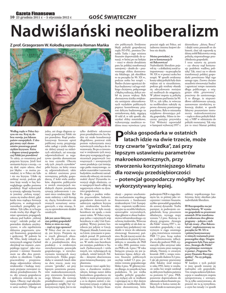10 23 grudnia 2011 r. – 5 stycznia 2012 r. GOŚĆ ŚWIĄTECZNY Nadwiślański neoliberalizm Z prof. Grzegorzem W. Kołodką rozmawia Roman Mańka Według rządu w Polsce kryzysu nie ma. Kraj się dobrze rozwija, jest liderem państw europejskich. Z drugiej strony część ekonomistów przestrzega przed ciężkim kryzysem. Która z diagnoz sytuacji gospodarczej Polski jest prawdziwa? To zależy, co rozumiemy pod pojęciem kryzysu. Jeżeli ktoś utożsamia kryzys z recesją – co się dość często zdarza, choć jest błędne – to można powiedzieć, że w Polsce nie było i nie ma kryzysu. Udało się uniknąć recesji, podczas gdy inne kraje weszły w fazę bezwzględnego spadku poziomu produkcji. Rząd wykorzystał tę sytuację, ogłaszając hucznie, że jesteśmy „zieloną wyspą”, czemu się trudno dziwić, gdyż każda inna rządząca formacja polityczna, w analogicznych warunkach postąpiłaby podobnie. Tyle tylko, że ta hucpa trwała trochę zbyt długo! Zamiast uprawiania propagandy sukcesu pod hasłem „zielonej wyspy”, należało podjąć odpowiednie działania antykryzysowe, w celu zapobieżenia dalszemu pogarszaniu sytuacji finansowej, gospodarczej i społecznej. W połowie lat . XXw., kiedy wskutek autentycznych osiągnięć Zachód okrzyknął nas mianem „europejskiego tygrysa”, jako wicepremier i minister finansów może raz albo dwa powtórzyłem to określenie. Ciężko pracowaliśmy – przeprowadzając odpowiednie reformy strukturalne i budując instytucje przyjazne rozwojowi rodzimej przedsiębiorczości. Po to, aby sytuacja gospodarcza i społeczna zmieniała się na lepsze. Obecny rząd zdecydowanie przesadził z popadaniem w samo zachwyt. Dlatego ani jedna, ani druga diagnoza sytuacji gospodarczej Polski nie jest prawdziwa. Rząd przekolorozywuje ferowane opinii publicznej oceny, przypisując sobie zasługi z tytułu relatywnie dobrej sytuacji na niektórych odcinkach, zaś zrzucając odpowiedzialność za negatywne zjawiska ekonomiczne na inne czynniki. Obecnie rolę tych „innych czynników” pełni kryzys, na który zrzuca się odpowiedzialność, także za słabości zawinione przez wewnętrzną politykę gospodarczą. Z kolei wielu analityków, ekspertów, publicystów w swoich enuncjacjach medialnych chętnie przedstawia sytuację jednostronnie i czasami nieco tendencyjnie. Być może niektórzy z nich kierują się chęcią formułowania tak zwanych scenariuszy ostrzegawczych, a więc strasząc, liczą na sprowokowanie działań zaradczych. Jaki jest zatem faktyczny stan polskiej gospodarki? Która ze stron ma rację – rząd czy jego oponenci? W Polsce choć nie ma recesji, jest kryzys. Przejawia się w trzech głównych obszarach. Po pierwsze, jeśli chodzi o przedsiębiorców, sferę produkcji – w ewidentnym niewykorzystaniu potencjału gospodarczego, w niewykorzystaniu istniejących mocy wytwórczych. Polska gospodarka w ostatnich latach idzie na dwie trzecie, może trzy czwarte ”gwizdka”, zaś przy lepszym ustawieniu parametrów makroekonomicznych, przy stworzeniu korzystniejszego klimatu dla rozwoju przedsiębiorczości – potencjał gospodarczy mógłby być wykorzystywany lepiej. Jest to nie tylko dotkliwie odczuwane przez przedsiębiorców, lecz będzie też miało konsekwencje długofalowe, ponieważ niski poziom wykorzystania mocy wytwórczych zniechęca do inwestowania. Bo po co inwestować w zwiększanie tych mocy, skoro przy występujących ograniczeniach popytowych (wewnętrznych i zewnętrznych) nawet produkcja z już istniejącego parku maszynowego, zasobów materiałów i surowców, budynków, możliwości zatrudnienia siły roboczej, nie można znaleźć zbytu? Dynamika inwestycji uległa obniżeniu, co w następnych latach odbije się negatywnym echem na dynamice gospodarczej. Po drugie, z punktu widzenia pracowników, ludności, gospodarstw domowych zasadniczym aspektem kryzysu jest strukturalne bezrobocie. Mimo że nie było recesji, bezrobocie nie spada, a może nawet rośnie. W Polsce występuje jedna z najwyższych stóp bezrobocia w całej Unii Europejskiej. Wyższy poziom bezrobocia jest jedynie w Grecji, Hiszpanii, Irlandii, Łotwie oraz na Litwie, tymczasem w pozostałych ponad państwach jest ono mniejsze niż w Polsce. W strefie euro bezrobocie jest mniejsze, podobnie w Stanach Zjednoczonych i wielu innych, tzw. wyłaniających się rynkach, wśród których Polska – skrzętnie obserwowana przez światową finansjerę – jest plasowana. Jest wreszcie trzeci aspekt kryzysu, o charakterze strukturalnym, którego nawet dobra koniunktura gospodarcza nie byłaby w stanie przezwyciężyć, a co tu dopiero mówić o niekorzystnej sytuacji, w jakiej się znajdujemy. To kryzys finan- sów publicznych. Ewidentne błędy polityki gospodarczej rządu PO-PSL, premiera Donalda Tuska i jego ministra finansów doprowadziły do sytuacji, w której po raz kolejny – trzeci w okresie dwudziestu paru lat polskiej transformacji ustrojowej – doszło do – przewrotnego efektu dostosowania fiskalnego, jak określiłem to na początku lat . XX w., podczas szoku bez terapii –. Bardzo chciano ograniczyć deficyt budżetowy i od tego wielkiego chciejstwa, połączonego z błędną realizacją, deficyt zrobił się jeszcze większy. Była alternatywna ścieżka zwiększenia umiejętnie ukierunkowanych wydatków publicznych poprzez kontrolowany przyrost deficytu budżetowego na umiarkowaną skalę, sięgającą mld zł, w taki sposób, aby uzyskać efekty mnożnikowe, wykorzystując zasadniczo rodzime moce wytwórcze i przy przecież nigdy ani Polsce, ani żadnemu innemu krajowi dobrze nie służyła. Można powiedzieć, że jest to kontynuacja linii Balcerowicza? Nadwiślański liberalizm pojawił się – a dokładniej został zaimportowany – na początku lat . XX w. w postaci szoku bez terapii. W sposób ewidentny koszty takiej polityki były dużo większe niż te nieuniknione, podczas gdy rezultaty okazały się z
