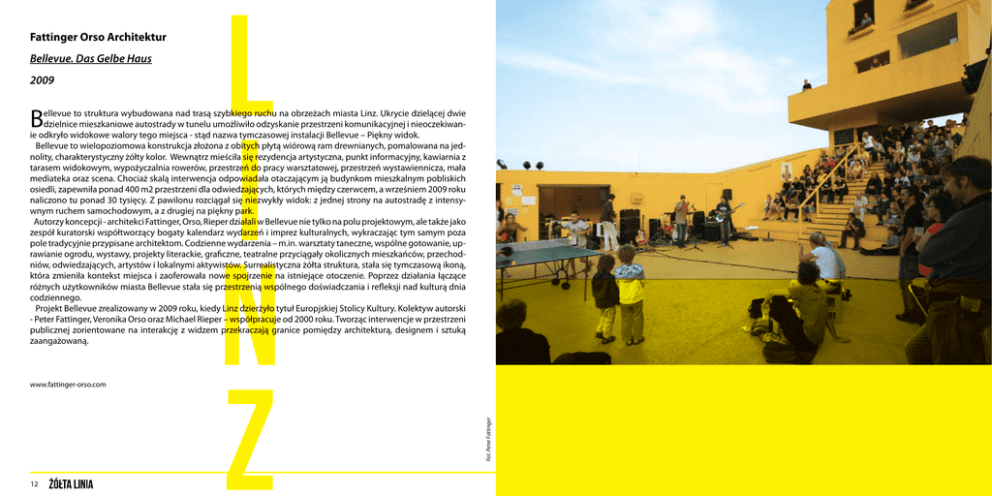 Fattinger Orso Architektur Bellevue. Das Gelbe Haus 2009 B ellevue to struktura wybudowana nad trasą szybkiego ruchu na obrzeżach miasta Linz. Ukrycie dzielącej dwie dzielnice mieszkaniowe autostrady w tunelu umożliwiło odzyskanie przestrzeni komunikacyjnej i nieoczekiwanie odkryło widokowe walory tego miejsca - stąd nazwa tymczasowej instalacji Bellevue – Piękny widok. Bellevue to wielopoziomowa konstrukcja złożona z obitych płytą wiórową ram drewnianych, pomalowana na jednolity, charakterystyczny żółty kolor. Wewnątrz mieściła się rezydencja artystyczna, punkt informacyjny, kawiarnia z tarasem widokowym, wypożyczalnia rowerów, przestrzeń do pracy warsztatowej, przestrzeń wystawiennicza, mała mediateka oraz scena. Chociaż skalą interwencja odpowiadała otaczającym ją budynkom mieszkalnym pobliskich osiedli, zapewniła ponad 400 m2 przestrzeni dla odwiedzających, których między czerwcem, a wrześniem 2009 roku naliczono tu ponad 30 tysięcy. Z pawilonu rozciągał się niezwykły widok: z jednej strony na autostradę z intensywnym ruchem samochodowym, a z drugiej na piękny park. Autorzy koncepcji - architekci Fattinger, Orso, Rieper działali w Bellevue nie tylko na polu projektowym, ale także jako zespół kuratorski współtworzący bogaty kalendarz wydarzeń i imprez kulturalnych, wykraczając tym samym poza pole tradycyjnie przypisane architektom. Codzienne wydarzenia – m.in. warsztaty taneczne, wspólne gotowanie, uprawianie ogrodu, wystawy, projekty literackie, graficzne, teatralne przyciągały okolicznych mieszkańców, przechodniów, odwiedzających, artystów i lokalnymi aktywistów. Surrealistyczna żółta struktura, stała się tymczasową ikoną, która zmieniła kontekst miejsca i zaoferowała nowe spojrzenie na istniejące otoczenie. Poprzez działania łączące różnych użytkowników miasta Bellevue stała się przestrzenią wspólnego doświadczania i refleksji nad kulturą dnia codziennego. Projekt Bellevue zrealizowany w 2009 roku, kiedy Linz dzierżyło tytuł Europjskiej Stolicy Kultury. Kolektyw autorski - Peter Fattinger, Veronika Orso oraz Michael Rieper – współpracuje od 2000 roku. Tworząc interwencje w przestrzeni publicznej zorientowane na interakcję z widzem przekraczają granice pomiędzy architekturą, designem i sztuką zaangażowaną. Fot. Peter Fattinger www.fattinger-orso.com 12 Fattinger Orso Architektur Deja-Vu. Eine Temporäre Bühne 2011 K ontynuacją projektu Bellevue stał się projekt DÉJÀ-VU Petera Fattingera i Veroniki Orso. W lipcu 2011 roku rondo Muldenstrasse nad Mühlkreisautobahn w Linz stało się miejscem tymczasowego festiwalu kultury i sztuki. W ciągu 17 dni udało się zrealizować różnorodny program, pokazujący lokalne i międzynarodowe inicjatywy kulturalne. Wyspę na środku ronda udało się przekształcić w artystyczną scenę. Przestrzenną bazę stanowiła instalacja zbudowana z ponad 7000 skrzynek. Tam znajdowała się scena, magazyny, stołówka i odbywały warsztaty. Pięćset dodatkowych skrzynek przeznaczono na czasowe modyfikacje konstrukcji, którą dostosowywano do potrzeb kolejnych wydarzeń: budowany były trybuny, platformy, wybiegi itp. Szczególnie dzieci i młodzież zaangażowały się proces budowy i tworzenia śmiałych konstrukcji. Każdego dnia lokalne i międzynarodowe instytucje kultury oraz zaproszeni artyści pokazywali swoje projekty w postaci koncertów, warsztatów, wykładów, wystaw, pokazów filmowych i spektakli. Program przyciągnął użytkowników w różnym wieku - od dzieci po seniorów. W różnych wydarzeniach związanych z DÉJÀ-VU wzięło udział ponad 8 tysięcy osób. Fot. Peter Fattinger www.fattinger-orso.com 14 Fattinger Orso Architektur Parklife 2010 P eter Fattinger próbuje realizować ideę architektury bez rozdziału na „branże”. Fascynuje go projektowanie od fazy konceptualnej do budowy. Sam jest projektantem, deweloperem i konstruktorem. Kompleksowego podejścia do projektu uczy też swoich studentów na Wydziale Architektury wiedeńskiego Uniwersytetu Technicznego. W ramach zajęć, wspólnie ze studentami realizuje projekty od szkicu do budowy. Jednym z takich projektów jest Parklife, zrealizowany na terenie osiedla mieszkaniowego – typowego blokowiska z lat 70-tych na przedmieściach Wiednia. Pawilon Parklife to rodzaj lokalnej świetlicy dla dzieci, spędzających tu czas pod okiem animatorów. Parklife zastąpić miał substandardowy drewniany barak, w którym do tej pory były prowadzone zajęcia. Nad projektem i budową pracowało 24 studentów. Wspólnie stworzyli obiekt bardzo różniący się od okolicznych żelbetowych bloków. Czerwona bryła stała się znakiem rozpoznawczym - miejscem pracy i zabawy, sceną i trybuną, obiektem pełnym uwielbianych przez dzieci zakamarków. Fot. Peter Fattinger www.design-build.at 16