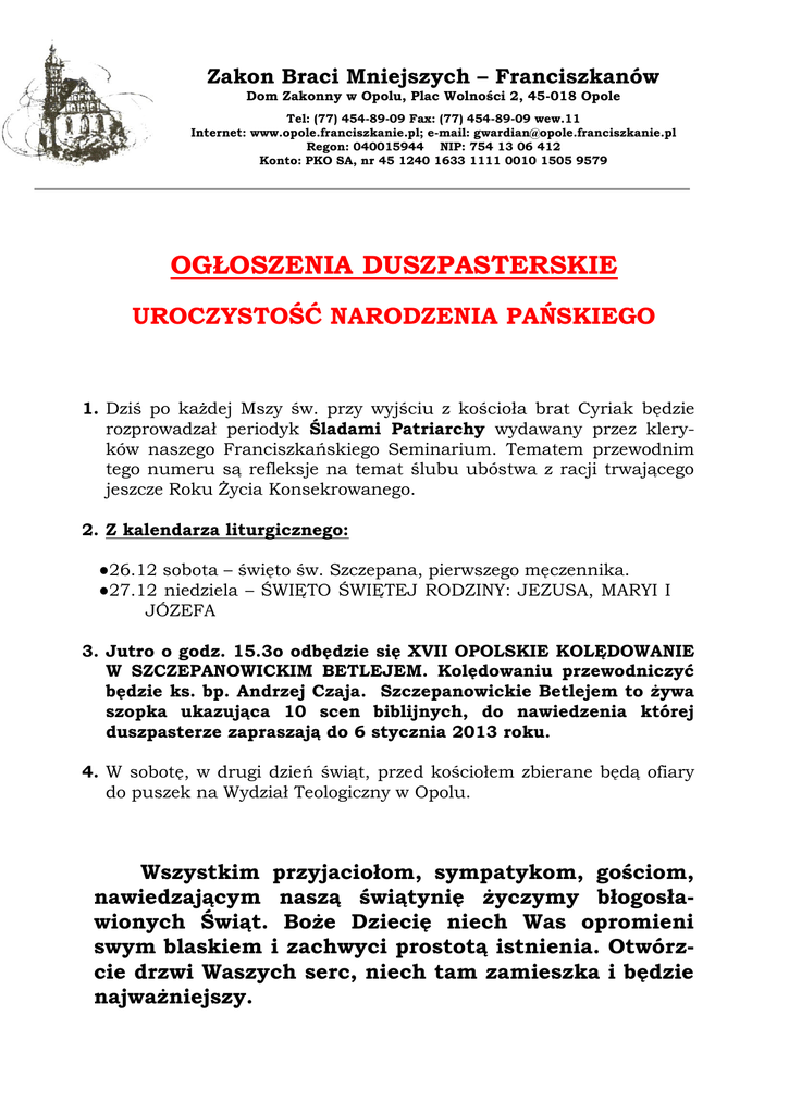 Zakon Braci Mniejszych – Franciszkanów Dom Zakonny w Opolu, Plac Wolności 2, 45-018 Opole Tel: (77) 454-89-09 Fax: (77) 454-89-09 wew.11 Internet: www.opole.franciszkanie.pl; e-mail: [email protected] Regon: 040015944 NIP: 754 13 06 412 Konto: PKO SA, nr 45 1240 1633 1111 0010 1505 9579 OGŁOSZENIA DUSZPASTERSKIE UROCZYSTOŚĆ NARODZENIA PAŃSKIEGO 1. Dziś po każdej Mszy św. przy wyjściu z kościoła brat Cyriak będzie rozprowadzał periodyk Śladami Patriarchy wydawany przez kleryków naszego Franciszkańskiego Seminarium. Tematem przewodnim tego numeru są refleksje na temat ślubu ubóstwa z racji trwającego jeszcze Roku Życia Konsekrowanego. 2. Z kalendarza liturgicznego: ●26.12 sobota – święto św. Szczepana, pierwszego męczennika. ●27.12 niedziela – ŚWIĘTO ŚWIĘTEJ RODZINY: JEZUSA, MARYI I JÓZEFA 3. Jutro o godz. 15.3o odbędzie się XVII OPOLSKIE KOLĘDOWANIE W SZCZEPANOWICKIM BETLEJEM. Kolędowaniu przewodniczyć będzie ks. bp. Andrzej Czaja. Szczepanowickie Betlejem to żywa szopka ukazująca 10 scen biblijnych, do nawiedzenia której duszpasterze zapraszają do 6 stycznia 2013 roku. 4. W sobotę, w drugi dzień świąt, przed kościołem zbierane będą ofiary do puszek na Wydział Teologiczny w Opolu. Wszystkim przyjaciołom, sympatykom, gościom, nawiedzającym naszą świątynię życzymy błogosławionych Świąt. Boże Dziecię niech Was opromieni swym blaskiem i zachwyci prostotą istnienia. Otwórzcie drzwi Waszych serc, niech tam zamieszka i będzie najważniejszy.