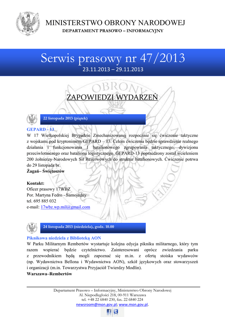 MINISTERSTWO OBRONY NARODOWEJ DEPARTAMENT PRASOWO – INFORMACYJNY Serwis prasowyWYDARZEŃ nr 47/2013 ZAPOWIEDZI 2011 23.11.2013 9– 29.11.2013 ZAPOWIEDZI WYDARZEŃ 22 listopada 2013 (piątek) GEPARD - 13 W 17 Wielkopolskiej Brygadzie Zmechanizowanej rozpocznie się ćwiczenie taktyczne z wojskami pod kryptonimem GEPARD – 13. Celem ćwiczenia będzie sprawdzenie realnego działania i funkcjonowania 1 batalionowego zgrupowania taktycznego, dywizjonu przeciwlotniczego oraz batalionu logistycznego. GEPARD-13 poprzedzony został wcieleniem 200 żołnierzy Narodowych Sił Rezerwowych do struktur batalionowych. Ćwiczenie potrwa do 29 listopada br. Żagań– Świętoszów Kontakt: Oficer prasowy 17WBZ Por. Martyna Fedro - Samojedny tel. 695 885 032 e-mail: [email protected] 24 listopada 2013 (niedziela), godz. 10.00 Piknikowa niedziela z Biblioteką AON W Parku Militarnym Rembertów wystartuje kolejna edycja pikniku militarnego, który tym razem wspierać będzie czytelnictwo. Zainteresowani oprócz zwiedzania parku z przewodnikiem będą mogli zapoznać się m.in. z ofertą stoiska wydawców (np. Wydawnictwa Bellona i Wydawnictwa AON), szkół językowych oraz stowarzyszeń i organizacji (m.in. Towarzystwa Przyjaciół Twierdzy Modlin). Warszawa–Rembertów Departament Prasowo – Informacyjny, Ministerstwo Obrony Narodowej Al. Niepodległości 218, 00-911 Warszawa tel. +48 22 6840 230, fax. 22 6840 224 [email protected]; www.mon.gov.pl. Kontakt: Rzecznik prasowy AON Magdalena ROCHNOWSKA tel. 608 023 401 e-mail: [email protected] 25-26 listopada 2013 (poniedziałek - wtorek) Dowódca Sił Zbrojnych Szwecji z wizytą w Polsce Naczelny Dowódca SZ Szwecji – generał Sverker John Olof Göranson będzie gościem szefa Sztabu Generalnego WP gen. broni Mieczysława Gocuła. Warszawa – SG WP Kontakt: Rzecznik prasowy SG WP płk Tomasz Szulejko tel. 22 6 870 807, 602 431 294 e-mail: [email protected] 27 listopada 2013 (środa) Absolwenci Royal College Defence Studies z wizytą w Sztabie Generalnym WP Spotkanie szefa Sztabu Generalnego WP gen. broni Mieczysława Gocuła z absolwentami Royal College Defence Studies. Warszawa Kontakt: Rzecznik prasowy SG WP płk Tomasz Szulejko tel. 22 6 870 807, 602 431 294 e-mail: [email protected] 27 listopada 2013 (środa), godz. 8.30 – 19.00 Międzynarodowe Mistrzostwa Uczelni Wojskowych Drużyny podchorążych i kadetów uczelni wojskowych z Europy wezmą udział w międzynarodowych mistrzostwach uczelni wojskowych. Pięcioosobowe zespoły będą konkurować podczas pokonywania wodnego toru przeszkód, biegu patrolowego na dystansie ok. 3 km połączonego ze strzelaniem z pistoletu wojskowego 9 mm ,,GLOCK” oraz strzelaniem z wykorzystaniem systemu szkolno-treningowego broni strzeleckiej ,,ŚNIEŻNIK”. Departament Prasowo – Informacyjny, Ministerstwo Obrony Narodowej Al. Niepodległości 218, 00-911 Warszawa tel. +48 22 6840 230, fax. 22 6840 224 [email protected]; www.mon.gov.pl. Więcej informacji: http://www.wso.wroc.pl/aktualnoci/zapowiedzi-wydarze/3217miedzynarodowe-mistrzostwa-uczelni-wojskowych.html Wrocław – WSO WL, ul. Czajkowskiego 109 Kontakt: Rzecznik prasowy WSOWL mjr Piotr Szczepański tel./faks: (71) 765-81-15, 601 922 784 e-mail: [email protected] 28 listopada 2013 (czwartek), godz. 16.00 Dzień Podchorążego Podsekretarz stanu w MON ds. infrastruktury Beata Oczkowicz weźmie udział w uroczystym capstrzyku z okazji dnia podchorążego, który odbędzie się w Wyższej Szkole Oficerskiej Sił Powietrznych w Dęblinie. Dęblin – WSO SP Kontakt: Rzecznik prasowy WSO SP ppłk Janusz CHOJECKI tel. 603 988 896 e-mail: [email protected] 28 listopada 2013 (czwartek) Obchody 70-lecia powstania ,,szkoły generałów” W ramach obchodów 70. rocznicy powstania Wyższej Szkoły Oficerskiej Wojsk Lądowych im. gen. Tadeusza Kościuszki odbędzie się konferencja naukowa pod tytułem ,,Historia i współczesność w służbie Ojczyzny” (godz. 10.00 – 16.00) oraz uroczysta zbiórka z okazji Dnia Podchorążego, połączona z ceremonią zamknięcia ,,Międzynarodowych Mistrzostw Uczelni Wojskowych” (godz. 18.00) Więcej informacji: http://www.wso.wroc.pl/k-wsowl-konferencja.html http://www.wso.wroc.pl/aktualnoci/z-ostatniej-chwili/3289-obchody-dnia-podchorazego.html Wrocław – WSO WL, ul. Czajkowskiego 109 Kontakt: Rzecznik prasowy WSOWL mjr Piotr Szczepański tel./faks: (71) 765-81-15, 601 922 784 e-mail: [email protected] Departament Prasowo – Informacyjny, Ministerstwo Obrony Narodowej Al. Niepodległości 218, 00-911 Warszawa tel. +48 22 6840 230, fax. 22 6840 224 [email protected]; www.mon.gov.pl. 28 listopada 2013 (czwartek), godz. 12.00 Koncert laureatów XII Ogólnopolskiego Konkursu Piosenki i Recytacji Poezji Legionowej, Żołnierskiej i Niepodległościowej Związek Piłsudczyków oraz Centralna Biblioteka Wojskowa im. marszałka Józefa Piłsudskiego zapraszają na uroczysty finał i koncert laureatów XII Ogólnopolskiego Konkursu Piosenki i Recytacji Poezji Legionowej, Żołnierskiej i Niepodległościowej. Patronat honorowy nad konkursem objęła Karolina Kaczorowska – żona ostatniego Prezydenta II Rzeczypospolitej śp. Ryszarda Kaczorowskiego. Warszawa (Centralna Biblioteka Wojskowa, ul. Ostrobramska 109) Kontakt: Związek Piłsudczyków tel. 603 849 884 e-mail: [email protected] 28 listopada 2013 (czwartek), godz. 12.00 XXII Targi Książki Historycznej Na Zamku Królewskim odbędzie się uroczyste otwarcie ,,Targów Książki Historycznej”. Podczas ich inauguracji zostaną wręczone nagrody KLIO. XXII Targi Książki Historycznej potrwają do 1 grudnia. Konferencja prasowa poświęcona targom, podczas której zostaną ogłoszone nominacje do nagrody KLIO 2013 odbędzie się 25 listopada o godz. 12:00 w Arkadach Kubickiego (sala kinowa). Więcej informacji: www.pwkh.pl Warszawa – Sala Wielka Zamku Królewskiego, pl. Zamkowy 4 Kontakt: Komisarz Targów Książki Historycznej Ewa Cieślak tel. 603 170 560 e-m