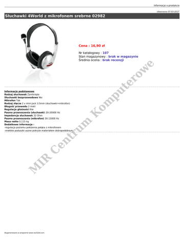 Informacje o produkcie Utworzono 07-03-2017 Słuchawki 4World z mikrofonem srebrne 02982 Cena : 16,90 zł M IR C en tr K um Informacje podstawowe Rodzaj słuchawek Zamknięte Słuchawki bezprzewodowe Nie Mikrofon Tak Rodzaj złącza 2 x mini-jack 3.5mm (słuchawki+mikrofon) Długość przewodu 2 metr Regulacja głośności Nie Pasmo przenoszenia (słuchawki) 20-20000 Hz Impedancja słuchawek 32 Ohm Pasmo przenoszenia (mikrofon) 30-15000 Hz Masa netto 0,115 kg Dodatkowe informacje : -regulacja poziomu położenia pałąka z mikrofonem -miekkie poduszki uszne pokryte materiałem skóropodobnym om pu te r ow e Nr katalogowy : 107 Stan magazynowy : brak w magazynie Średnia ocena : brak recenzji Wygenerowano w programie www.oscGold.com