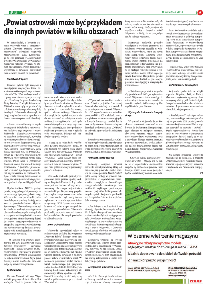 8 kwietnia 2014 „Powiat ostrowski może być przykładem dla innych powiatów w kilku obszarach” który wyznacza sobie ambitne cele, ale wie że, te cele są możliwe do zrealizowania tylko wtedy, kiedy podejmie się współpracę także z innymi – mówił Wojewoda. – Myślę, że na tym polega sztuka dobrego rządzenia. W poniedziałek, 1 kwietnia Starosta Ostrowski wraz z przedstawicielami „Telewizji aMazing Ostrów Mazowiecka” odwiedził Wojewodę Mazowieckiego Jacka Kozłowskiego w jego gabinecie w Mazowieckim Urzędzie Wojewódzkim w Warszawie. Wojewoda udzielił wywiadu, w którym opowiedział o swojej kilkuletniej współpracy z powiatem ostrowskim oraz o swoich planach na przyszłość. Rozmówca podkreślił potrzebę współpracy z władzami gminnymi i z władzami wyższego szczebla tj. władzami województwa, kraju czy nawet Unii Europejskiej. Zdaniem Wojewody powiat ostrowski dzięki budowaniu swojej strategii polegającej na jednoczesnym odpowiadaniu na potrzeby mieszkańców oraz wpisywaniu w tę strategię rozwoju regionu i rozwoju państwa, może i potrafi sięgać po środki finansowe. Dzięki temu powiat zwiększa swój budżet, a tym samym potencjał inwestycyjny z korzyścią dla mieszkańców. Inwestycje drogowe Pierwsze pytanie było związane z inwestycjami drogowymi, które powiat ostrowski otrzymał na przestrzeni ostatnich 7 lat. Wojewoda opowiedział o programie stworzonym przez rząd pn. „Narodowy Program Przebudowy Dróg Lokalnych”, dzięki któremu od 2008 roku samorządy mogą starać się o dofinansowanie na przebudowę dróg lokalnych. Wojewoda tłumaczył, że drogi te są bardzo ważne z punktu widzenia rozwoju społeczności lokalnej. - Powiat ostrowski należy do najaktywniejszych, jeśli chodzi o wykorzystanie środków z tego programu – mówił Wojewoda. - Dotacje są przyznawane na zasadach konkursowych, a projekty są oceniane przede wszystkim ze względu na kryterium bezpieczeństwa, gdyż chcemy stworzyć wzorzec dróg bezpiecznych. Jesteśmy województwem, gdzie bardzo dużo osób ginie na drogach. Cieszę się, że w powiecie ostrowskim i pan Starosta i gminy składają bardzo dobre wnioski. Dzięki temu w poprzednich latach na terenie powiatu ostrowskiego zrealizowano 7 projektów finansowanych w ramach tego programu, a na ten rok są przewidziane do realizacji 3 kolejne. Środki zostaną przeznaczone na drogę powiatową oraz dwie drogi gminne w gminach Wąsewo i Boguty Pianki. Oprócz środków z NPPDL, gminy i powiaty mogą ubiegać się o dotacje na modernizację i poprawę jakości dróg, które są zniszczone przez klęski żywiołowe lub pełnią ważną funkcję związaną z przeciwdziałaniem klęskom żywiołowym. Wojewoda wytłumaczył, że chodzi tu o drogi przebiegające w obszarach nadrzecznych, ważnych dla straży pożarnej i innych służb ratunkowych, gdyż to nimi odbywa się dojazd do wałów przeciwpowodziowych w przypadku zagrożenia powodziowego lub podejmowane są działania ewakuacyjne osób mieszkających na terenach zagrożonych powodzią. - W ramach tych środków zrealizowano też kilka projektów na terenie powiatu ostrowskiego – opowiadał Wojewoda. - Bardzo się cieszę, że dzięki harmonijnej współpracy z gminami, infrastrukturę drogową przebiegającą na całym obszarze wzdłuż Bugu, przez powiaty: łosicki, sokołowski i ostrowski, udaje się tak dobrze naprawiać. Spółki wodne Co roku Mazowiecki Urząd Wojewódzki przyznaje dotacje dla spółek wodnych. Niestety, jeszcze kilka lat temu na wielu obszarach województwa, nawet jeśli spółki istniały, działały w sposób mało efektywny. Poziom zbieranych składek był niski, a w wielu gminach i powiatach Mazowsza, spółki całkiem zniknęły. Wojewoda tłumaczył, że bez spółek wodnych nie da się utrzymać w należytym stanie melioracji szczegółowych, czyli tych najtrudniejszych – nie mogą tego zrobić ani samorządy, ani inne podmioty publiczne, ponieważ są one w rękach osób prywatnych. Dlatego tak niezbędne są spółki wodne. - Cieszę się, że także dzięki przykładowi powiatu ostrowskiego i temu, że pan Starosta też wspiera swoje spółki wodne, inne powiaty zaczęły pracować nad ożywieniem swoich spółek – mówił Wojewoda. – Teraz dotacje, które możemy przekazać na melioracje szczegółowe są z roku na rok coraz większe. W tym roku spółkom wodnym przyznamy ponad 3 miliony zł. Wojewoda pochwalił projekt przygotowany przez gminną spółkę wodną w Bogutach-Piankach. Jego zdaniem jest on bardzo ciekawy, wręcz wzorcowy dla całego województwa mazowieckiego. To pierwszy projekt, który wykorzystuje nowoczesne techniki mapowania, czyli mapę terenu wykonaną w ramach systemu informatycznego ISOK. System ten pozwala stworzyć m.in. mapę uwzględniającą ryzyko powodziowe. Wojewoda podkreślił, że powiat ostrowski może być przykładem dla innych powiatów w kilku obszarach. Inwestycje oświatowe Wojewoda opowiedział także o realizowanym od kilku lat programie „Radosna Szkoła”, którego celem jest przygotowanie szkół na przyjęcie sześciolatków. Skorzystały z niego niemal wszystkie szkoły na Mazowszu poprzez np. niewielkie dotacje na wyposażenie sal w zabawki edukacyjne lub trochę większe projekty związane z budową placów zabaw w sąsiedztwie szkół. W rozmowie poruszony został również temat zakończonego już programu „Moje Boisko - ORLIK 2012”. Program budowy boisk został zakończony, ale animatorzy, którzy opiekują się „Orlikami” i prowadzą na nich zajęcia, są nadal współfinansowani przez Urząd Wojewódzki. - W powiecie ostrowskim zrealizowano 5 takich projektów: 3 w samej Ostrowi Mazowieckiej, a pozostałe 2 na terenie powiatu – mówił Wojewoda. - W województwie mazowieckim powstało blisko 400 wielofunkcyjnych kompleksów sportowo-rekreacyjnych, z których korzystają młodzi ludzie oraz osoby dorosłe. Zawsze zachęcam dorosłych do 