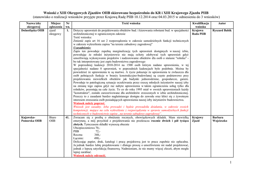 Wnioski z XIII Okręgowych Zjazdów OIIB skierowane bezpośrednio do KR i XIII Krajowego Zjazdu PIIB (stanowisko o realizacji wniosków przyjęte przez Krajową Radę PIIB 10.12.2014 oraz 04.03.2015 w odniesieniu do 3 wniosków) Nazwa izby okręgowej Dolnośląska OIIB Miejsce zgłoszenia zjazd okręgowy Nr wn. 1. KujawskoPomorska OIIB Biuro OIIB 41. Treść wniosku Dotyczy uprawnień do projektowania obiektów bud. i kierowania robotami bud. w specjalności architektonicznej w ograniczonym zakresie Treść wniosku: Zmienić zapis art 16 ust 2 rozporządzenia w zakresie samodzielnych funkcji technicznych w zakresie wykreślenia zapisu "na terenie zabudowy zagrodowej" Uzasadnienie: Zapis ten powoduje zupełną marginalizację tych uprawnień dostępnych w naszej izbie, powodując że młodzi inżynierowie nie mają ochoty zdobywać tych uprawnień gdyż umożliwiają wykonywanie projektów i nadzorowanie obiektów dla osób o statusie "rolnika" bo tak interpretowany jest zapis budownictwa zagrodowego W poprzedniej kadencji 2010-2014 na 1500 osób którym nadano uprawnienia, w tej specjalności nadano 8 uprawnień, w poprzednich kadencjach było podobnie. Można by powiedzieć że uprawnienia te są martwe. A życie pokazuje że uprawnienia te zwłaszcza dla osób pełniących funkcje w branży konstrukcyjno-budowlanej są często podstawowe przy projektowaniu niewielkich obiektów jak budynki jednorodzinne, gospodarcze, garaże. Powoduje to patologiczną sytuacje oczekiwania przez rzeszę młodych inżynierów naszej izby na zmianę tego zapisu gdyż raz nabyte uprawnienia w takim ograniczeniu usług tylko dla rolników, pozostają na całe życie. To co do roku 1995 miał w swoich uprawnieniach każdy "konstruktor", zostało zarezerwowane dla architektów zrzeszonych w izbie architektonicznej. Przeczy to z zasadami bardzo nagłaśnianego dostępu do zawodu oraz kłóci się z żywotnym interesem zrzeszania osób posiadających uprawnienia naszej izby inżynierów budownictwa. Wniosek należy poprzeć. Wniosek jest zasadny. Izba prowadzi i będzie prowadziła działania, w zakresie swoich kompetencji, mające na celu wykreślenie z rozporządzenia w sprawie samodzielnych funkcji technicznych w budownictwie zapisu „na terenie zabudowy zagrodowej”. Zwracam się z prośbą o obniżenie rocznych, obowiązkowych składek. Mam niewielką emeryturę, a mój przychód z projektowania nie przekracza rocznie dwóch i pół tysiąca złotych. Tymczasem składki wynoszą obecnie Ubezpieczeniowa 70,PIIB 72,Roczna 348,Łącznie: 490,Doliczając papier, druk, katalogi i pracę projektową jest to praca zupełnie nie opłacalna. Ja jednak bardzo lubię projektowanie i dlatego proszę o umożliwienie mi nadal projektować, jednak z lepszą satysfakcją finansową. Nadmieniam, że nie mamy więcej zleceń, abym mogła lepiej zarabiać. Wniosek należy odrzucić. Kwalifikacja wniosku Krajowa Rada PIIB Krajowy Zjazd Autor Ryszard Babik Barbara Wojcieszko 1 Wnioski z XIII Okręgowych Zjazdów OIIB skierowane bezpośrednio do KR i XIII Krajowego Zjazdu PIIB (stanowisko o realizacji wniosków przyjęte przez Krajową Radę PIIB 10.12.2014 oraz 04.03.2015 w odniesieniu do 3 wniosków) zjazd okręgowy 42. Brak jest uzasadnienia dla różnicowania opłat członkowskich w ramach jednej Izby a tym samym przenoszenia kosztów na pozostałych członków, wszyscy członkowie Izby mają takie same prawa i obowiązki. Realizacja tego wniosku stanowiłaby naruszenie zasady równości praw i obowiązków wszystkich członków Izby. Wniosek w głosowaniu jawnym odrzucony przez XIII Krajowy Zjazd PIIB Niniejszym przedkładam do rozpatrzenia wniosek w sprawie podjęcia przez XIII Okręgowy Zjazd KUP OIIB uchwały o jego przyjęciu i skierowaniu do dalszego rozpatrzenia przez XIII Krajowy Zjazd PIIB celem rozpoczęcia prac nad zmianą - uzupełnieniem Kodeksu zasad etyki zawodowej Polskiej Izby Inżynierów Budownictwa. Proponowane uzupełnienie Kodeksu zasad etyki zawodowej dotyczy treści rozdziału 7. pod nazwą: Praca w samorządzie zawodowym, o zapis dotyczący członka izby sprawującego funkcję w organie samorządu, który prowadzi postępowania wyjaśniające lub rozpatruje i orzeka w sprawach z zakresu odpowiedzialności zawodowej i dyscyplinarnej innych członków izby inżynierów budownictwa, w sytuacji, gdy sam zostanie ukarany przez sąd dyscyplinarny izby inżynierów budownictwa. W treści Kodeksu zasad etyki zawodowej, w rozdziale 7 Praca w samorządzie zawodowym, w pkt 4) cyt.: „Członek izby sprawujący funkcję w organach samorządu:” należy dodać: ppkt d) w brzmieniu: „w przypadku ukarania przez sąd dyscyplinarny, jest zobowiązany do ustąpienia z pełnionej funkcji, w szczególności gdy funkcja związana jest z prowadzeniem postępowań wyjaśniających lub rozpatrywaniem i orzekaniem w sprawach z zakresu odpowiedzialności zawodowej i dyscyplinarnej innych członków izby inżynierów budownictwa.” Uzasadnienie Istniejące zapisy „Kodeksu zasad etyki zawodowej Polskiej Izby Inżynierów Budownictwa” nie regulują zasady postępowania w stosunku do członka izby pełniącego funkcję w organie samorządu z wyboru, który zostaje ukarany przez sąd dyscyplinarny izby inżynierów budownictwa. Należy zaznaczyć, że takie sprawy zdarzają się niezwykle rzadko, a sam wniosek ma charakter typowo profilaktyczny. W sytuacji gdy osoba wchodząca w skład organu samorządu, w szczególności, gdy jest to rzecznik odpowiedzialności zawodowej lub członek sądu dyscyplinarnego, który sam zostaje ukarany przez sąd dyscyplinarny, i po ukaraniu nie składa rezygnacji, rada izby lub delegaci na zjeździe nie składają stosownego wniosku o odwołanie, to ze względu na brak regulacji prawnej postępowania w takiej sytuacji, ukarana osoba funkcyjna ma prawo w dalszym ciągu reprezentować izbę i prowadzić sprawy. W konsekwencji, utrzymywanie takiego stanu rzeczy, może doprowadzić do obniż