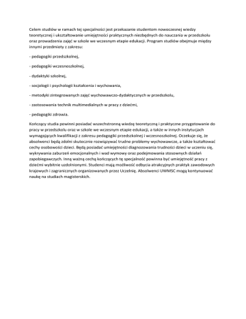 Celem studiów w ramach tej specjalności jest przekazanie studentom nowoczesnej wiedzy teoretycznej i ukształtowanie umiejętności praktycznych niezbędnych do nauczania w przedszkolu oraz prowadzenia zajęć w szkole we wczesnym etapie edukacji. Program studiów obejmuje między innymi przedmioty z zakresu: - pedagogiki przedszkolnej, - pedagogiki wczesnoszkolnej, - dydaktyki szkolnej, - socjologii i psychologii kształcenia i wychowania, - metodyki zintegrowanych zajęć wychowawczo-dydaktycznych w przedszkolu, - zastosowania technik multimedialnych w pracy z dziećmi, - pedagogiki zdrowia. Kończący studia powinni posiadać wszechstronną wiedzę teoretyczną i praktyczne przygotowanie do pracy w przedszkolu oraz w szkole we wczesnym etapie edukacji, a także w innych instytucjach wymagających kwalifikacji z zakresu pedagogiki przedszkolnej i wczesnoszkolnej. Oczekuje się, że absolwenci będą zdolni skutecznie rozwiązywać trudne problemy wychowawcze, a także kształtować cechy osobowości dzieci. Będą posiadać umiejętności diagnozowania trudności dzieci w uczeniu się, wykrywania zaburzeń emocjonalnych i wad wymowy oraz podejmowania stosownych działań zapobiegawczych. Inną ważną cechą kończących tę specjalność powinna być umiejętność pracy z dziećmi wybitnie uzdolnionymi. Studenci mają możliwość odbycia atrakcyjnych praktyk zawodowych krajowych i zagranicznych organizowanych przez Uczelnię. Absolwenci UWMSC mogą kontynuować naukę na studiach magisterskich.