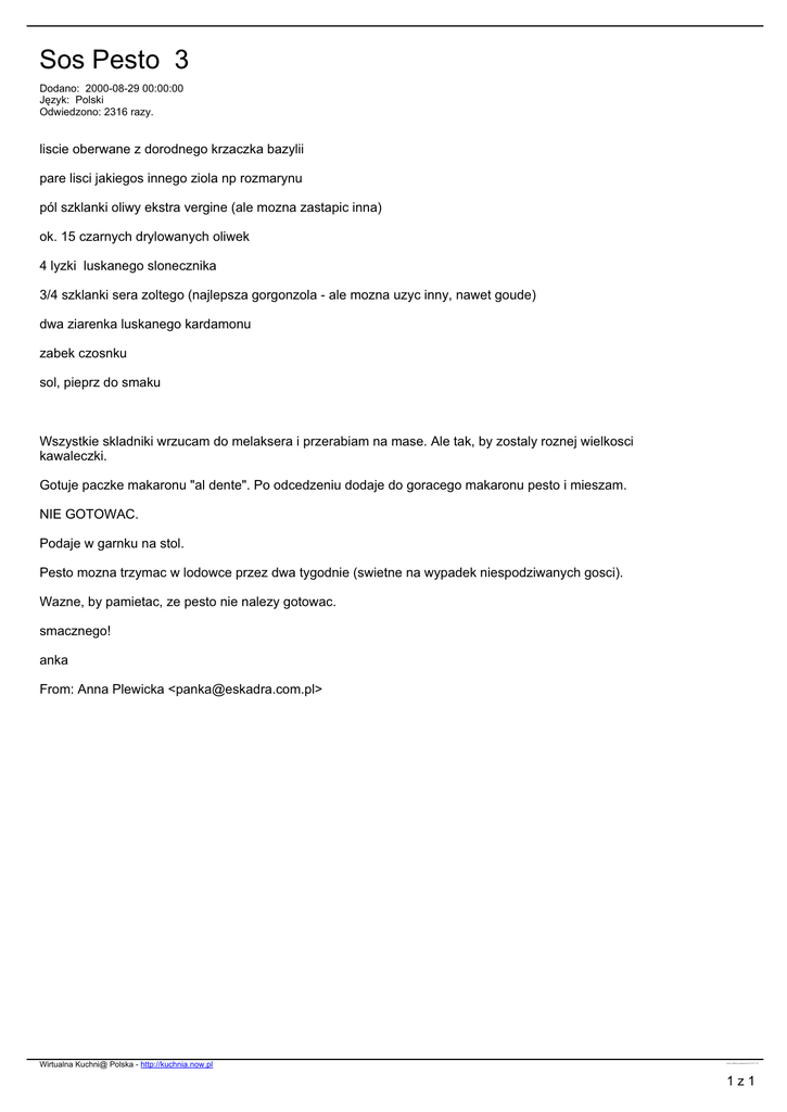 Sos Pesto 3 Dodano: 2000-08-29 00:00:00 Język: Polski Odwiedzono: 2316 razy. liscie oberwane z dorodnego krzaczka bazylii pare lisci jakiegos innego ziola np rozmarynu pól szklanki oliwy ekstra vergine (ale mozna zastapic inna) ok. 15 czarnych drylowanych oliwek 4 lyzki luskanego slonecznika 3/4 szklanki sera zoltego (najlepsza gorgonzola - ale mozna uzyc inny, nawet goude) dwa ziarenka luskanego kardamonu zabek czosnku sol, pieprz do smaku Wszystkie skladniki wrzucam do melaksera i przerabiam na mase. Ale tak, by zostaly roznej wielkosci kawaleczki. Gotuje paczke makaronu "al dente". Po odcedzeniu dodaje do goracego makaronu pesto i mieszam. NIE GOTOWAC. Podaje w garnku na stol. Pesto mozna trzymac w lodowce przez dwa tygodnie (swietne na wypadek niespodziwanych gosci). Wazne, by pamietac, ze pesto nie nalezy gotowac. smacznego! anka From: Anna Plewicka <[email protected]> Wirtualna Kuchni@ Polska - http://kuchnia.now.pl przepis nr 6868, plik wygenerowano 2017.03.07 11:26 1z1