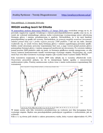 Analizy Rynkowe – Trendy Długookresowe http://analizyrynkowe.cal.pl Data publikacji: 11 listopada 2010 roku WIG20 według teorii fal Elliotta W poprzedniej analizie dotyczącej WIG20 z 27 lutego 2010 roku zwróciłem uwagę na to, że powstały negatywne sygnały świadczące o dużym prawdopodobieństwie spadku oraz na to, że rynek nie wykonał minimalnego zakresu ruchu wzrostowego wyznaczonego przez odwróconą formację głowy i ramion, przedstawioną w analizie. Stwierdziłem, że z tej racji bardziej prawdopodobne są spadki niż wzrosty. Stwierdziłem, że sytuację mogłoby uratować utrzymanie indeksu ponad linią szyi i próba wyjścia powyżej 2500 punktów. I tak też się stało, chociaż wydawało się, że rynek tworzy dużą formację głowy i ramion sygnalizującą poważne spadki. Indeks został utrzymany powyżej wspomnianej linii szyi, a jego wzrost ponad poziom głowy potencjalnej formacji głowy i ramion zanegował możliwość jej utworzenia. Po wzroście indeksu ponad poziom 2600 punktów stało się jasne, że formacja spadkowa została zanegowana, co siłą rzeczy oznacza kontynuowanie trendu wzrostowego wyższego stopnia. Przyjrzyjmy się, czym może być owa fala wzrostowa wyższego stopnia i jak wysoko może wynieść indeks WIG20. Fala wzrostowa rozpoczęta w lutym 2009 roku układa się w wyraźny elliottowski wzór. Oczywiście przyszłość pokaże, na ile ta interpretacja będzie zgodna z rzeczywistym zachowaniem rynku. Poniżej zamieszczam wykres wraz z moim rozliczeniem wspomnianej fali wzrostowej. W mojej ocenie cała fala wzrostowa przedstawiona na wykresie jest falą korygującą bessy wyższego stopnia. Będzie ona prawdopodobnie podwójnym zygzakiem z rozliczeniem, jak na wykresie. Fale a i c są równe jeśli chodzi o zakres procentowy ruchu, który wynosi odpowiednio 41,19% 1 Analizy Rynkowe – Trendy Długookresowe http://analizyrynkowe.cal.pl oraz 39,04%. Wzrost fali W wyniósł 87,51%, a cała fala W trwała 233 sesje (liczba z ciągu Fibonacciego). Fala X (łącznik) trwała 111 sesji, czyli niemal dokładnie połowę czasu trwania fali W. Kolejna fala wzrostowa Y jest obecnie budowana (tworzona jest fala a) i całość powinna być zygzakiem. Powinna również pozostawać w relacji czasowej i dystansowej do fali W. Na podstawie samego wyglądu wykresu można powiedzieć, że fala Y jest zbyt mała i trwa zbyt krótko, aby cała korekta trwająca od lutego 2009 roku mogła zostać obecnie zakończona. Na podstawie parametrów fali W można spróbować wskazać potencjalne poziomy końcowe fali Y. Poziomy dystansowe fali Y obliczone na podstawie zasięgu fali W wynoszą: 0,236: 2739,44 pkt., 0,382: 3029,53 pkt., 0,500: 3263,99 pkt., 0,618: 3498,44 pkt., 1,000: 4257,45 pkt. Zakresy czasowe siłą rzeczy są liczbami z ciągu Fibonacciego (za wyjątkiem proporcji 0,500) i wynoszą: 0,236: 55 sesji, 0,382: 89 sesji, 0,500: 117 sesji, 0,618: 144 sesje i 1,000: 233 sesje. Na podstawie powyższych wartości i wykresu można stwierdzić, że w dystansie WIG20 osiągnął pierwszy poziom (2769,26 pkt. w dniu 9 listopada br.). Zabrało mu to 92 sesje, czyli drugi poziom z zależności czasowej. Widać wyraźnie, że jak dotąd indeksowi łatwiej jest pokonywać czas, niż dystans. Oznacza to, że fala Y będzie prawdopodobnie bardziej rozciągana w czasie niż w dystansie, czyli jej zakres wzrostu będzie dążył raczej do zachowania którejś z niższych proporcji i siłą rzeczy fala Y nie będzie miała zbyt dużego zasięgu. Wierzchołka tej fali należy się jednak spodziewać na poziomach przekraczających 3000 pkt., chociaż jego osiągnięcie nie będzie szybkie: siła wzrostowa rynku nie będzie zbyt wysoka. Ważnym czynnikiem wpływającym na kształtowanie się indeksu będzie kanał wzrostowy widoczny na wykresie oraz linia szyi odwróconej formacji głowy i ramion. Istnienie kanału wzrostowego potwierdza założenie, że fala Y będzie dążyć do wydłużania w czasie, a nie w dystansie. Górna linia kanału przebiega obecnie w okolicach 2900 punktów. W analizie z 12 stycznia 2010 roku napisałem o istnieniu horyzontalnej strefy oporu w przedziale od około 2380 do około 2750 punktów. Od tamtej pory indeks mozolnie zmiękczał tę strefę i obecnie dotarł do jej górnego ograniczenia. Jego przebicie w górę oznacza wejście w kolejną strefę horyzontalnego oporu rozciągającą się od około 2750 do około 3120 punktów. To również sygnalizuje, że ruch w górę będzie powolny. Być może ta druga strefa będzie miejscem, gdzie zakończy się fala Y. W mojej ocenie pomimo wielu przesłanek do kontynuowania dalszych wzrostów należy zachować czujność, ponieważ WIG20 zbliża się z każdą sesją do zakończenia wzrostowej fali wyższego stopnia. O ile sytuacja na rynkach nie zmieni się w gwałtowny sposób, zakończenia tej fali spodziewam się najdalej w okolicach lutego – marca 2011 roku. Kazimierz Ożóg 2