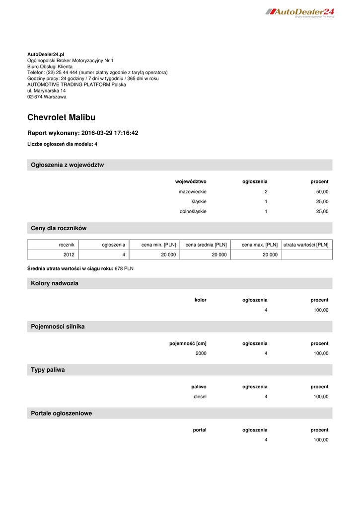 AutoDealer24.pl Ogólnopolski Broker Motoryzacyjny Nr 1 Biuro Obsługi Klienta Telefon: (22) 25 44 444 (numer płatny zgodnie z taryfą operatora) Godziny pracy: 24 godziny / 7 dni w tygodniu / 365 dni w roku AUTOMOTIVE TRADING PLATFORM Polska ul. Marynarska 14 02-674 Warszawa Chevrolet Malibu Raport wykonany: 2016-03-29 17:16:42 Liczba ogłoszeń dla modelu: 4 Ogłoszenia z województw województwo ogłoszenia procent mazowieckie 2 50,00 śląskie 1 25,00 dolnośląskie 1 25,00 Ceny dla roczników rocznik ogłoszenia cena min. [PLN] cena średnia [PLN] cena max. [PLN] 2012 4 20 000 20 000 20 000 utrata wartości [PLN] Średnia utrata wartości w ciągu roku: 678 PLN Kolory nadwozia kolor ogłoszenia procent 4 100,00 pojemność [cm] ogłoszenia procent 2000 4 100,00 paliwo ogłoszenia procent diesel 4 100,00 portal ogłoszenia procent 4 100,00 Pojemności silnika Typy paliwa Portale ogłoszeniowe Powered by TCPDF (www.tcpdf.org)