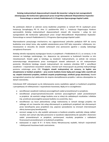 Katalog maksymalnych dopuszczalnych stawek dla towarów i usług (w tym wynagrodzeo) obowiązujący dla konkursów ogłaszanych przez Urząd Marszałkowski Województwa KujawskoPomorskiego w ramach Poddziałania 8.1.3 Programu Operacyjnego Kapitał Ludzki. Na podstawie Zaleceo w zakresie oceny budżetów projektów w ramach PO KL wydanych przez Instytucję Zarządzającą PO KL dnia 11 października 2012 r., Instytucja Organizująca Konkurs wprowadziła Katalog maksymalnych dopuszczalnych stawek dla towarów i usług (w tym wynagrodzeo) dla konkursów ogłaszanych przez Urząd Marszałkowski Województwa KujawskoPomorskiego w ramach Poddziałania 8.1.3 Programu Operacyjnego Kapitał Ludzki . Wprowadzenie powyższego mechanizmu ma zagwarantowad jednolite podejście KOP do oceny budżetów oraz służyd temu, aby wydatki zatwierdzone przez KOP były racjonalne i efektywne, tzn. niezawyżone w stosunku do stawek rynkowych oraz ponoszone zgodnie z zasadą należytego zarządzania finansami. Katalog określa najczęściej występujące koszty w projektach z Poddziałania 8.1.3, co oznacza, iż nie stanowi on katalogu zamkniętego, tzn. dopuszcza się ujmowanie w budżetach kosztów w nim niewskazanych. Stawki ujęte w katalogu są stawkami maksymalnymi, co jednak nie oznacza automatycznego akceptowania przez oceniających stawek założonych na ich maksymalnym poziomie. Określenie katalogu stawek maksymalnych nie zwalania członków KOP z weryfikacji zasadności i racjonalności wszystkich stawek, również tych mieszczących się poniżej maksymalnego poziomu ustalonego przez IOK. Przyjęcie stawki maksymalnej nie oznacza, że będzie ona akceptowana w każdym projekcie – przy ocenie budżetu brane będą pod uwagę takie czynniki jak np. stopieo złożoności projektu, wielkośd zespołu projektowego, wielkośd grupy docelowej. Stawki wynagrodzeo powinny byd adekwatne do stopnia skomplikowania projektu i zakresu obowiązków na danym stanowisku. Członkowie KOP zobowiązani są do dokonywania oceny wydatków ujętych w budżetach projektów z perspektywy ich efektywności i racjonalności kosztowej. Będą oni w szczególności: weryfikowad zasadnośd realizacji poszczególnych zadao przewidzianych w projekcie; weryfikowad proporcjonalnośd/stosunek wartości poszczególnych zadao przewidzianych w projekcie do wartości całego budżetu oraz w relacji do zakładanych rezultatów i efektów (np. przeliczad poszczególne pozycje budżetu na uczestnika, itp.); weryfikowad czy koszt jednostkowy usługi realizowanej w ramach danego projektu nie odbiega od cen towarów lub usług oferowanych w podobnych projektach lub oferowanych przez beneficjanta poza projektem (np. poprzez sprawdzenie na stronach internetowych oferty komercyjnej beneficjenta); zwracad uwagę na to, aby wydatki ujmowane w budżecie projektu spełniały relację nakładrezultat, tym samym aby były ponoszone w wysokości odpowiedniej do specyfiki i złożoności zadao przewidzianych w projekcie, porównywad rezultaty projektów z nakładami finansowymi przewidzianymi w budżetach projektów; wykazywad w części B IV i D Karty Oceny Merytorycznej wydatki, których racjonalnośd i efektywnośd kosztowa budzi zastrzeżenia. IOK przypomina również, iż - zgodnie z obowiązującymi Zasadami dokonywania wyboru projektów w ramach POKL - zidentyfikowanie przez oceniającego wydatków niekwalifikowalnych (niespełniających zasad kwalifikowalności określonych w Wytycznych w zakresie kwalifikowania wydatków w ramach PO KL, w szczególności niezgodnych ze stawkami rynkowymi, dotyczy to również sytuacji, gdy łączna wartośd usług / towarów uwzględnionych w budżecie projektu lub całą wartośd projektu jest zawyżona w stosunku do stawek rynkowych) i/lub zbędnych z punktu widzenia realizacji projektu w maksymalnej wysokości do 25% wartości projektu skutkuje odpowiednim zmniejszeniem liczby punktów przyznawanych w kategorii oceny IV Wydatki projektu zawartej w części B. Karty oceny merytorycznej. Zidentyfikowanie przez oceniającego wydatków niekwalifikowalnych i/lub zbędnych z punktu widzenia realizacji projektu w wysokości przewyższającej 25% wartości projektu skutkuje negatywną oceną budżetu projektu. Nazwa kosztu Jednostka Maksymalny dopuszczalny koszt (w złotych brutto) Zadania merytoryczne Przygotowanie i przeprowadzenie seminarium informacyjnych/wykładu stawka wykładowcy (np. idea społecznej odpowiedzialności biznesu, aspekty dialogu społecznego w przedsiebiorsdtwach itp.) godzina* 200 Nocleg osoba/sztuka 150 Wynajem sal konferencyjnych (ponad 250 osób, dzieo - powyżej 4 h) dzieo 3 000 Wynajem sal szkoleniowych (dzieo = 8godzin) dzieo 500 Wyżywienie (obiad +serwis kawowy) osoba 40 Materiały szkoleniowe (zestaw: teczka, notes,długopis) zestaw 20 Cross - financing Urządzenie wielofunkcyjne na potrzeby realizacji zadao merytorycznych sztuka 5000 Urządzenie wielofunkcyjne na potrzeby zarządzania sztuka 1 500 Rzutnik Ekran sztuka sztuka 3 000 600 Tablica interaktywna z projektorem sztuka 8 000 Laptop z oprogramowaniem (rozumiane jako system operacyjny oraz oprogramowanie typu MS Office) sztuka 3 000 Zarządzanie Koordynator projektu umowa o pracę - 1 etat miesiąc 6 000 umowa cywilnoprawna godzina 40 umowa o pracę - 1 etat miesiąc 5 500 umowa cywilnoprawna godzina 35 Zakup usługi zarządzania projektem - usługa kompleksowa, bez żadnych dodatkowych kosztów personelu miesiąc 9 500 Rachunek bankowy miesiąc 50 Stworzenie strony internetowej usługa 1 500 Ogłoszenie w prasie sztuka 1 500 Projekt i wydruk ulotek (format A5, dwustronne, kolorowe; cena za sztukę przy zamówieniu 100 sztuk) sztuka 1,20 Projekt i wydruk plakatów (format A3; cena za sztukę przy zamówieniu 100 sztuk) sztuka 3 Roll-up (100 cm x 200 cm) sztuka 350 Projekt i wydruk zaproszenia na konferencję sztuka 3,5 Wydruk katalogów/folderów (format A5; do stron; na za sztukę przy zamówieniu 500 sztuk) sztuka 3 Wydruk,