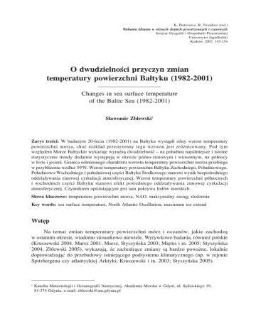 K. Piotrowicz, R. Twardosz (red.) Wahania klimatu w różnych skalach przestrzennych i czasowych Instytut Geografii i Gospodarki Przestrzennej Uniwersytet Jagielloński Kraków, 2007, 145-154 O dwudzielności przyczyn zmian temperatury powierzchni Bałtyku (1982-2001) Changes in sea surface temperature of the Baltic Sea (1982-2001) Sławomir Zblewski1 Zarys treści: W badanym 20-leciu (1982-2001) na Bałtyku wystąpił silny wzrost temperatury powierzchni morza, choć rozkład przestrzenny tego wzrostu jest zróżnicowany. Pod tym względem Morze Bałtyckie wykazuje wyraźną dwudzielność – na południu najsilniejsze i istotne statystycznie trendy dodatnie występują w okresie późno-zimowym i wiosennym, na północy w lecie i jesieni. Granica odmiennego charakteru wzrostu temperatury powierzchni morza przebiega w przybliżeniu wzdłuż 59oN. Wzrost temperatury powierzchni Bałtyku Zachodniego, Południowego, Południowo-Wschodniego i południowej części Bałtyku Środkowego stanowi wynik bezpośredniego oddziaływania zimowej cyrkulacji atmosferycznej. Wzrost temperatury powierzchni północnych i wschodnich części Bałtyku stanowi efekt pośredniego oddziaływania zimowej cyrkulacji atmosferycznej. Czynnikiem opóźniającym jest tam pokrywa lodów morskich. Słowa kluczowe: temperatura powierzchni morza, NAO, maksymalny zasięg zlodzenia Key words: sea surface temperature, North Atlantic Oscillation, maximum ice extend Wstęp Na temat zmian temperatury powierzchni mórz i oceanów, jakie zachodzą w ostatnim okresie, wiadomo stosunkowo niewiele. Wyrywkowe badania, również polskie (Kruszewski 2004, Marsz 2001; Marsz, Styszyńska 2003; Miętus i in. 2005; Styszyńska 2004, Zblewski 2005), wykazują, że zachodzące zmiany są bardzo poważne, lokalnie doprowadzając do przebudowy istniejącego podsystemu klimatycznego (np. w rejonie Spitsbergenu czy atlantyckiej Arktyki; Kruszewski i in. 2003; Styszyńska 2005). 1 Katedra Meteorologii i Oceanografii Nautycznej, Akademia Morska w Gdyni, ul. Sędzickiego 19, 81-374 Gdynia, e-mail: [email protected] Sławomir Zblewski Przeprowadzona wcześniej przez autora analiza trendów temperatury powierzchni morza (dalej TPM) wykazała, że w badanym okresie (1982-2001) na całym obszarze Bałtyku zaznaczyły się dodatnie trendy TPM (od poniżej 0,050 do ponad 0,180oC/rok); na większości powierzchni są one istotne statystycznie. W badanym 20-leciu temperatura wód południowej części Bałtyku wzrosła od 1,0 do 2,0oC, a północnej części morza wzrosła od 2,0 do 3,5oC. W przekroju rocznym najsilniejsze trendy wystąpiły w północnej i wschodniej części Bałtyku (Zatoka Botnicka, Zatoka Fińska) w okresie lata i jesieni (0,1 do 0,4oC/rok), a na obszarze Bałtyku Południowego i Zachodniego – w końcu zimy i wiosną (luty-maj) – od 0,05 do 0,12oC/rok. Analiza trendów wykazała, że pod względem rozkładu przestrzennego wzrostu temperatury powierzchni wody Morze Bałtyckie wykazuje wyraźną dwudzielność. Granica odmiennego charakteru wzrostu temperatury powierzchni morza przebiega w przybliżeniu wzdłuż 59oN. Przeprowadzona analiza skupień (metodą grupowania Warda) przebiegów miesięcznych i rocznych wartości TPM uwidoczniła również wystąpienie wyraźnego porządku przestrzennego w kształtowaniu się zmienności temperatury powierzchni wody. Wykazała, że na obszarze Bałtyku zaznaczają się dwa obszary o odmiennym typie zmienności temperatury wody – południowy i północny. Granica między tymi obszarami przebiega średnio wzdłuż 59oN, wykazując niewielkie przesunięcia sezonowe. Wyniki przeprowadzonych do tej pory badań zmian temperatury powierzchni wody Morza Bałtyckiego stawiają problem – co jest przyczyną tak silnego wzrostu temperatury powierzchni morza oraz jego odmiennego charakteru w części północnej i południowej? Materiały W badaniach posłużono się jednorodnymi ciągami temperatury powierzchni morza, pochodzącymi ze zbioru NOAA OI SST v.1. (The National Oceanic and Atmospheric Administration, Optimum Interpolation Sea Surface Temperature, version 1), udostępnionymi przez Climate Diagnostic Center, Boulder, Colorado, USA. Są to odpowiednio przetworzone i kalibrowane dane satelitarne, które charakteryzują zachowanie się temperatury powierzchni morza na otwartej przestrzeni, nie zaś w strefie wód przybrzeżnych (zatok, zalewów, wód portowych itp.). Wartości te, według R.W. Reynoldsa i T.M. Smitha (1994), są równoważne pomiarom in situ. Oryginalny zbiór zawiera miesięczne wartości TPM dla gridów o rozdzielczości 1ox1o i obejmuje dane od listopada 1981 r. do czerwca 2003 r. Pełna charakterystyka oraz metoda opracowania zbioru została omówiona w pracy R.W. Reynoldsa i T.M. Smitha (1994). Do celów analizy wykorzystano 20-lecie od stycznia 1982 do grudnia 2001 r. Średnie miesięczne wartości temperatury powietrza ze stacji Visby, wykorzystane w opracowaniu, pochodzą z bazy danych Nordklim. Dane o maksymalnej wielkości zlodzenia Bałtyku (Maximum Ice Extent) pochodzą z pracy A. Seiny i E. Palosuo (1996). Ciąg ten uzupełniono o wartości publikowane przez Fińską Służbę Hydrologiczną (Finnish Ice Service – Finnish Institute of Marine Research, Helsinki). 146 Przyczyny zmian temperatury powierzchni Bałtyku Czynniki kształtujące temperaturę powierzchni morza Temperatura powierzchni morza kształtuje się w procesie wymiany ciepła między morzem i atmosferą. Ogrzewanie górnej warstwy morza i magazynowanie ciepła w wodzie zależy od pochłoniętej energii promieniowania słonecznego. Zmienność międzyroczną dopływu energii słonecznej do powierzchni Ziemi wprowadzają czynniki klimatyczne – głównie zmiany przezroczystości atmosfery oraz zachmurzenie. Wpływ na kształtowanie temperatury wody, oprócz strumienia pochłoniętej energii promieniowania słonecznego, mają także strumienie energii powodujące straty ciepła w morzu. Najwi