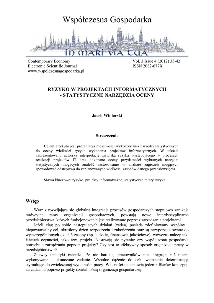 Współczesna Gospodarka Contemporary Economy Electronic Scientific Journal www.wspolczesnagospodarka.pl Vol. 3 Issue 4 (2012) 35-42 ISSN 2082-677X RYZYKO W PROJEKTACH INFORMATYCZNYCH - STATYSTYCZNE NARZĘDZIA OCENY Jacek Winiarski Streszczenie Celem artykułu jest prezentacja możliwości wykorzystania narzędzi statystycznych do oceny wielkości ryzyka wykonania projektów informatycznych. W tekście zaprezentowano autorską interpretację zjawiska ryzyka występującego w procesach realizacji projektów IT oraz dokonano oceny przydatności wybranych narzędzi statystycznych mogących znaleźć zastosowanie w analizie zagrożeń mogących spowodować odstępstwa do zaplanowanych wielkości zasobów danego przedsięwzięcia. Słowa kluczowe: ryzyko, projekty informatyczne, statystyczne miary ryzyka. Wstęp Wraz z rozwijającą się globalną integracją procesów gospodarczych stopniowo zanikają tradycyjne ramy organizacji gospodarczych, powstają nowe interdyscyplinarne przedsiębiorstwa, których funkcjonowanie jest realizowane poprzez zarzadzania projektami. Jeżeli ciąg po sobie następujących działań (zadań) posiada zdefiniowany wspólny i niepowtarzalny cel, określony dzień rozpoczęcia i zakończenia oraz są przyporządkowane do wyszczególnionych działań zasoby (np. ludzkie, finansowe, jakościowe), wówczas należy taki łańcuch czynności, jako tzw. projekt. Nasuwają się pytania: czy współczesna gospodarka potrzebuje zarządzania poprzez projekty? Czy jest to efektywny sposób organizacji pracy w przedsiębiorstwie? Znawcy tematyki twierdzą, że nic bardziej pracowników nie integruje, niż razem wykonywane i ukończone zadanie. Wspólne dążenie do celu wzmacnia determinację, stymulując do zwiększonej wydajności pracy. Własności te stanowią jeden z filarów koncepcji zarządzania poprzez projekty działalnością organizacji gospodarczej. 36 Jacek Winiarski 1. Ryzyko w przedsięwzięciach gospodarczych Projekt to zbiór czynności (zadań) i, które: są ze sobą powiązane, zmierzają do osiągnięcia określonego celu, posiadają zaplanowany początek i koniec. Każdy projekt jest zdefiniowany przez produkt końcowy (zakres), czas i koszty realizacji. W przeciwieństwie do procesu, projekt wykonuje się tylko raz1. Zarządzanie projektem to zbiór czynności ukierunkowanych na osiągnięcie wyznaczonych celów przy założonym czasie i budżecie. Jest to nauka o utrzymywaniu ryzyka niepowodzenia przedsięwzięcia na możliwie niskim poziomie w całym cyklu życia projektu. Na przebieg każdego zadania i wchodzącego w skład projektu może wpływać wiele czynników powodujących, że podczas jego wykonania nie będą zachowane planowane wielkości czasu, budżetu, zakresu czy też jakości. Przyjmuje się, że projekt jest zbiorem zadań o liczebności skończonej i policzalnej. Zadań wchodzących w skład projektu jest n, gdzie i ∈ (1, ... n ) . Liczba zdarzeń mogących spowodować zmiany wielkości planowanych jest praktycznie nieograniczona. W rzeczywistości trudno poddać szczegółowej analizie wpływ wszystkich możliwych zakłóceń na realizację planowanych zadań. Ale też nie ma potrzeby zajmowania się zdarzeniami, które albo mogą mieć nieistotny wpływ na przebieg realizacji projektu albo ich prawdopodobieństwo wystąpienia jest na tyle małe, że można je przyjąć (z akceptowalnie dużym przybliżeniem) za niemożliwe do zaistnienia. Na potrzeby badań związanych z zarządzaniem ryzykiem w projektach przyjmuje się, że liczba zdarzeń mogących spowodować istotne odstępstwa od ustalonych planów jest policzalna i skończona. Każde z tych zdarzeń zostanie oznaczone jako j, a liczba ich w całym projekcie wynosi m. Listę zdarzeń j ∈ (1, ... m) , których zaistnienie może wywołać odstępstwa od planowanych wielkości przedsięwzięcia ustalają najczęściej eksperci w konsultacji z menedżerami i bezpośrednimi wykonawcami projektu. Zdarzenia jako akcje mogące zakłócić realizację zadania i charakteryzują się następującymi elementami: – źródło (lub źródła) - przyczyny zaistnienia możliwych zdarzeń obciążonych ryzykiem, – oddziaływanie na przebieg projektu: – potencjalny wpływ, wyrażany najczęściej w wielkościach opisowych chrakteryzujący co może zmienić materializacja danego zagrożenia, – skutki (wyrażane w wielkościach wymiernych np. finansowych czy też terminowych), wielkość oddziaływania zdarzenia na przebieg projektu zmienia się w czasie i zależy np. od stopnia zaawansowania przedsięwzięcia czy też od zmieniających się warunków wewnętrznych i zewnętrznych samego projektu jak i organizacji go wykonującej, – prawdopodobieństwo wystąpienia, (jest stałe lub zmieniające się w czasie), – czas: – występowania w stanie niewpływającym na proces realizacji przedsięwzięcia (wielkość opcjonalna), – czas wystąpienia (data, godzina), – czas oddziaływania, – czas konieczny na reakcję czy też likwidację ewentualnych szkód, – symptomy (objawy) - zmienne, które należy obserwować, (monitorować) ich zmiana powyżej akceptowalnego poziomu wiąże się z koniecznością reakcji na: – zbliżające się zdarzenie, (np. zagrożenie - konieczność prewencji), – zaistniałe zdarzenie. 1 M. Pańkowska, Zarządzanie zasobami informatycznymi, Difin, Warszawa 2001 Ryzyko w projektach informatycznych – statystyczne narzędzia oceny 37 – wyzwalacze - poziomy wielkości objawów, po przekroczeniu których należy podjąć działania (np. prewencyjne lub ratunkowe), – pilność reakcji na zbliżające się bądź zaistniałe zdarzenie. Na potrzeby prezentowanego artykułu nie ma konieczności określenia, które zdarzenie j (jedno lub więcej) może mieć mierzalny wpływ na zadanie projektowe i. Oczywistym jest, że w projekcie może istnieć zadanie i, na które nie ma istotnego wpływu żadne z zagrożeń j, czy też istnieje zadanie i na kt