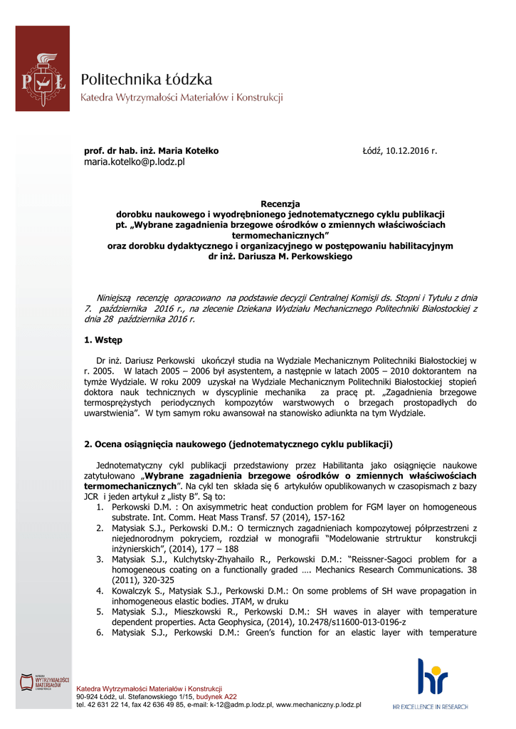 prof. dr hab. inż. Maria Kotełko [email protected] Łódź, 10.12.2016 r. Recenzja dorobku naukowego i wyodrębnionego jednotematycznego cyklu publikacji pt. „Wybrane zagadnienia brzegowe ośrodków o zmiennych właściwościach termomechanicznych” oraz dorobku dydaktycznego i organizacyjnego w postępowaniu habilitacyjnym dr inż. Dariusza M. Perkowskiego Niniejszą recenzję opracowano na podstawie decyzji Centralnej Komisji ds. Stopni i Tytułu z dnia 7. października 2016 r., na zlecenie Dziekana Wydziału Mechanicznego Politechniki Białostockiej z dnia 28 października 2016 r. 1. Wstęp Dr inż. Dariusz Perkowski ukończył studia na Wydziale Mechanicznym Politechniki Białostockiej w r. 2005. W latach 2005 – 2006 był asystentem, a następnie w latach 2005 – 2010 doktorantem na tymże Wydziale. W roku 2009 uzyskał na Wydziale Mechanicznym Politechniki Białostockiej stopień doktora nauk technicznych w dyscyplinie mechanika za pracę pt. „Zagadnienia brzegowe termosprężystych periodycznych kompozytów warstwowych o brzegach prostopadłych do uwarstwienia”. W tym samym roku awansował na stanowisko adiunkta na tym Wydziale. 2. Ocena osiągnięcia naukowego (jednotematycznego cyklu publikacji) Jednotematyczny cykl publikacji przedstawiony przez Habilitanta jako osiągnięcie naukowe zatytułowano „Wybrane zagadnienia brzegowe ośrodków o zmiennych właściwościach termomechanicznych”. Na cykl ten składa się 6 artykułów opublikowanych w czasopismach z bazy JCR i jeden artykuł z „listy B”. Są to: 1. Perkowski D.M. : On axisymmetric heat conduction problem for FGM layer on homogeneous substrate. Int. Comm. Heat Mass Transf. 57 (2014), 157-162 2. Matysiak S.J., Perkowski D.M.: O termicznych zagadnieniach kompozytowej półprzestrzeni z niejednorodnym pokryciem, rozdział w monografii “Modelowanie strtruktur konstrukcji inżynierskich”, (2014), 177 – 188 3. Matysiak S.J., Kulchytsky-Zhyahailo R., Perkowski D.M.: “Reissner-Sagoci problem for a homogeneous coating on a functionally graded …. Mechanics Research Communications. 38 (2011), 320-325 4. Kowalczyk S., Matysiak S.J., Perkowski D.M.: On some problems of SH wave propagation in inhomogeneous elastic bodies. JTAM, w druku 5. Matysiak S.J., Mieszkowski R., Perkowski D.M.: SH waves in alayer with temperature dependent properties. Acta Geophysica, (2014), 10.2478/s11600-013-0196-z 6. Matysiak S.J., Perkowski D.M.: Green’s function for an elastic layer with temperature Katedra Wytrzymałości Materiałów i Konstrukcji 90-924 Łódź, ul. Stefanowskiego 1/15, budynek A22 tel. 42 631 22 14, fax 42 636 49 85, e-mail: [email protected], www.mechaniczny.p.lodz.pl dependent properties. Materials Science. 48/5 (2013), 607-613 7. Kulchytsky-Zhyahailo R., Matysiak S.J., Perkowski D.M.: On axisymmetrical problem of layer with temperature dependent properties. Mechanics Research Communications. 50 (2013), 7176 Dr inż. Dariusz Perkowski jest autorem jednej (pozycja 1.) i współautorem pozostałych 6-ciu artykułów z powyższego cyklu publikacji. Zgodnie z oświadczeniami współautorów udział Habilitanta jest znaczący i wynosi 50% w pozycjach 2 – 7. Nowoczesne materiały kompozytowe o funkcjonalnej gradacji własności mechanicznych (FGM) są coraz szerzej stosowane we współczesnej inżynierii, m.in. jako pokrycia, poprawiające własności trybologiczne powierzchni ślizgowych, a także w innych rozwiązaniach konstrukcyjnych i technologicznych. Aktualnie stosowane są dwa podstawowe rodzaje materiałów FGM: z ciągłą lub skokową zmiana własności mechanicznych materiału. Również materiały jednorodne strukturalnie mogą charakteryzować się zmiennymi własnościami termomechanicznymi, spowodowanymi np. oddziaływaniem pola temperatur. W obu przypadkach jednym z podstawowych zagadnień teoretycznych , które należy rozwiązać na gruncie mechaniki ciała stałego jest zagadnienie brzegowe warstwy gradientowej, o własnościach termomechanicznych zmiennych względem normalnej do powierzchni środkowej warstwy, spoczywającej na jednorodnym lub mikroperiodycznym podłożu. Rozwiązanie tak postawionego zagadnienia prowadzi do określenia stanu przemieszczeń i naprężeń w warstwie przejściowej i na powierzchni kontaktu, co pozwala na szacowanie wytrzymałości takich ośrodków. Z przedstawionego przez Habilitanta w autoreferacie stanu wiedzy w tym obszarze (popartego bardzo obszerną bibliografią) oraz z bibliografii podanej w artykułach, składających się na cykl monotematyczny, wynika, że dotychczas opracowane rozwiązania analityczne dotyczyły głównie zagadnień dwuwymiarowych, w znacznie mniejszym stopniu zagadnień osiowo-symetrycznych. W przypadku ośrodków z własnościami termomechanicznymi zależnymi od temperatury były to głównie rozwiązania zagadnień jednowymiarowych. Niewiele jest prac dotyczących propagacji fali naprężeń w takich ośrodkach. W badaniach , których wyniki opublikowano w cyklu monotematycznym, Habilitant skupił się na zagadnieniu brzegowym , osiowo-symetrycznym, rozpatrując różne konfiguracje warstw o różnych własnościach termomechanicznych, spoczywających na gradientowym (mikroperiodycznym) lub jednorodnym podłożu (półprzestrzeni), przy uwzględnieniu działania obciążeń mechanicznych, pola temperatury lub strumienia ciepła. Cykl jest tematycznie spójny. Wszystkie przedstawione rozwiązania oparte są na równaniach różniczkowych cząstkowych termosprężystości (równaniach równowagi lub ogólniej – ruchu) wyrażonych w składowych stanu naprężenia. Równania te we wszystkich pracach rozwiązane są metodami analitycznymi. Habilitant rozwiązał zagadnienie przewodnictwa cieplnego w polu temperatur i pod działaniem strumienia ciepła w niejednorodnej warstwie FGM o zmiennym od temperatury współczynniku przewodzenia ciepła, spoczywającej na jednorodnej półprzestrzeni oraz na mikroperiodycznym, warstwowy