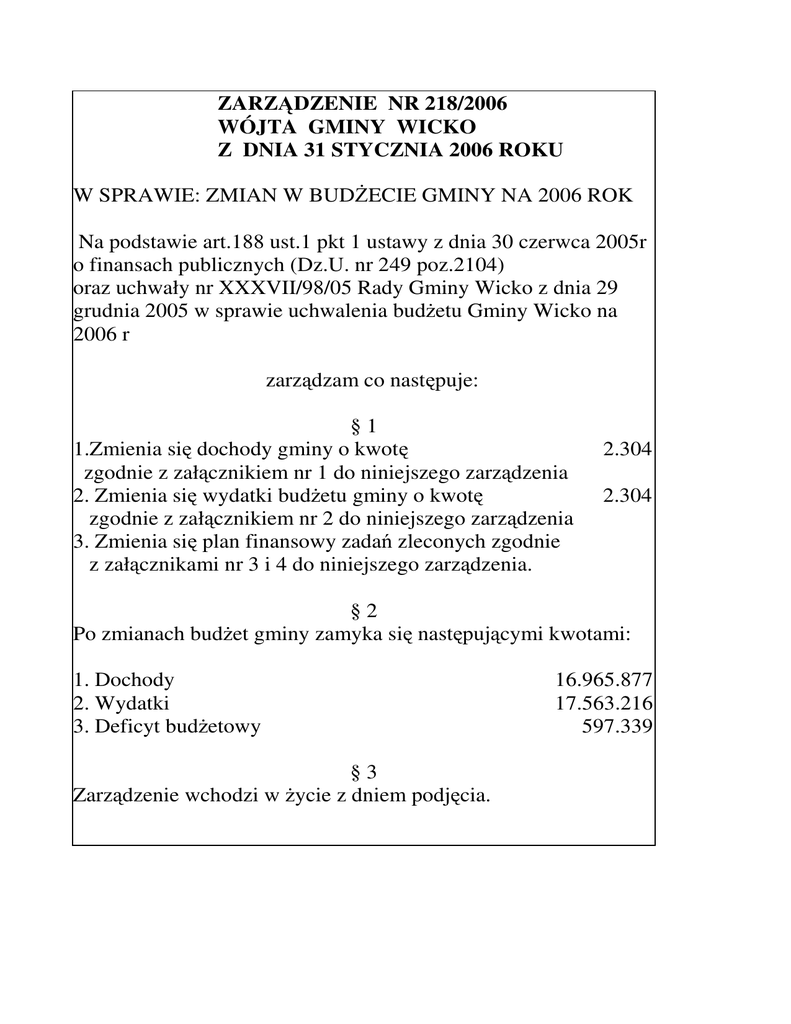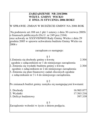 ZARZĄDZENIE NR 218/2006 WÓJTA GMINY WICKO Z DNIA 31 STYCZNIA 2006 ROKU W SPRAWIE: ZMIAN W BUDŻECIE GMINY NA 2006 ROK Na podstawie art.188 ust.1 pkt 1 ustawy z dnia 30 czerwca 2005r o finansach publicznych (Dz.U. nr 249 poz.2104) oraz uchwały nr XXXVII/98/05 Rady Gminy Wicko z dnia 29 grudnia 2005 w sprawie uchwalenia budżetu Gminy Wicko na 2006 r zarządzam co następuje: §1 1.Zmienia się dochody gminy o kwotę zgodnie z załącznikiem nr 1 do niniejszego zarządzenia 2. Zmienia się wydatki budżetu gminy o kwotę zgodnie z załącznikiem nr 2 do niniejszego zarządzenia 3. Zmienia się plan finansowy zadań zleconych zgodnie z załącznikami nr 3 i 4 do niniejszego zarządzenia. 2.304 2.304 §2 Po zmianach budżet gminy zamyka się następującymi kwotami: 1. Dochody 2. Wydatki 3. Deficyt budżetowy §3 Zarządzenie wchodzi w życie z dniem podjęcia. 16.965.877 17.563.216 597.339 Załącznik nr 1 Zmienia sie dochody budżetu gminy: do ZWG nr 218/06 z dnia 31.01.2006 Dział RozdziałParagraf 751 Treść Ogółem Urzędy naczelnych organów władzy państwowej, kontroli i ochrony prawa oraz sądownictwa Wybory do rad gmin, rad powiatów i sejmików województw, wybory wójtów, burmistrzów i prezydentów miasta oraz referenda gminne, powiatowe i wojewódzkie 75109 2010 Dotacje celowe otrzymane z budżetu państwa na realizację zadań bieżących z zakresu administracji rządowej oraz innych zadań zleconych gminie (związkom gmin) ustawami Razem 2 304,00 2 304,00 2 304,00 2 304,00 Załącznik nr 2 Zmienia sie wydatki budzetu gminy: do ZWG nr 218/06 z dnia 31.01.2006 Dział Rozdział Paragraf Treść 750 75023 4270 4300 4480 4500 751 75109 3030 4210 801 80101 4040 4110 80113 4010 4040 4110 4210 854 85401 4040 4110 Ogółem Administracja publiczna 0,00 Urzędy gmin (miast i miast na prawach 0,00 powiatu) Zakup usług remontowych 5 000,00 Zakup usług pozostałych -37 671,00 Podatek od nieruchomości 32 592,00 Pozostałe podatki na rzecz budżetów jednostek 79,00 samorządu terytorialnego Urzędy naczelnych organów władzy 2 304,00 państwowej, kontroli i ochrony prawa oraz sądownictwa Wybory do rad gmin, rad powiatów i 2 304,00 sejmików województw, wybory wójtów, burmistrzów i prezydentów miasta oraz referenda gminne, powiatowe i wojewódzkie Różne wydatki na rzecz osób fizycznych 1 512,00 Zakup materiałów i wyposażenia 792,00 Oświata i wychowanie 0,00 Szkoły podstawowe 0,00 Dodatkowe wynagrodzenie roczne 440,00 Składki na ubezpieczenia społeczne -440,00 Dowożenie uczniów do szkół 0,00 Wynagrodzenia osobowe pracowników -32 716,00 Dodatkowe wynagrodzenie roczne 310,00 Składki na ubezpieczenia społeczne -2 310,00 Zakup materiałów i wyposażenia 34 716,00 Edukacyjna opieka wychowawcza 0,00 Świetlice szkolne 0,00 Dodatkowe wynagrodzenie roczne 145,00 Składki na ubezpieczenia społeczne -145,00 Razem 2 304,00 Załącznik nr 3 Plan finansowy zadań zleconych-dochody do ZWG nr 218/06 z dnia 31.01.2006r. Dział 751 RozdziałParagraf Treść Urzędy naczelnych organów władzy Zlecone 2 304,00 państwowej, kontroli i ochrony prawa oraz sądownictwa 75109 Wybory do rad gmin, rad powiatów i 2 304,00 sejmików województw, wybory wójtów, burmistrzów i prezydentów miasta oraz referenda gminne, powiatowe i wojewódzkie 2010 Dotacje celowe otrzymane z budżetu państwa 2 304,00 na realizację zadań bieżących z zakresu administracji rządowej oraz innych zadań zleconych gminie (związkom gmin) ustawami Razem 2 304,00 Plan finansowy zadań zleconych -wydatki Załącznik nr 4 do ZWG nr 218/06 z dnia 31.01.2006 Dział 751 Rozdział 75109 Paragraf Treść Urzędy naczelnych organów władzy państwowej, kontroli i ochrony prawa oraz sądownictwa Wybory do rad gmin, rad powiatów i sejmików województw, wybory wójtów, burmistrzów i prezydentów miasta oraz referenda gminne, powiatowe i wojewódzkie 3030 Różne wydatki na rzecz osób fizycznych 4210 Zakup materiałów i wyposażenia Razem Zlecone 2 304,00 2 304,00 1 512,00 792,00 2 304,00