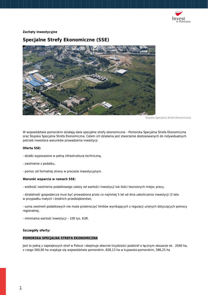 Zachęty inwestycyjne Specjalne Strefy Ekonomiczne (SSE) Słupska Specjalna Strefa Ekonomiczna W województwie pomorskim działają dwie specjalne strefy ekonomiczne – Pomorska Specjalna Strefa Ekonomiczna oraz Słupska Specjalna Strefa Ekonomiczna. Celem ich działania jest stworzenie dostosowanych do indywidualnych potrzeb inwestora warunków prowadzenia inwestycji. Oferta SSE: - działki wyposażone w pełną infrastrukturę techniczną, - zwolnienie z podatku, - pomoc od formalnej strony w procesie inwestycyjnym. Warunki wsparcia w ramach SSE: - wielkość zwolnienia podatkowego zależy od wartości inwestycji lub ilości tworzonych miejsc pracy, - działalność gospodarcza musi być prowadzona przez co najmniej 5 lat od dnia zakończenia inwestycji (3 lata w przypadku małych i średnich przedsiębiorstw), - suma zwolnień podatkowych nie może przekroczyć limitów wynikających z regulacji unijnych dotyczących pomocy regionalnej, - minimalna wartość inwestycji – 100 tys. EUR. Szczegóły oferty: POMORSKA SPECJALNA STREFA EKONOMICZNA Jest to jedną z największych stref w Polsce i obejmuje obecnie trzydzieści podstref o łącznym obszarze ok. 2040 ha, z czego 560,90 ha znajduje się województwie pomorskim, 828,13 ha w kujawsko-pomorskim, 586,25 ha 1 w zachodniopomorskim oraz 64,72 ha w wielkopolskim. Pomorską SSE wyróżnia znakomite położenie na północy kraju z bezpośrednim dostępem do największych portów morskich w kraju. Tereny zarządzane przez PSSE spółka z o.o. znajdują się na przecięciu strategicznych dla Europejskiej wymiany handlowej szlaków północ-południe oraz wschód-zachód. Pomorska Specjalna Strefa Ekonomiczna kompleksowo przygotowuje tereny pod inwestycje organizując wszelkie niezbędne działania potrzebne do rozpoczęcia budowy. Działa też aktywnie na rzecz rozwoju i aktywizacji regionu. Przy współudziale Samorządu Województwa Pomorskiego, Miasta Gdańska oraz Politechniki Gdańskiej utworzyła Gdański Park Naukowo-Technologiczny, w którym przygotowano nowoczesną powierzchnię biurową, laboratoryjną, konferencyjną i produkcyjną. Kolejnym projektem PSSE było utworzenie Bałtyckiego Parku Przemysłowego na terenach po byłej Stoczni Gdynia S.A. Znajdujące się na jego terenie biurowce zostały poddane kompleksowej modernizacji, a wolne tereny parku oferowane są pod projekty realizowane przez zewnętrznych inwestorów. Dlaczego warto inwestować w PSSE: ● ● ● ● ● Zwolnienie z podatku dochodowego (PIT lub CIT) – forma regionalnej pomocy publicznej, Działka przygotowana pod inwestycję (uregulowany stan prawny, dostęp do infrastruktury technicznej i transportowej), z reguły dostępna w konkurencyjnej cenie, Jeden właściciel gruntu (Pomorska Specjalna Strefa Ekonomiczna sp. z o.o. lub samorząd), Doświadczenie SSE w obsłudze projektów inwestycyjnych, Zwolnienia z podatku od nieruchomości oraz inne specyficzne względem lokalizacji udogodnienia (dostępne w wybranych lokalizacjach SSE, w zależności od decyzji władz lokalnych). Przedsiębiorcom prowadzącym działalność gospodarczą na terenie Specjalnej Strefy Ekonomicznej na podstawie zezwolenia przysługuje zwolnienie z podatku dochodowego z tytułu: ● określonych w zezwoleniu wydatków inwestycyjnych, lub ● określonego w zezwoleniu poziomu zatrudnienia. Minimalna wysokość wydatków inwestycyjnych to 100 tys. EUR przy zachowaniu warunku prowadzenia działalności gospodarczej przez okres co najmniej 5 lat i 3 lat dla MSP. Na terenie PSSE można prowadzić większość rodzajów działalności: ● ● ● produkcyjnych (w tym przetwórstwo spożywcze), usługowych (w tym transportowych i magazynowania), BPO (w tym informatycznych, R&D, księgowość, rachunkowość, call centres). Wysokość wskaźnika intensywności pomocy publicznej dla dużych inwestycji w województwie pomorskim wynosi obecnie 35%. Dla średnich i małych przedsiębiorców wskaźnik ten wynosi odpowiednio o 10% i 20% więcej. Oznacza to, że inwestor, w zależności od wielkości przedsiębiorstwa, otrzymuje zwrot od 35% do 55% poniesionych wydatków inwestycyjnych i/lub dwuletnich kosztów pracy nowo zatrudnionych pracowników (kosztów pracy brutto powiększonych o wszystkie obowiązkowe świadczenia związane z zatrudnianiem pracowników). Zwrot ten realizowany jest w postaci zwolnienia z podatku dochodowego, z którego inwestor korzysta aż do momentu wyczerpania kwoty pomocy jednakże nie później niż do końca 2026 r. Za wydatki inwestycyjne uznaje się: ● ● 2 nabycie gruntów lub prawa ich wieczystego użytkowania, nabycie środków trwałych związanych z nową inwestycją, ● ● rozbudowa lub modernizacja istniejących środków trwałych, nabycie wartości niematerialnych i prawnych związanych z transferem technologii. Pomorska SSE współpracuje z władzami lokalnymi i regionalnym otoczeniem ekonomicznym, naukowym, kulturalnym by zapewnić naszym klientom szybką, adekwatną i kompletną informację, niezbędną do podejmowania strategicznych decyzji. Ponadto gwarantuje najlepszą lokalizację pod projekt inwestycyjny oraz miłą, kompetentną i profesjonalną obsługę Inwestorów oraz zapewnia konsultacje na każdym etapie prac projektowych od negocjacji do rozpoczęcia działalności w Strefie, a także w późniejszym okresie działalności. W ramach opieki poinwestycyjnej PSSE wspiera przedsiębiorców w kształceniu i pozyskiwaniu kompetentnych pracowników łącząc instytucje otoczenia biznesu ze szkołami zawodowymi Strefa upowszechnia dobre praktyki wspierające rozwój szkolnictwa oraz inicjuje i rozwija projekty zwiększające potencjał szkolnictwa zawodowego w województwie Pomorskim. Dane kontaktowe: Pomorska Specjalna Strefa Ekonomiczna sp. z o.o. Siedziba spółki ul. Władysława IV nr 9 81-703 Sopot tel: 58 555 97 00 fax: 58 555 97 11 [email protected] SŁUPSKA SPECJALNA STREFA EKONOMICZNA Jest zarządzana przez Pomorską Agencję R