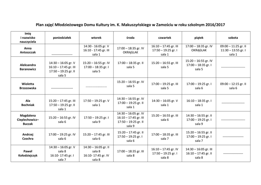 Plan zajęć Młodzieżowego Domu Kultury im. K. Makuszyńskiego w Zamościu w roku szkolnym 2016/2017 Imię i nazwisko nauczyciela Anna Antoszczak Aleksandra Baranowicz Wioletta Brzozowska poniedziałek wtorek środa czwartek piątek sobota 17:00 – 18:35 gr. IV OKRĄGLAK 16:10 – 17:45 gr. III 17:50 – 19:25 gr. I sala 1 17:00 – 18:35 gr. IV OKRĄGLAK -------------------- 14:30 - 16:05 gr. V 16:10 - 17:45 gr. III sala 1 09:00 – 11:25 gr. II 11:30 – 13:55 gr. I sala 1 17:00 – 18:35 gr. II sala 5 15:20 – 16:55 gr. III sala 5 15:20 – 16:55 gr. IV 17:00 – 18:35 gr. I sala 5 17:00 – 19:25 gr. III sala 5 17:00 – 19:25 gr. I sala 6 09:00 – 12:15 gr. II sala 6 14:30 – 16:05 gr. V sala 1 16:10 – 18:35 gr. I sala 1 ---------------------- 15:20 – 16:55 gr. III sala 6 14:30 – 16:55 gr. II 17:00 – 19:25 gr. I sala 9 ----------------------- 14:30 – 16:05 gr. V 16:10 – 17:45 gr. III 17:50 – 19:25 gr. II sala 5 --------------------- 15:20 – 16:55 gr. IV 17:00 – 18:35 gr. I sala 5 ……………………… 15:20 – 16:55 gr. IV sala 5 ----------------------- 15:20 – 17:45 gr. III 17:50 – 19:25 gr. II sala 1 17:50 – 19:25 gr. V sala 1 14:30 – 16:55 gr. IV 17:00 – 19:25 gr. II sala 1 Magdalena Cieplechowicz– Buczak 15:20 – 16:55 gr. IV sala 6 17:50 – 19:25 gr. I sala 9 14:30 – 16:05 gr. IV 16:10 – 17:45 gr. III 17:50 – 19:25 gr. II sala 9 Andrzej Czochra 17:00 – 19:25 gr. IV sala 6 15:20 – 17:45 gr. III sala 6 15:20 – 17:45 gr. II 17:50 – 19:25 gr. I sala 6 17:00 – 18:35 gr. III sala 7 15:20 – 16:55 gr. II 17:00 – 19:25 gr. I sala 7 -------------------- Paweł Kołodziejczyk 14:30 – 16:05 gr. V sala 8 16:10- 17:45 gr. I sala 7 14:30 – 16:05 gr. II sala 8 16:10- 17:45 gr. IV sala 8 17:00 – 18:35 gr. III sala 8 16:10 – 17:45 gr. IV 17:50 – 19:25 gr. I sala 8 14:30 – 16:05 gr. III 16:10 – 17:45 gr. II sala 8 ------------------- Ala Bochniak Ewa Krupa 16:10 – 17:45 gr. III sala 8 17:50- 19:25 gr. I sala 8 17:50 – 19:25 gr. I sala 8 14:30 – 16:55 gr. II sala 8 --------------------- ---------------------- ------------------------ 15:20 – 16:55 gr. IV 17:00 – 19:25 gr. I sala 9 15:20 – 16:55 gr. III OKRĄGLAK --------------------------- Magdalena Majer 14:30 – 16:55 gr. II 17:00 – 18:35 gr. I sala 9 14:30 – 16:05 gr. IV 16:10 – 17:45 gr. II sala 9 Małgorzata Magryta -------------------------- ------------------------- ------------------------ --------------------------- ------------------------- Radosław Oktaba 15:20 – 16:55 gr. III 17:00 – 19:25 gr. I sala 17 ----------------------- 15:20 – 16:55 gr. III 17:00 – 19:25 gr. II sala 17 15:20 – 16:55 gr. IV 17:00 – 18:35 gr. I sala 17 17:00 – 18:35 gr. II sala 17 09:00 – 10:35 gr. IV sala 17 Piotr Johaniuk 14:30 – 16:05 gr. IV sala 7 14:30 – 16:55 gr. III 17:00 – 19:25 gr. I sala 7 14:30 – 16:05 gr. II sala 8 17:50 – 19:25 gr. I sala 8 …………………………. --------------------- --------------------------- ---------------- Andrzej Szumowski --------------------- Plan obowiązuje od 1 września 2016 r. 14:30 – 16:05 gr. IV 16:10 – 17:45 gr. III 17:50 – 19:25 gr. II sala 7 17:00 – 18:35 gr. II sala 17 15:20 – 16:55 gr. III OKRĄGLAK 09:00 – 10:35 gr. II 10:40 – 13:55 gr. I Sala 9 10:00 – 13:15 gr. I sala 14