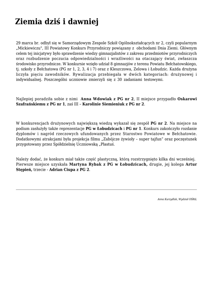 Ziemia dziś i dawniej 29 marca br. odbył się w Samorządowym Zespole Szkół Ogólnokształcących nr 2, czyli popularnym „Mickiewiczu", III Powiatowy Konkurs Przyrodniczy powiązany z obchodami Dnia Ziemi. Głównym celem tej inicjatywy było sprawdzenie wiedzy gimnazjalistów z zakresu przedmiotów przyrodniczych oraz rozbudzenie poczucia odpowiedzialności i wrażliwości na otaczający świat, zwłaszcza środowisko przyrodnicze. W konkursie wzięło udział 8 gimnazjów z terenu Powiatu Bełchatowskiego, tj. szkoły z Bełchatowa (PG nr 1, 2, 3, 4 i 7) oraz z Kleszczowa, Zelowa i Łobudzic. Każda drużyna liczyła pięciu zawodników. Rywalizacja przebiegała w dwóch kategoriach: drużynowej i indywidualnej. Poszczególni uczniowie zmierzyli się z 30 zadaniami testowymi. Najlepiej poradziła sobie z nimi Anna Wdowiak z PG nr 2, II miejsce przypadło Oskarowi Szafrańskiemu z PG nr 1, zaś III – Karolinie Siemieniuk z PG nr 2. W konkurencjach drużynowych największą wiedzą wykazał się zespół PG nr 2. Na miejsce na podium zasłużyły także reprezentacje PG w Łobudzicach i PG nr 1. Konkurs zakończyło rozdanie dyplomów i nagród rzeczowych ufundowanych przez Starostwo Powiatowe w Bełchatowie. Dodatkowymi atrakcjami była projekcja filmu „Zabójcze żywioły – super tajfun” oraz poczęstunek przygotowany przez Spółdzielnię Uczniowską „Plastuś. Należy dodać, że konkurs miał także część plastyczną, którą rozstrzygnięto kilka dni wcześniej. Pierwsze miejsce uzyskała Martyna Rybak z PG w Łobudzicach, drugie, jej kolega Artur Stępień, trzecie - Adrian Ciupa z PG 2. Anna Kurzydlak, Wydział OŚRiL