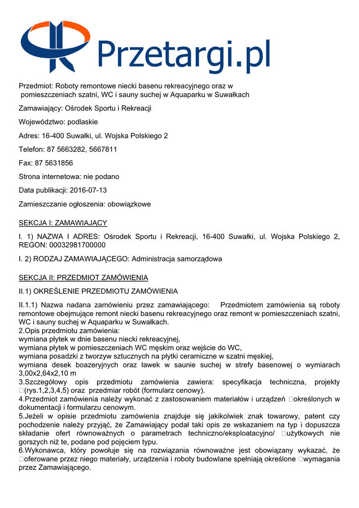 Przedmiot: Roboty remontowe niecki basenu rekreacyjnego oraz w pomieszczeniach szatni, WC i sauny suchej w Aquaparku w Suwałkach Zamawiający: Ośrodek Sportu i Rekreacji Województwo: podlaskie Adres: 16-400 Suwałki, ul. Wojska Polskiego 2 Telefon: 87 5663282, 5667811 Fax: 87 5631856 Strona internetowa: nie podano Data publikacji: 2016-07-13 Zamieszczanie ogłoszenia: obowiązkowe SEKCJA I: ZAMAWIAJĄCY I. 1) NAZWA I ADRES: Ośrodek Sportu i Rekreacji, 16-400 Suwałki, ul. Wojska Polskiego 2, REGON: 00032981700000 I. 2) RODZAJ ZAMAWIAJĄCEGO: Administracja samorządowa SEKCJA II: PRZEDMIOT ZAMÓWIENIA II.1) OKREŚLENIE PRZEDMIOTU ZAMÓWIENIA II.1.1) Nazwa nadana zamówieniu przez zamawiającego: Przedmiotem zamówienia są roboty remontowe obejmujące remont niecki basenu rekreacyjnego oraz remont w pomieszczeniach szatni, WC i sauny suchej w Aquaparku w Suwałkach. 2.Opis przedmiotu zamówienia: wymiana płytek w dnie basenu niecki rekreacyjnej, wymiana płytek w pomieszczeniach WC męskim oraz wejście do WC, wymiana posadzki z tworzyw sztucznych na płytki ceramiczne w szatni męskiej, wymiana desek boazeryjnych oraz ławek w saunie suchej w strefy basenowej o wymiarach 3,00x2,64x2,10 m 3.Szczegółowy opis przedmiotu zamówienia zawiera: specyfikacja techniczna, projekty (rys.1,2,3,4,5) oraz przedmiar robót (formularz cenowy). 4.Przedmiot zamówienia należy wykonać z zastosowaniem materiałów i urządzeń określonych w dokumentacji i formularzu cenowym. 5.Jeżeli w opisie przedmiotu zamówienia znajduje się jakikolwiek znak towarowy, patent czy pochodzenie należy przyjąć, że Zamawiający podał taki opis ze wskazaniem na typ i dopuszcza składanie ofert równoważnych o parametrach techniczno/eksploatacyjno/ użytkowych nie gorszych niż te, podane pod pojęciem typu. 6.Wykonawca, który powołuje się na rozwiązania równoważne jest obowiązany wykazać, że oferowane przez niego materiały, urządzenia i roboty budowlane spełniają określone wymagania przez Zamawiającego. 7.Ciężar udowodnienia, że materiał (wyrób) jest równoważny w stosunku do wymogu określonego przez Zamawiającego spoczywa na składającym ofertę. W takim wypadku Wykonawca musi przedłożyć odpowiednie dokumenty, opisujące parametry techniczno - jakościowe, wymagane prawem certyfikaty i inne dokumenty, dopuszczające dane materiały (wyroby) do użytkowania oraz pozwalające jednoznacznie stwierdzić, że są one równoważne (pod rygorem odrzucenia oferty). 8.Zamawiający przewiduje udzielenia zamówienia uzupełniającego, zgodnie z art. 67 ust. 1 pkt. 6 ustawy Prawo zamówień publicznych II.1.2) Rodzaj zamówienia: roboty budowlane II.1.3) Określenie przedmiotu oraz wielkości lub zakresu zamówienia: Przedmiotem zamówienia są roboty remontowe obejmujące remont niecki basenu rekreacyjnego oraz remont w pomieszczeniach szatni, WC i sauny suchej w Aquaparku w Suwałkach. 2.Opis przedmiotu zamówienia: wymiana płytek w dnie basenu niecki rekreacyjnej, wymiana płytek w pomieszczeniach WC męskim oraz wejście do WC, wymiana posadzki z tworzyw sztucznych na płytki ceramiczne w szatni męskiej, wymiana desek boazeryjnych oraz ławek w saunie suchej w strefy basenowej o wymiarach 3,00x2,64x2,10 m 3.Szczegółowy opis przedmiotu zamówienia zawiera: specyfikacja techniczna, projekty (rys.1,2,3,4,5) oraz przedmiar robót (formularz cenowy). 4.Przedmiot zamówienia należy wykonać z zastosowaniem materiałów i urządzeń określonych w dokumentacji i formularzu cenowym. 5.Jeżeli w opisie przedmiotu zamówienia znajduje się jakikolwiek znak towarowy, patent czy pochodzenie należy przyjąć, że Zamawiający podał taki opis ze wskazaniem na typ i dopuszcza składanie ofert równoważnych o parametrach techniczno/eksploatacyjno/ użytkowych nie gorszych niż te, podane pod pojęciem typu. 6.Wykonawca, który powołuje się na rozwiązania równoważne jest obowiązany wykazać, że oferowane przez niego materiały, urządzenia i roboty budowlane spełniają określone wymagania przez Zamawiającego. 7.Ciężar udowodnienia, że materiał (wyrób) jest równoważny w stosunku do wymogu określonego przez Zamawiającego spoczywa na składającym ofertę. W takim wypadku Wykonawca musi przedłożyć odpowiednie dokumenty, opisujące parametry techniczno - jakościowe, wymagane prawem certyfikaty i inne dokumenty, dopuszczające dane materiały (wyroby) do użytkowania oraz pozwalające jednoznacznie stwierdzić, że są one równoważne (pod rygorem odrzucenia oferty). 8.Zamawiający przewiduje udzielenia zamówienia uzupełniającego, zgodnie z art. 67 ust. 1 pkt. 6 ustawy Prawo zamówień publicznych II.1.4) Wspólny Słownik Zamówień (CPV): 454000001 II.1.5) Czy dopuszcza się złożenie oferty częściowej: nie II.1.6) Czy dopuszcza się złożenie oferty wariantowej: nie II.1.7) Czy przewiduje się udzielenie zamówień uzupełniających: nie SEKCJA III: INFORMACJE O CHARAKTERZE PRAWNYM, EKONOMICZNYM, FINANSOWYM I TECHNICZNYM III.1) WARUNKI DOTYCZĄCE ZAMÓWIENIA Informacja na temat wadium: Wykonawca zapewni jako część swojej oferty wadium w wysokości: 2.500,00 zł (słownie: dwa tysiące pięćset złotych) na całość zamówienia. 2. Wadium może być wnoszone w jednej lub kilku następujących formach: a)pieniądzu; b)poręczeniach bankowych lub poręczeniach spółdzielczej kasy oszczędnościowo -kredytowej, z tym, że poręczenie kasy jest zawsze poręczeniem pieniężnym, c)gwarancjach bankowych; d)gwarancjach ubezpieczeniowych; e)poręczeniach udzielanych przez podmioty, o których mowa w art. 6b ust. 5 pkt 2 ustawy z dnia 9 listopada 2000 r. o utworzeniu Polskiej Agencji Rozwoju Przedsiębiorczości (tj. Dz. U. z 2014, poz. 1804). Wadium wnoszone w pieniądzu wpłaca się przelewem na rachunek bankowy Ośrodka Sportu i Rekreacji w Suwałkach w Banku Polska Kasa Opieki S.A. nr 68 1240 3363 1111 0010 3658 2711 w terminie do dnia 28.07.2016 r. do godz. 10:00 (decyd