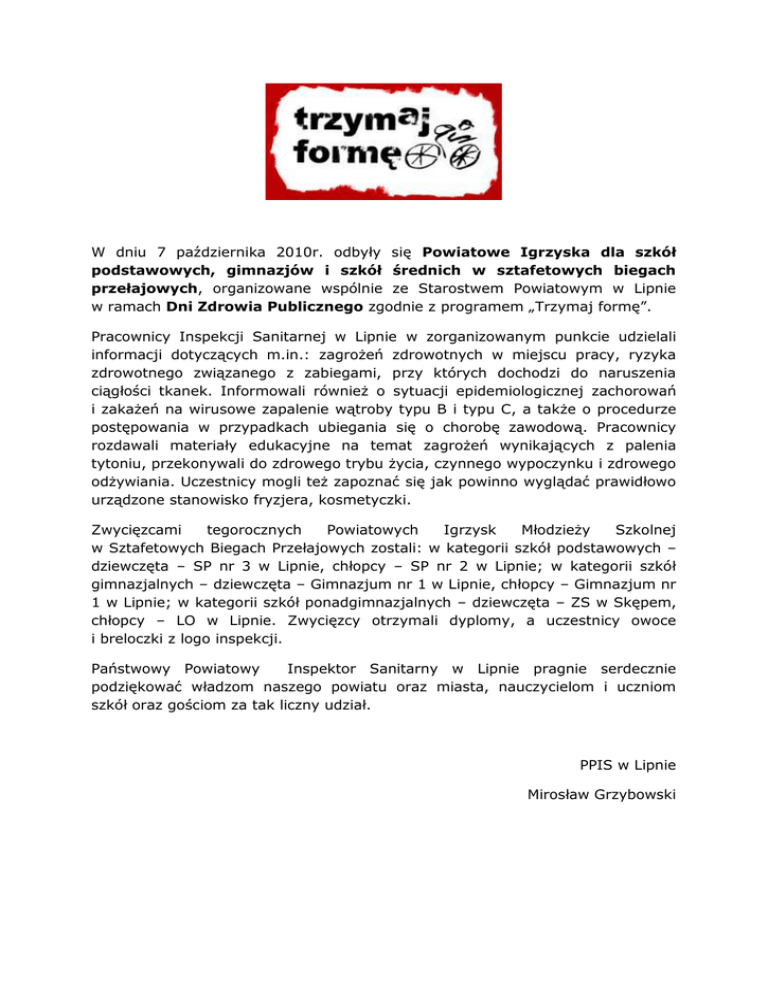 W dniu 7 października 2010r. odbyły się Powiatowe Igrzyska dla szkół podstawowych, gimnazjów i szkół średnich w sztafetowych biegach przełajowych, organizowane wspólnie ze Starostwem Powiatowym w Lipnie w ramach Dni Zdrowia Publicznego zgodnie z programem „Trzymaj formę”. Pracownicy Inspekcji Sanitarnej w Lipnie w zorganizowanym punkcie udzielali informacji dotyczących m.in.: zagrożeń zdrowotnych w miejscu pracy, ryzyka zdrowotnego związanego z zabiegami, przy których dochodzi do naruszenia ciągłości tkanek. Informowali również o sytuacji epidemiologicznej zachorowań i zakażeń na wirusowe zapalenie wątroby typu B i typu C, a także o procedurze postępowania w przypadkach ubiegania się o chorobę zawodową. Pracownicy rozdawali materiały edukacyjne na temat zagrożeń wynikających z palenia tytoniu, przekonywali do zdrowego trybu życia, czynnego wypoczynku i zdrowego odżywiania. Uczestnicy mogli też zapoznać się jak powinno wyglądać prawidłowo urządzone stanowisko fryzjera, kosmetyczki. Zwycięzcami tegorocznych Powiatowych Igrzysk Młodzieży Szkolnej w Sztafetowych Biegach Przełajowych zostali: w kategorii szkół podstawowych – dziewczęta – SP nr 3 w Lipnie, chłopcy – SP nr 2 w Lipnie; w kategorii szkół gimnazjalnych – dziewczęta – Gimnazjum nr 1 w Lipnie, chłopcy – Gimnazjum nr 1 w Lipnie; w kategorii szkół ponadgimnazjalnych – dziewczęta – ZS w Skępem, chłopcy – LO w Lipnie. Zwycięzcy otrzymali dyplomy, a uczestnicy owoce i breloczki z logo inspekcji. Państwowy Powiatowy Inspektor Sanitarny w Lipnie pragnie serdecznie podziękować władzom naszego powiatu oraz miasta, nauczycielom i uczniom szkół oraz gościom za tak liczny udział. PPIS w Lipnie Mirosław Grzybowski