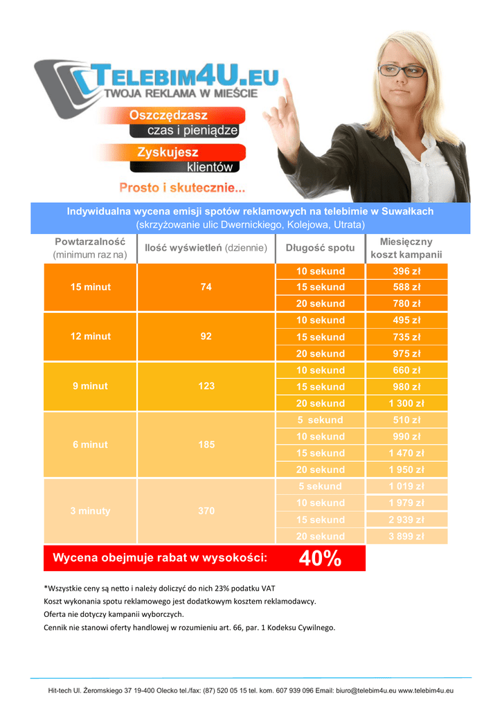 Indywidualna wycena emisji spotów reklamowych na telebimie w Suwałkach (skrzyżowanie ulic Dwernickiego, Kolejowa, Utrata) Powtarzalność (minimum raz na) Ilość wyświetleń (dziennie) 15 minut 12 minut 9 minut 6 minut 3 minuty 74 92 123 185 370 Wycena obejmuje rabat w wysokości: Długość spotu Miesięczny koszt kampanii 10 sekund 396 zł 15 sekund 588 zł 20 sekund 780 zł 10 sekund 495 zł 15 sekund 735 zł 20 sekund 975 zł 10 sekund 660 zł 15 sekund 980 zł 20 sekund 1 300 zł 5 sekund 510 zł 10 sekund 990 zł 15 sekund 1 470 zł 20 sekund 1 950 zł 5 sekund 1 019 zł 10 sekund 1 979 zł 15 sekund 2 939 zł 20 sekund 3 899 zł 40% *Wszystkie ceny są netto i należy doliczyd do nich 23% podatku VAT Koszt wykonania spotu reklamowego jest dodatkowym kosztem reklamodawcy. Oferta nie dotyczy kampanii wyborczych. Cennik nie stanowi oferty handlowej w rozumieniu art. 66, par. 1 Kodeksu Cywilnego. Hit-tech Ul. Żeromskiego 37 19-400 Olecko tel./fax: (87) 520 05 15 tel. kom. 607 939 096 Email: [email protected] www.telebim4u.eu Położenie Miasto Suwałki. Vis a vis Centrum Handlowego Plaza i restauracji McDonalds. Kluczowe skrzyżowanie miasta (ulic Utrata, Dwernickiego, Kolejowa) trasy E67 do granicy kraju z Litwą.100 m od dworców PKP i PKS. Droga dojazdowa do największych osiedli mieszkaniowych. Dobowy ruch w pobliżu ekranu Udokumentowany według BIP UM Suwałki 23 000 aut. 10 000 klientów galerii handlowej , ok. 800 osób uczęszczających do pobliskiego Aquaparku, 2000 klientów restauracji McDonalds, ok. 14 000 osób poruszających się pieszo i/lub korzystających z usług transportowych PKS, PKP, ZKM. Rozmiar i specyfikacja emisji spotów 30m2. Emisja spotów reklamowych trwa codziennie od 5:30 do 24:00. Ekran wyświetla szerokie spektrum prezentacji od statycznych planszy (jpeg, bmp), przez samoaktualizujące pliki (swf) po komercyjne materiały video (avi, vcd, mpeg). Pomiędzy reklamami są wyświetlane krótkie spoty informacyjne. Jasność jest regulowana automatycznie w zależności od natężenia światła dlatego nie oślepia osób przebywających w jego zasięgu. Główne zalety Przekaz przykuwający uwagę a zarazem skuteczny. Intensywności kampanii dostosowana do planowanego budżetu. Oszczędność płynąca z elektronicznej formy spotu która nie wymaga dodatkowych wydatków (np. wydruku, dystrybucji) nie marnotrawi czasu dzięki szybkiej zmianie/ aktualizacji treści reklamowej. Wielki format oraz nietypowy charakter przekazu daje reklamującej się firmie nowoczesny i dynamiczny wizerunek a u obecnych klientów utrwala słuszność dokonanego wyboru. Reklamy wyświetlane na naszym ekranie są widoczne niezależnie od pogody i pory dnia. Kampanię na telebimie możemy rozszerzyć o inne media które dobierzemy pod kątem Państwa potrzeb. Zapraszamy do współpracy! Hit-tech Ul. Żeromskiego 37 19-400 Olecko tel./fax: (87) 520 05 15 tel. kom. 607 939 096 Email: [email protected] www.telebim4u.eu