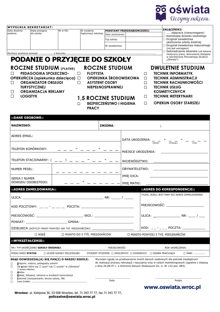 WYPEŁNIA SEKRETARIAT: Data złożenia podania: Data przyjęcia do szkoły: Nr w KS: ZAŁĄCZNIKI: …… zdjęcie/a (niewymagane) Kserokopia dowodu osobistego Oryginał świadectwa ukończenia szkoły średniej Oryginał świadectwa maturalnego Nr wydanej PODSTAWY PRZEDSIĘBIORCZOŚCI: legitymacji szkolnej: Data ukończenia: Typ szkoły: Nr świadectwa: (nie jest wymagany) Zaświadczenie lekarskie (od lekarza Słuchacz powtarza semestr …………………… z kierunku …………………………………………………………………………………………………………………………………. medycyny pracy, skierowanie dostępne w sekretariacie Policealnego Studium „Oświata”) PODANIE O PRZYJĘCIE DO SZKOŁY ROCZNE STUDIUM ROCZNE STUDIUM (PŁATNE) PEDAGOGIKA SPOŁECZNOOPIEKUŃCZA (opiekunka dziecięca) ORGANIZATOR OBSŁUGI TURYSTYCZNEJ ORGANIZACJA REKLAMY LOGISTYK DWULETNIE STUDIUM FLOTYSTA OPIEKUNKA ŚRODOWISKOWA ASYSTENT OSOBY NIEPEŁNOSPRAWNEJ TECHNIK INFORMATYK TECHNIK ADMINISTRACJI TECHNIK RACHUNKOWOŚCI TECHNIK USŁUG KOSMETYCZNYCH TECHNIK WETERYNARII 1,5 ROCZNE STUDIUM OPIEKUN OSOBY STARSZEJ BEZPIECZEŃSTWO I HIGIENA PRACY ::DANE OSOBOWE:: NAZWISKO: ; IMIONA: ADRES EMAIL: DATA URODZENIA: _ _ - _ _ - _ _ _ _ (dzień) _ _ _ - _ _ _ - _ _ _ TELEFON KOMÓRKOWY: TELEFON STACJONARNY: ( NUMER PESEL: __ ) _ _ _ - _ _ - _ _ _ _ _ _ _ _ _ _ _ _ _ MIEJSCE URODZENIA: _ _ _ - _ _ _ _ _ _ (rok) _________________________ WOJEWÓDZTWO: _____________________________ OBYWATELSTWO: _____________________________ IMIĘ OJCA: SERIA I NUMER DOWODU OSOBISTEGO: (miesiąc) IMIĘ MATKI: ::ADRES ZAMELDOWANIA:: _______________________________ _________________________________ ::ADRES DO KORESPONDENCJI:: ULICA: ___________________________________________ NR: _____ / _____ TYLKO, JEŻELI JEST INNY NIŻ ADRES ZAMELDOWANIA KOD POCZTOWY: __ __ - __ __ __ POCZTA: ____________________________ MIEJSCOWOŚĆ: ____________________ MIEJSCOWOŚĆ: _________________________ WOJ.: _____________________ ULICA: ______________ NR: ____ / ___ POWIAT: ______________________ GMINA: ____________________________ DZIELNICA (DOTYCZY MIAST POWYŻEJ 100 TYŚ. MIESZKAŃCÓW): ______________________ KOD: _ _ - _ _ _ POCZTA: ____________ MIASTO DO 5 TYŚ. MIESZKAŃCÓW ::WYKSZTAŁCENIE:: NR i TYP UKOŃCZONEJ SZKOŁY ŚREDNIEJ: PODAJ SWÓJ STATUS: UCZEŃ SZKOŁY POLICEALNEJ MIEJSCOWOŚĆ: STUDENT STUDIÓW: SKĄD DOWIEDZIAŁ(A) SIĘ PAN(I) O NASZEJ SZKOLE: Znajomi, rodzice, pedagodzy szkolni Od osoby która się uczy* lub uczyła* w „Oświacie” ZAOCZNYCH ROK UKOŃCZENIA: DZIENNYCH OSOBA PRACUJĄCA INNE: .............. Wyrażam zgodę na przetwarzanie moich danych osobowych dla potrzeb niezbędnych do realizacji procesu rekrutacji i nauczania oraz w celach marketingowych (zgodnie z Ustawą z dnia 29.08.97 r. o Ochronie Danych Osobowych Dz. U. Nr 133 poz. 883) (* zaznacz właściwe) Ulotka Plakat, bilboard, reklama w środkach komunikacji Internet (wyszukiwarki, strona szkoły, FB) Inne źródło: ..................................................................... ..................................... Data ................................................. Podpis www.oswiata.wroc.pl Wrocław: ul. Kolejowa 36, 53-508 Wrocław, tel. 71 343 77 77, fax 71 343 77 77, [email protected]