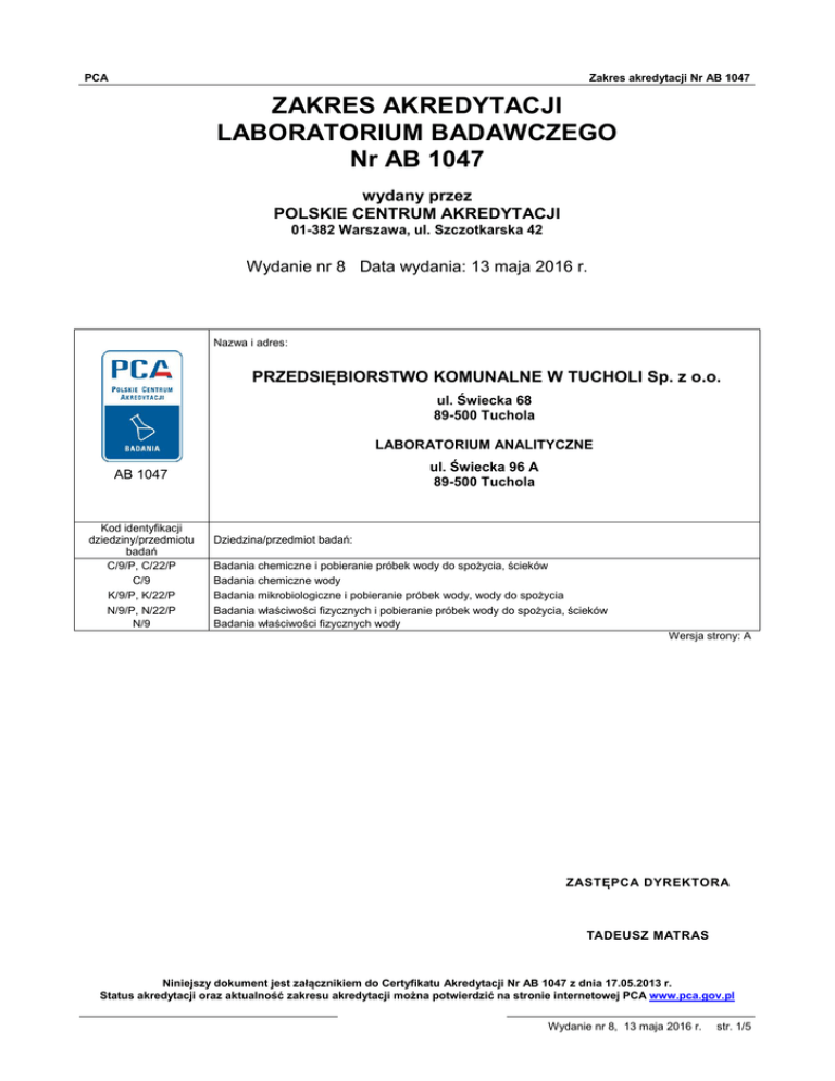 PCA Zakres akredytacji Nr AB 1047 ZAKRES AKREDYTACJI LABORATORIUM BADAWCZEGO Nr AB 1047 wydany przez POLSKIE CENTRUM AKREDYTACJI 01-382 Warszawa, ul. Szczotkarska 42 Wydanie nr 8 Data wydania: 13 maja 2016 r. Nazwa i adres: PRZEDSIĘBIORSTWO KOMUNALNE W TUCHOLI Sp. z o.o. ul. Świecka 68 89-500 Tuchola LABORATORIUM ANALITYCZNE ul. Świecka 96 A 89-500 Tuchola AB 1047 Kod identyfikacji dziedziny/przedmiotu badań C/9/P, C/22/P C/9 K/9/P, K/22/P N/9/P, N/22/P N/9 Dziedzina/przedmiot badań: Badania chemiczne i pobieranie próbek wody do spożycia, ścieków Badania chemiczne wody Badania mikrobiologiczne i pobieranie próbek wody, wody do spożycia Badania właściwości fizycznych i pobieranie próbek wody do spożycia, ścieków Badania właściwości fizycznych wody Wersja strony: A ZASTĘPCA DYREKTORA TADEUSZ MATRAS Niniejszy dokument jest załącznikiem do Certyfikatu Akredytacji Nr AB 1047 z dnia 17.05.2013 r. Status akredytacji oraz aktualność zakresu akredytacji można potwierdzić na stronie internetowej PCA www.pca.gov.pl Wydanie nr 8, 13 maja 2016 r. str. 1/5 PCA Zakres akredytacji Nr AB 1047 Pracownia Badań Fizyko-Chemicznych ul. Świecka 96 A, 89-500 Tuchola Przedmiot badań/wyrób Woda Ścieki Rodzaj działalności/badane cechy/metoda Pobieranie próbek do badań chemicznych i fizycznych Temperatura pobranej próbki wody Zakres: (+2 − +50) oC Przewodność elektryczna właściwa Zakres: (100 − 1500) µS/cm Metoda konduktometryczna Stężenie azotynów Zakres: (0,010 − 0,50) mg/l Metoda spektrofotometryczna Stężenie manganu Zakres: (0,030 − 0,70) mg/l Metoda spektrofotometryczna Stężenie żelaza ogólnego Zakres: (0,050 − 4,0) mg/l Metoda spektrofotometryczna Sumaryczna zawartość wapnia i magnezu Zakres: (10 − 500) mg/l Metoda miareczkowa Stężenie glinu Zakres: (0,050 – 1,00) mg/l Metoda spektrofotometryczna Zawartość fluorków Zakres: (0,20 – 2,00) mg/l Metoda spektrofotometryczna Mętność Zakres: (0,30 − 40) NTU Metoda nefelometryczna Barwa Zakres: (5 − 70) mg/l Pt Metoda wizualna Stężenie jonu amonowego Zakres: (0,030 − 1,0) mg/l Metoda spektrofotometryczna Stężenie azotanów Zakres: (0,20 − 50,0) mg/l Metoda spektrofotometryczna Indeks nadmanganianowy Zakres: (0,50 – 10,0) mg/l O2 Metoda miareczkowa Pobieranie próbek do badań chemicznych i fizycznych Temperatura pobranej próbki ścieku Zakres: (+2 − +50) oC Chemiczne zapotrzebowanie tlenu – ChZT- Cr Zakres: (40 – 15 000) mg/l Metoda miareczkowa Dokumenty odniesienia PN-ISO 5667-5:2003 PB-07 edycja 02 z dnia 22.10.2015 r. PN-EN 27888:1999 PN-EN 26777:1999 PB-02 edycja 03 z dnia 22.10.2015 r. w oparciu o test firmy Hach Lange 8149 PN-ISO 6332:2001 pkt 7.1.1 PN-ISO 6059:1999 PB-08 edycja 02 z dnia 22.10.2015 r. w oparciu o test firmy Hach Lange 8326 PB-09 edycja 02 z dnia 22.10.2015 r. w oparciu o test firmy Hach Lange 8029 PN-EN ISO 7027:2003 pkt 6.3 PN-EN ISO 7887:2012+Ap1:2015-06 Metoda D PN-ISO 7150-1:2002 PN-82/C-04576/08 PN-EN ISO 8467:2001 PN-ISO 5667-10:1997 PB-07 edycja 02 z dnia 22.10.2015 r. PN-ISO 6060:2006 Wersja strony: A Wydanie nr 8, 13 maja 2016 r. str. 2/5 PCA Zakres akredytacji Nr AB 1047 Przedmiot badań/wyrób Ścieki Woda, ścieki Rodzaj działalności/badane cechy/metoda Stężenie azotu azotanowego Zakres: (0,10 − 40,0) mg/l Metoda spektrofotometryczna Stężenie azotu azotynowego Zakres: (0,01 − 2,00) mg/l Metoda spektrofotometryczna Stężenie azotu amonowego Zakres: (0,05 − 3,00) mg/l Metoda spektrofotometryczna Stężenie azotu amonowego Zakres: (2,0 − 500) mg/l Metoda miareczkowa Stężenie azotu Kjeldahla Zakres: (2,0 − 500) mg/l Metoda miareczkowa Stężenie azotu ogólnego (z obliczeń) Biochemiczne zapotrzebowanie tlenu − BZT5 Zakres: (1 − 6) mg/l O2 Metoda miareczkowa Biochemiczne zapotrzebowanie tlenu − BZT5 Zakres: (3 − 5000) mg/l O2 Metoda miareczkowa Zawiesiny ogólne Zakres: (2,0 − 2000) mg/l Metoda wagowa Stężenie fosforu ogólnego Zakres: (0,060 − 50) mg/l Metoda spektrofotometryczna Stężenie żelaza ogólnego Zakres: (0,050 − 10,0) mg/l Metoda spektrofotometryczna pH Zakres: 4,0 − 10,0 Metoda potencjometryczna Stężenie siarczanów Zakres: (10 – 300) mg/l Metoda wagowa Stężenie chlorków Zakres: (5,0 – 300) mg/l Metoda miareczkowa Stężenie chloru wolnego i ogólnego Zakres: (0,100 – 2,00) mg/l Metoda spektrofotometryczna Stężenie chloru związanego (z obliczeń) Chemiczne zapotrzebowanie tlenu – ChZT- Cr Zakres: (10,0 – 150) mg/l O2 Metoda spektrofotometryczna Dokumenty odniesienia PN-82/C-04576/08 PN-EN 26777:1999 PN-ISO 7150-1:2002 PN-ISO 5664:2002 PN-EN 25663:2001 PB-03 edycja 04 z dnia 22.10.2015 r. PN-EN 1899-2:2002 PN-EN 1899-1:2002 PN-EN 872:2007+Ap1:2007 PN-EN ISO 6878:2006+Ap1:2010 +Ap2:2010 pkt 8 PN-ISO 6332:2001 pkt 7.1.1 PN-EN ISO 10523:2012 PN-ISO 9280:2002 PN-ISO 9297:1994 PB-11 edycja 02 z dnia 22.10.2015 r. w oparciu o test firmy Hach Lange 8021 PN-ISO 15705:2005 Wersja strony: A Wydanie nr 8, 13 maja 2016 r. str. 3/5 PCA Zakres akredytacji Nr AB 1047 Pracownia Badań Mikrobiologicznych ul. Świecka 96 A, 89-500 Tuchola Przedmiot badań/wyrób Woda Rodzaj działalności/badane cechy/metoda Pobieranie próbek do badań mikrobiologicznych Ogólna liczba mikroorganizmów w temp. 22 C po 72 h Zakres: od 1 jtk/1 ml Metoda płytkowa (posiew wgłębny) Ogólna liczba mikroorganizmów w temp. 36 C po 48 h Zakres: od 1 jtk/1 ml Metoda płytkowa (posiew wgłębny) Obecność i liczba Clostridium perfringens wraz ze sporami Zakres: od 1 jtk/100 ml Metoda filtracji membranowej Obecność i liczba bakterii grupy coli Zakres: od 1 jtk/100 ml Metoda filtracji membranowej Obecność i liczba Escherichia coli Zakres: od 1 jtk/100 ml Metoda filtracji membranowej Obecność i liczba Enterokoków kałowych Zakres: od1 jtk/100 ml Metoda filtracji membranowej Obecność i liczba bakterii grupy coli Zakres: od 1 jtk/100 ml Metoda NPL (Colilert-18 / Quanti-Tray) Obecność i liczba Escherichia