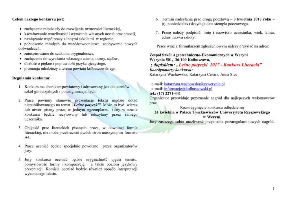 6. Termin nadsyłania prac drogą pocztową – 3 kwietnia 2017 roku – (tj. poniedziałek) decyduje data stempla pocztowego. Celem naszego konkursu jest: zachęcenie młodzieży do rozwijania twórczości literackiej, kształtowanie wrażliwości i wyrażania własnych uczuć oraz emocji, nawiązanie współpracy z innymi szkołami w regionie, pobudzenie młodych do współzawodnictwa, zdobywanie nowych doświadczeń, zainspirowanie do szukania oryginalności, zachęcenie do wyrażania własnego zdania, oceny, sądów, dbałość o piękno i poprawność języka ojczystego, promocja młodzieży z terenu powiatu kolbuszowskiego. Regulamin konkursu: 1. Konkurs ma charakter powiatowy i adresowany jest do uczniów szkół gimnazjalnych i ponadgimnazjalnych. 2. Prace powinny niepublikowanego lub utwór pisany konkursu będzie uczestnika. stanowić prezentację tekstu nigdzie dotąd na temat „Leśne potyczki”. Może to być wiersz prozą w jednym egzemplarzu, który w czasie recytowany lub odczytany przez samego 7. Pracę należy podpisać: imię i nazwisko uczestnika, wiek, klasa, adres, nazwa szkoły. Prace wraz z formularzem zgłoszeniowym należy przysłać na adres: Zespół Szkół Agrotechniczno-Ekonomicznych w Weryni Werynia 501, 36-100 Kolbuszowa, z dopiskiem: ,,Leśne potyczki 2017 - Konkurs Literacki” Koordynatorzy konkursu: Katarzyna Wachowska, Katarzyna Cesarz, Anna Stec e-mail: [email protected] e-mail: [email protected] tel.: (17) 2271-441 Organizator przewiduje przyznanie nagród dla najlepszych wykonawców prac. Rozstrzygnięcie konkursu odbędzie się 24 kwietnia w Pałacu Tyszkiewiczów Uniwersytetu Rzeszowskiego w Weryni. Jury zastrzega sobie możliwość przyznania pozaregulaminowych nagród. 3. Objętość prac literackich pisanych prozą, w dowolnej formie literackiej, nie może przekraczać dwóch stron maszynopisu formatu A4. 4. Prace oceniać będzie specjalnie powołane jury. przez organizatorów 5. Jury konkursu oceniać będzie oryginalność ujęcia tematu, pomysłowość formy i kompozycję, a także poziom językowy prezentacji. Komisja oceniać będzie również sposób interpretacji wykonanego tekstu. 1 2