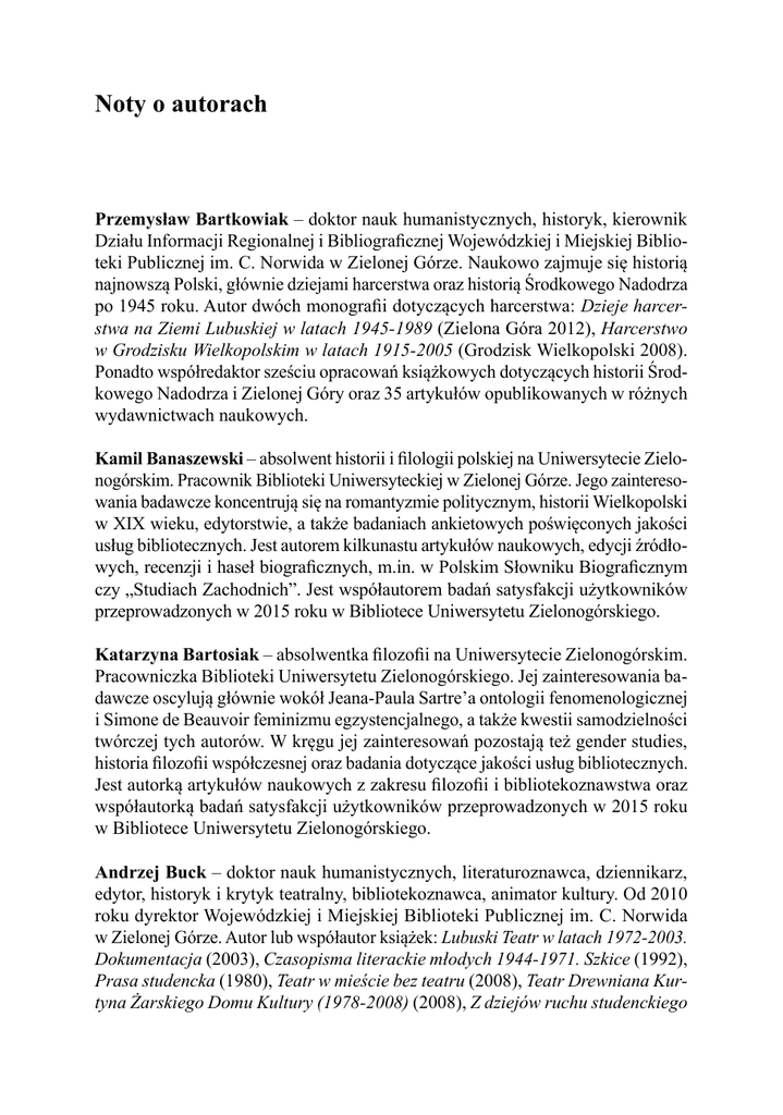 Noty o autorach Przemysław Bartkowiak – doktor nauk humanistycznych, historyk, kierownik Działu Informacji Regionalnej i Bibliograficznej Wojewódzkiej i Miejskiej Biblioteki Publicznej im. C. Norwida w Zielonej Górze. Naukowo zajmuje się historią najnowszą Polski, głównie dziejami harcerstwa oraz historią Środkowego Nadodrza po 1945 roku. Autor dwóch monografii dotyczących harcerstwa: Dzieje harcerstwa na Ziemi Lubuskiej w latach 1945-1989 (Zielona Góra 2012), Harcerstwo w Grodzisku Wielkopolskim w latach 1915-2005 (Grodzisk Wielkopolski 2008). Ponadto współredaktor sześciu opracowań książkowych dotyczących historii Środkowego Nadodrza i Zielonej Góry oraz 35 artykułów opublikowanych w różnych wydawnictwach naukowych. Kamil Banaszewski – absolwent historii i filologii polskiej na Uniwersytecie Zielonogórskim. Pracownik Biblioteki Uniwersyteckiej w Zielonej Górze. Jego zainteresowania badawcze koncentrują się na romantyzmie politycznym, historii Wielkopolski w XIX wieku, edytorstwie, a także badaniach ankietowych poświęconych jakości usług bibliotecznych. Jest autorem kilkunastu artykułów naukowych, edycji źródłowych, recenzji i haseł biograficznych, m.in. w Polskim Słowniku Biograficznym czy „Studiach Zachodnich”. Jest współautorem badań satysfakcji użytkowników przeprowadzonych w 2015 roku w Bibliotece Uniwersytetu Zielonogórskiego. Katarzyna Bartosiak – absolwentka filozofii na Uniwersytecie Zielonogórskim. Pracowniczka Biblioteki Uniwersytetu Zielonogórskiego. Jej zainteresowania badawcze oscylują głównie wokół Jeana-Paula Sartre’a ontologii fenomenologicznej i Simone de Beauvoir feminizmu egzystencjalnego, a także kwestii samodzielności twórczej tych autorów. W kręgu jej zainteresowań pozostają też gender studies, historia filozofii współczesnej oraz badania dotyczące jakości usług bibliotecznych. Jest autorką artykułów naukowych z zakresu filozofii i bibliotekoznawstwa oraz współautorką badań satysfakcji użytkowników przeprowadzonych w 2015 roku w Bibliotece Uniwersytetu Zielonogórskiego. Andrzej Buck – doktor nauk humanistycznych, literaturoznawca, dziennikarz, edytor, historyk i krytyk teatralny, bibliotekoznawca, animator kultury. Od 2010 roku dyrektor Wojewódzkiej i Miejskiej Biblioteki Publicznej im. C. Norwida w Zielonej Górze. Autor lub współautor książek: Lubuski Teatr w latach 1972-2003. Dokumentacja (2003), Czasopisma literackie młodych 1944-1971. Szkice (1992), Prasa studencka (1980), Teatr w mieście bez teatru (2008), Teatr Drewniana Kurtyna Żarskiego Domu Kultury (1978-2008) (2008), Z dziejów ruchu studenckiego 316 Noty o autorach 1971-1981 (1982). Współredaktor „Almanachów Teatralnych” oraz „Zeszytów Teatralnych Lubuskiego Teatru”, kilkuset programów teatralnych. Redaguje kwartalnik „Pro Libris” oraz półrocznik „Bibliotekarz Lubuski”. Jolanta Chwastyk-Kowalczyk – profesor UJK w Kielcach, bibliolog i medioznawca. Jej polem badawczym jest prasa wychodźcza i emigracyjna, szczególnie w Wielkiej Brytanii. Autorka około 100 artykułów naukowych opublikowanych w wysoko punktowanych czasopismach naukowych krajowych i zagranicznych, rozdziałów w monografiach zbiorowych, recenzji książek naukowych oraz sześciu publikacji zwartych. W latach 2009-2012 pełniła funkcję zastępcy dyrektora do spraw naukowych Instytutu Bibliotekoznawstwa i Dziennikarstwa Uniwersytetu Jana Kochanowskiego w Kielcach. Od 1 października 2012 roku – dyrektor tegoż Instytutu (obecna nazwa: Instytut Dziennikarstwa i Informacji). Małgorzata Czabańska-Rosada – absolwentka filologii germańskiej Uniwersytetu im. Adama Mickiewicza w Poznaniu, adiunkt Wydziału Humanistycznego Państwowej Wyższej Szkoły Zawodowej im. Jakuba z Paradyża w Gorzowie Wielkopolskim, kierownik Zakładu Języka Niemieckiego. Obszar zainteresowań naukowych to wieloaspektowe badania literackie i dokumentalne artefaktów powstałych na obszarach polsko-niemieckiego pogranicza, ze szczególnym uwzględnieniem obszaru Kreis Meseritz/powiatu międzyrzeckiego. Wydała monografię na temat motywu outsidera w niemieckim i polskim ekspresjonizmie: Der Außenseiter und das Phänomen der Verfremdung im deutschen und polnischen Expressionismus (2013). Jest autorką artykułów publikowanych w zbiorach i czasopismach naukowych polskich i zagranicznych. Radosław Domke – doktor nauk humanistycznych, adiunkt w Instytucie Historii Uniwersytetu Zielonogórskiego. Autor przeszło 100 publikacji naukowych (w tym dwóch książek). Specjalizuje się w problematyce pogranicza polsko-niemieckiego po II wojnie światowej, historii społecznej Polski w dekadzie gierkowskiej oraz dziejach lubuskiej prasy. Obecnie kończy monografię habilitacyjną na temat przemian polskiego społeczeństwa w latach 70. Longin Dzieżyc – doktor nauk humanistycznych, kierownik interdyscyplinar nego Działu Sztuki Dawnej w Muzeum Ziemi Lubuskiej w Zielonej Górze. Jego zainteresowania dotyczą sztuki, przeszłości Środkowego Nadodrza i jego tradycji kulturowych oraz muzealnictwa. Małgorzata Góralska – doktor habilitowana, adiunkt w Instytucie Informacji Naukowej i Bibliotekoznawstwa Uniwersytetu Wrocławskiego. Prowadzi badania w zakresie wielowymiarowości współczesnej kultury książki, znaczenia rewolucji cyfrowej oraz rozwoju komunikacji elektronicznej. Autorka książek Książki, nowe Noty o autorach 317 media i ich czasoprzestrzenie (Warszawa 2009) oraz Piśmienność i rewolucja cyfrowa (Wrocław 2012). Jerzy Jarowiecki – profesor zwyczajny doktor habilitowany, emerytowany profesor Uniwersytetu Pedagogicznego im. Komisji Edukacji Narodowej w Krakowie, literaturoznawca, bibliolog, historyk prasy. Był kierownikiem katedry, a następnie dyrektorem Instytutu Bibliotekoznawstwa UP (1978-2002), dyrektorem Instytutu Filologii Polskiej Uniwersytetu Szczecińskiego (1985-1990), kierownikiem Katedry Dziennikarstwa i Kom