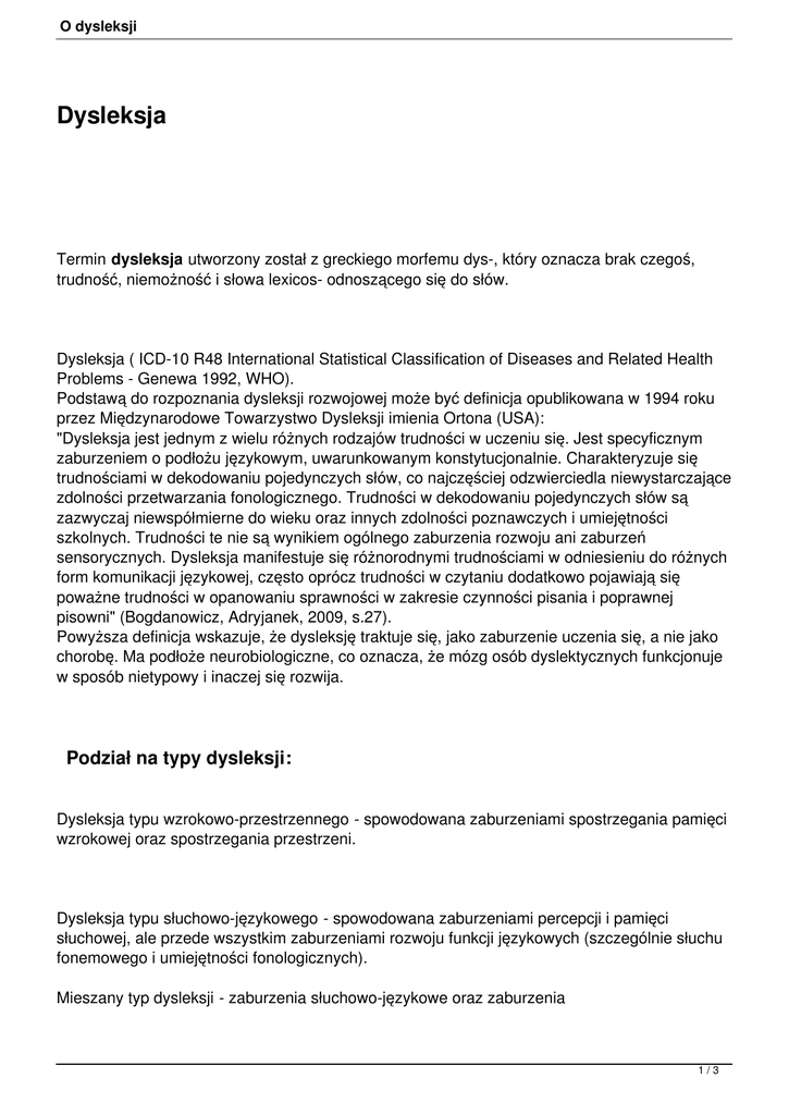 O dysleksji Dysleksja Termin dysleksja utworzony został z greckiego morfemu dys-, który oznacza brak czegoś, trudność, niemożność i słowa lexicos- odnoszącego się do słów. Dysleksja ( ICD-10 R48 International Statistical Classification of Diseases and Related Health Problems - Genewa 1992, WHO). Podstawą do rozpoznania dysleksji rozwojowej może być definicja opublikowana w 1994 roku przez Międzynarodowe Towarzystwo Dysleksji imienia Ortona (USA): "Dysleksja jest jednym z wielu różnych rodzajów trudności w uczeniu się. Jest specyficznym zaburzeniem o podłożu językowym, uwarunkowanym konstytucjonalnie. Charakteryzuje się trudnościami w dekodowaniu pojedynczych słów, co najczęściej odzwierciedla niewystarczające zdolności przetwarzania fonologicznego. Trudności w dekodowaniu pojedynczych słów są zazwyczaj niewspółmierne do wieku oraz innych zdolności poznawczych i umiejętności szkolnych. Trudności te nie są wynikiem ogólnego zaburzenia rozwoju ani zaburzeń sensorycznych. Dysleksja manifestuje się różnorodnymi trudnościami w odniesieniu do różnych form komunikacji językowej, często oprócz trudności w czytaniu dodatkowo pojawiają się poważne trudności w opanowaniu sprawności w zakresie czynności pisania i poprawnej pisowni" (Bogdanowicz, Adryjanek, 2009, s.27). Powyższa definicja wskazuje, że dysleksję traktuje się, jako zaburzenie uczenia się, a nie jako chorobę. Ma podłoże neurobiologiczne, co oznacza, że mózg osób dyslektycznych funkcjonuje w sposób nietypowy i inaczej się rozwija. Podział na typy dysleksji: Dysleksja typu wzrokowo-przestrzennego - spowodowana zaburzeniami spostrzegania pamięci wzrokowej oraz spostrzegania przestrzeni. Dysleksja typu słuchowo-językowego - spowodowana zaburzeniami percepcji i pamięci słuchowej, ale przede wszystkim zaburzeniami rozwoju funkcji językowych (szczególnie słuchu fonemowego i umiejętności fonologicznych). Mieszany typ dysleksji - zaburzenia słuchowo-językowe oraz zaburzenia 1/3 O dysleksji wzrokowo-przestrzenne. Dysleksja typu integracyjnego - spowodowana zaburzeniami integracji funkcji wzrokowo-przestrzennych, słuchowo-językowych, dotykowo-kinestetycznych i motorycznych (Bogdanowicz 2004). Specyficzne trudności w uczeniu się przejawiają się w kilku postaciach: Dysleksja - specyficzne trudności w czytaniu, najczęściej w powiązaniu z trudnościami w opanowaniu poprawnej pisowni. Dysortografia - trudności w opanowaniu poprawnej pisowni (w tym ortografii). Specyficzne trudności w wypowiadaniu się za pomocą pisma (pisanie tekstów). Dyskalkulia - trudności w uczeniu się arytmetyki. Dyspraksja - trudności w wykonywaniu prawidłowych ruchów. Dysgrafia - opanowanie poprawnego poziomu graficznego pisma odręcznego. Trudności wymienione powyżej mogą występować jednocześnie lub też w izolacji. U niewielkiego odsetka uczniów dyslektycznych pojawia się tak zwana głęboka dysleksja, czyli rozległe i głębokie deficyty rozwoju z nasilonymi trudnościami w czytaniu i pisaniu, występującymi od początku nauki szkolnej, które bardzo powoli ustępują pod wpływem systematycznej terapii pedagogicznej. Częstość tych zaburzeń oceniana jest na ok. 3 ? 4 % uczniów. Badania w Polsce określają odsetek dysleksji na 9-10% (Bogdanowicz, Jaklewicz 1968-1982). W literaturze europejskiej podaje się, że dzieci stanowią 10-15% uczniów, w tym 4% to przypadki bardzo nasilonych trudności, które można byłoby określić nazwą głębokiej dysleksji.W krajach niemieckojęzycznych specyficzne trudności w uczeniu się nazywane są legastenia. Etiologia Uwarunkowania tych zaburzeń są wielorakie. Wskazuje się na dziedziczność, zmiany anatomiczne i zaburzenia fizjologiczne układu nerwowego (w okresie ciąży i porodu o nieprawidłowym przebiegu). Zaniedbanie środowiskowe oraz brak szybkiej interwencji pogłębia zaburzenia i trudności dziecka. Bibliografia: 1. Bogdanowicz M., 2007, Uczeń z dysleksją w domu, Wydawnictwo Pedagogiczne Operon, Gdynia. 2/3 O dysleksji 2. Bogdanowicz M., 2004, Uczeń z dysleksją w szkole, Wydawnictwo Pedagogiczne Operon, Gdynia. 3. Bogdanowicz M., Adryjanek A., 2009, Uczeń z dysleksją w szkole, Gdynia: Wydawnictwo Pedagogiczne Operon 2009. 4. MINI-MAX o dysleksji - czyli minimum tego, co na ten temat powinni wiedzieć rodzice i nauczyciele dziecka dyslektycznego, by maksymalnie mu pomóc, praca zbior., red. Mielcarek D., 2006, Wydawnictwo "Seventh Sea", Warszawa. 3/3