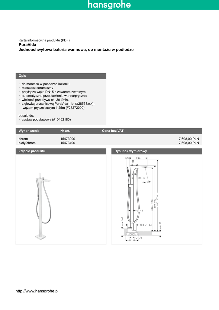 Karta informacyjna produktu (PDF) PuraVida Jednouchwytowa bateria wannowa, do montażu w podłodze Opis · · · · · · do montażu w posadzce łazienki mieszacz ceramiczny przyłącze węża DN15 z zaworem zwrotnym automatyczne przestawienie wanna/prysznic wielkość przepływu ok. 20 l/min. z główką prysznicową PuraVida 1jet (#28558xxx), wężem prysznicowym 1,25m (#28272000) pasuje do: · zestaw podstawowy (#10452180) Wykonczenie Nr art. chrom biały/chrom 15473000 15473400 Zdjecie produktu http://www.hansgrohe.pl Cena bez VAT 7.698,00 PLN 7.698,00 PLN Rysunek wymiarowy