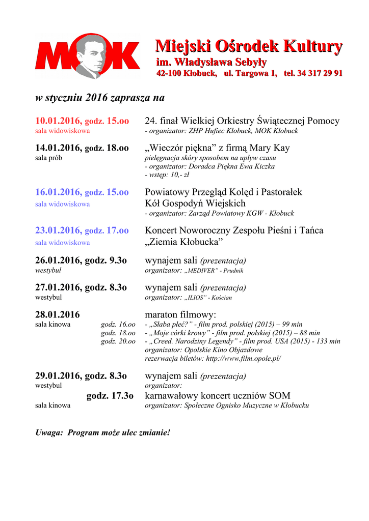 Miejski Ośrodek Kultury im. Władysława Sebyły 42-100 Kłobuck, ul. Targowa 1, tel. 34 317 29 91 w styczniu 2016 zaprasza na 10.01.2016, godz. 15.oo 24. finał Wielkiej Orkiestry Świątecznej Pomocy sala widowiskowa - organizator: ZHP Hufiec Kłobuck, MOK Kłobuck 14.01.2016, godz. 18.oo „Wieczór piękna” z firmą Mary Kay sala prób pielęgnacja skóry sposobem na upływ czasu - organizator: Doradca Piękna Ewa Kiczka - wstęp: 10,- zł 16.01.2016, godz. 15.oo Powiatowy Przegląd Kolęd i Pastorałek Kół Gospodyń Wiejskich sala widowiskowa - organizator: Zarząd Powiatowy KGW - Kłobuck 23.01.2016, godz. 17.oo sala widowiskowa Koncert Noworoczny Zespołu Pieśni i Tańca „Ziemia Kłobucka” 26.01.2016, godz. 9.3o wynajem sali (prezentacja) westybul organizator: „MEDIVER” - Prudnik 27.01.2016, godz. 8.3o wynajem sali (prezentacja) westybul organizator: „ILIOS” - Kościan 28.01.2016 maraton filmowy: sala kinowa godz. 16.oo godz. 18.oo godz. 20.oo - „Słaba płeć?” - film prod. polskiej (2015) – 99 min - „Moje córki krowy” - film prod. polskiej (2015) – 88 min - „Creed. Narodziny Legendy” - film prod. USA (2015) - 133 min organizator: Opolskie Kino Objazdowe rezerwacja biletów: http://www.film.opole.pl/ 29.01.2016, godz. 8.3o wynajem sali (prezentacja) westybul organizator: godz. 17.3o sala kinowa karnawałowy koncert uczniów SOM organizator: Społeczne Ognisko Muzyczne w Kłobucku Uwaga: Program może ulec zmianie!