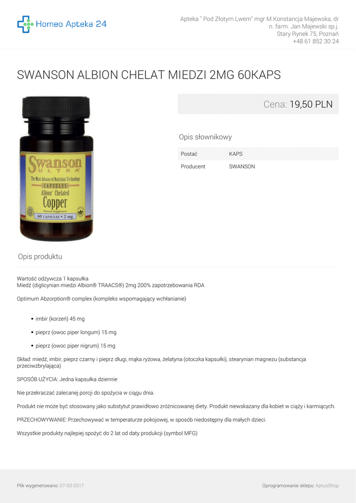 Apteka " Pod Złotym Lwem" mgr M.Konstancja Majewska, dr n. farm. Jan Majewski sp.j. Stary Rynek 75, Poznań +48 61 852 30 24 SWANSON ALBION CHELAT MIEDZI 2MG 60KAPS Cena: 19,50 PLN Opis słownikowy Postać KAPS Producent SWANSON Opis produktu Wartość odżywcza 1 kapsułka Miedź (diglicynian miedzi Albion® TRAACS®) 2mg 200% zapotrzebowania RDA Optimum Abzorption® complex (kompleks wspomagający wchłanianie) imbir (korzeń) 45 mg pieprz (owoc piper longum) 15 mg pieprz (owoc piper nigrum) 15 mg Skład: miedź, imbir, pieprz czarny i pieprz długi, mąka ryżowa, żelatyna (otoczka kapsułki), stearynian magnezu (substancja przeciwzbrylająca) SPOSÓB UŻYCIA: Jedna kapsułka dziennie Nie przekraczać zalecanej porcji do spożycia w ciągu dnia. Produkt nie może być stosowany jako substytut prawidłowo zróżnicowanej diety. Produkt niewskazany dla kobiet w ciąży i karmiących. PRZECHOWYWANIE: Przechowywać w temperaturze pokojowej, w sposób niedostępny dla małych dzieci. Wszystkie produkty najlepiej spożyć do 2 lat od daty produkcji (symbol MFG) Plik wygenerowano: 07-03-2017 Powered by TCPDF (www.tcpdf.org) Oprogramowanie sklepu: AptusShop