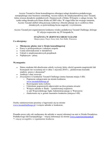 Accreo Taxand to firma konsultingowa oferująca usługi doradztwa podatkowego, europejskiego oraz business consulting. Accreo należy do międzynarodowej sieci Taxand, która zrzesza doradców podatkowych i finansowych z blisko 50 krajów z całego świata. Na rynku usług doradczych firma działa od 2005 roku. W ciągu kilku lat swojego istnienia, Accreo Taxand zdobył silną pozycję rynkową i obecnie plasuje się w czołówce firm doradczych, co potwierdzają liczne nagrody i wyróżnienia. Accreo Taxand jest organizatorem konkursu wiedzy podatkowej Taxand Challenge, którego IV edycja rozpocznie się 29 listopada br. STAŻYSTA W JEDNYM Z BIUR TAXAND Miejsce pracy: Paryż, Nowy Jork, New Delhi, Warszawa Co oferujemy: Miesięczny płatny staż w firmie konsultingowej Pracę w profesjonalnym i młodym zespole Cenne doświadczenie w doradztwie Udział w międzynarodowych projektach Najlepszym - pracę Wymagania: Status studenta lub absolwenta szkoły wyższej, który złożył egzamin magisterski lub licencjacki nie wcześniej niż w dniu 1 stycznia 2010 r.; preferowane kierunki studiów: prawo i ekonomia* Ambicja i chęć rozwoju Zwycięstwo w konkursie Taxand Challenge (status laureata miejsc I-III): o Poprawne zalogowanie na stronie konkursu www.taxandchallenge.pl o Rozwiązanie testu wyboru o Udzielenie poprawnych odpowiedzi na dwa pytania otwarte o Wzięcie udziału w finale – symulowanej rozprawie w sali Wojewódzkiego Sądu Administracyjnego w Warszawie o Znalezienie się w gronie laureatów konkursu (miejsca I-III) Osoby zainteresowane prosimy o logowanie się na stronie www.taxandchallenge.pl i wzięcie udziału w konkursie. Ponadto przez cały rok zachęcamy do udziału w naszej rekrutacji na staż w Dziale Doradztwa Podatkowego lub Europejskiego – więcej informacji na stronie www.experiencetaxand.pl. *- więcej szczegółów w regulaminie konkursu