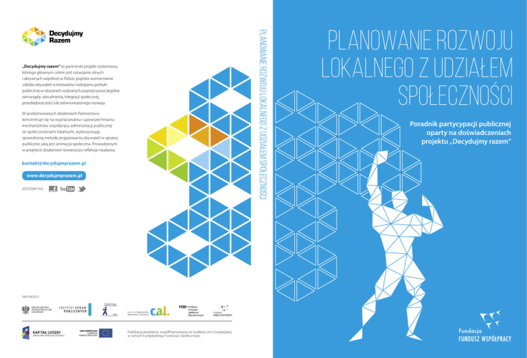 PLANOWANIE ROZWOJU LOKALNEGO Z UDZIAŁEM SPOŁECZNOŚCI „Decydujmy razem” to partnerski projekt systemowy, którego głównym celem jest rozwijanie silnych i aktywnych wspólnot w Polsce, poprzez wzmocnienie udziału obywateli w kreowaniu i wdrażaniu polityki publicznej w obszarach wybranych poprzez poszczególne samorządy: zatrudnienia, integracji społecznej, przedsiębiorczości lub zrównoważonego rozwoju. W podejmowanych działaniach Partnerstwo koncentruje się na wypracowaniu i upowszechnianiu mechanizmów współpracy administracji publicznej ze społecznościami lokalnymi, wykorzystując sprawdzoną metodę angażowania obywateli w sprawy publiczne, jaką jest animacja społeczna. Prowadzonym w projekcie działaniom towarzyszy refleksja naukowa. PARTNERZY: Publikacja bezpłatna, współfinansowana ze środków Unii Europejskiej w ramach Europejskeigo Funduszu Społecznego. PLANOWANIE ROZWOJU LOKALNEGO Z UDZIAŁEM SPOŁECZNOŚCI Poradnik partycypacji publicznej oparty na doświadczeniach projektu „Decydujmy razem” PLANOWANIE ROZWOJU LOKALNEGO Z UDZIAŁEM SPOŁECZNOŚCI Poradnik partycypacji publicznej oparty na doświadczeniach projektu „Decydujmy razem” Publikacja przygotowana w ramach projektu „Decydujmy razem. Wzmocnienie mechanizmów partycypacyjnych w kreowaniu i wdrażaniu polityk publicznych oraz podejmowaniu decyzji publicznych” współfinansowanego ze środków Unii Europejskiej w ramach Europejskiego Funduszu Społecznego. © Copyright by Fundacja Fundusz Współpracy Redakcja Maria Rogaczewska Weronika Chodacz Anna Hejda Daniel Prędkopowicz Wydawca Fundacja Fundusz Współpracy 00-444 Warszawa, ul. Górnosląska 4a tel. 22 450 98 10, fax 22 450 98 03 e-mail: [email protected], www.cofund.org.pl Projekt, infografika, skład studiobakalie.pl ISBN: 978-83-89793-18-8 Redakcja językowa: Joanna Czarkowska Korekta: Katarzyna Lidia Bazga Druk i oprawa: Proprint Usługi Poligraficzne Nakład: 1.000 egz. Wydrukowano na papierze posiadającym certyfikat FSC PUBLIKACJA DYSTRYBUOWANA BEZPŁATNIE Projekt współfinasowany przez Unię Europejską w ramach Europejskiego Funduszu Społecznego W publikacji wyróżniono: ważne informacje dla samorządu ważne informacje dla animatora 7 WPROWADZENIE 8 10 Planowanie strategiczne szkołą obywatelskiej odpowiedzialności Projekt „Decydujmy razem” z lotu ptaka 17 PLANOWANIE PARTYCYPACYJNE W POLSCE 18 Definicja planowania partycypacyjnego 24 Korzyści z planowania partycypacyjnego 28 Kilka uwag na temat tworzenia dokumentów strategicznych w Polsce 35 Porównanie ścieżki metodycznej planowania partycypacyjnego CAL i FRDL w zależności od potrzeb i możliwości określonej wspólnoty lokalnej 40 „Mapa drogowa” partycypacji w planowaniu strategicznym – na podstawie doświadczeń projektu „Decydujmy razem” 43 PLANOWANIE PARTYCYPACYJNE WEDŁUG ŚCIEŻKI METODYCZNEJ FRDL 44 Korzyści i ryzyka planowania partycypacyjnego w porównaniu z planowaniem eksperckim 47 Zespół partycypacyjny – społeczna wartość dodana 51 Wszechstronność metody FRDL 53 Profil kompetencji animatora partycypacji publicznej 55 Etapy procesu planowania partycypacyjnego 57 Wstępne działania informacyjne – poszukiwanie sojuszników do partycypacyjnego tworzenia planu rozwojowego oraz tworzenie mapy partnerów i interesariuszy 59 Stworzenie małego zespołu zadaniowego. Określenie zakresu oraz celów i tytułu dokumentu, nad którym będzie pracować dana społeczność 61 Powołanie zespołu partycypacyjnego 64 Praca nad dokumentem planistycznym (diagnoza potrzeb i problemów, analiza zasobów i deficytów, wyznaczenie celów, zdefiniowanie projektów wraz z harmonogramami i budżetami, zaplanowanie działań monitoringowych i ewaluacyjnych) 66 Konsultacje społeczne wstępnej wersji dokumentu, debaty z mieszkańcami 66 Przygotowanie ostatecznej wersji dokumentu rozwojowego 67 Przedstawienie dokumentu radzie jednostki samorządu terytorialnego i przyjęcie go przez nią 67 Etap wdrożenia, wprowadzanie modyfikacji do projektów wykonawczych, o ile są one konieczne 67 Monitoring obywatelski wdrożenia rozwiązań (w tym monitoring przepływu środków) oraz ewaluacja końcowa 4 5 68 Budowanie zespołu partycypacyjnego 75 Przygotowanie diagnozy lokalnej jako wstęp do planowania partycypacyjnego 81 Struktura i zawartość dokumentu planistycznego 90 Konsultacje społeczne 98 Ograniczenia i ryzyka modelu planowania partycypacyjnego FRDL 101 PLANOWANIE PARTYCYPACYJNE WEDUG ŚCIEŻKI METODYCZNEJ CAL – MODEL SUBREGIONALNY 102 Korzyści płynące ze współpracy na poziomie subregionalnym 104 Od czego zacząć i jak rozwinąć działania wykorzystując model planowania według ścieżki CAL na poziomie lokalnym? 105 Wybór polityki publicznej 106 Wybór animatora partycypacji publicznej 108 Powołanie małego zespołu zadaniowego w urzędzie w celu wsparcia animatora 110 Analiza interesariuszy 111 Rola moderatora/eksperta zewnętrznego 112 Spotkania zespołu partycypacyjnego i praca nad dokumentem planistycznym 117 Fora partycypacji publicznej 119 Tworzenie dokumentu rozwojowego w zespole partycypacyjnym na podstawie doświadczeń praktycznych 129 132 Monitoring i ewaluacja wdrożenia uchwalonego dokumentu planistycznego Partycypacja na poziomie subregionalnym – opis mechanizmu 134 Rola, cechy i umiejętności animatora subregionalnego oraz superwizora 138 Wydarzenia subregionalne – wzmacnianie klimatu partycypacji 153 ZAKOŃCZENIE 154 Planowanie partycypacyjne – lista niezbędnych dla sukcesu elementów 158 Partycypacja publiczna w przyszłości – kontekst polityk i funduszy europejskich 160 Podsumowanie dokonań projektu „Decydujmy razem” w ścieżce subregionalnej CAL 165 Podsumowanie dokonań projektu „Decydujmy razem” w ścieżce FDRL 169 Literatura cytowana 171 Wybrane dobre praktyki projektu „Decydujmy razem” 7 WPROWADZENIE Planowanie strategiczne szkołą obywatelskiej odpowiedzialności Celem poradnika,