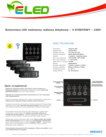 Ściemniacz LED naścienny radiowy dotykowy – 4 STREFOWY – 230V DANE TECHNICZNE: Sterowanie radiowe (RF) Częstotliwość 433,92 MHz Napięcie wej./wyj. 12 V lub 24 V DC Zasilanie nadajnika AC90-265V(50/60Hz) Wyjście 3 wyjścia - wspólna anoda Max. moc wyjściowa 12V<192W, 24V<432W Max. prąd wyjściowy 3 x 6A (18A) Pobór mocy w czuwaniu <0.2W Montaż podtynkowy Wymiary odbiornika 127mm x 42mm x 33mm Wymiary nadajnika 86mm x 86mm x 32mm Temperatura pracy 0 - 45° C Zasięg radiowy ok. 30 metrów Opis urządzenia Naścienny bezprzewodowy ściemniacz LED 4 strefowy ze szklanym panelem umożliwiający sterowanie jasnością taśm LED jednokolorowych przy użyciu drogi radiowej. Pozwala on na bezprzewodowe sterowanie od 1 do 4 obwodów LED indywidualnie! Sterownie jasnością obiektów LED a także ich załączaniem i wyłączaniem odbywa się za pomocą dotyku poprzez panel naścienny. Zastosowanie tego typu rozwiązania umożliwia stworzenie inteligentnego oświetlenia LED w np. czterech różnych punktach (pomieszczeniach) które będą kontrolowane za pomocą jednego urządzenia nadawczego. Komunikacja między ściemniaczem LED naściennym a odbiornikiem umieszczonym przy taśmie LED odbywa się drogą radiową na przestrzeni ok.30 metrów. Unikalne kodowanie sygnału radiowego pozwala uniknąć zakłóceń i utrzymuje stabilność całego systemu. Podstawowe funkcje ściemniacza LED: opcja włącz/wyłącz dla każdej strefy indywidualnie (płynne włączanie), ściemnianie/rozjaśnianie taśmy LED dla każdej strefy z osobna, funkcja "SLEEP" - ograniczająca pobór mocy przez nadajnik (po 20s od ostatniego użycia nadajnik przechodzi w stan uśpienia). Prezentowany ściemniacz LED występuje w kilku wariantach z 2, 3 lub 4 odbiornikami do wyboru. WWW.ELED.PL © Zabrania się kopiowania oraz rozpowszechniania zdjęć oraz tekstów zawartych w niniejszej instrukcji bez pisemnej zgody firmy TECH-SYSTEM. Rysunek Techniczny Instalacja nadajnika i odbiornika WWW.ELED.PL © Zabrania się kopiowania oraz rozpowszechniania zdjęć oraz tekstów zawartych w niniejszej instrukcji bez pisemnej zgody firmy TECH-SYSTEM. PROGRAMOWANIE URZĄDZEŃ Każdy nowo dostarczony zestaw wymaga zaprogramowania nadajnika do odbiorników. Aby zaprogramować nadajnik do odbiornika należy postępować zgodnie z poniższymi instrukcjami: - Podłącz zasilanie nadajnika. - Wyłącz zasilanie odbiornika który ma zostać zaprogramowany do wybranej strefy na nadajniku (pozostałe odbiorniki w tym czasie powinny być odłączone całkowicie od zasilania). - Po kilkunastu sekundach załącz ponownie zasilanie programowanego odbiornika i w ciągu 3 sekund naciśnij raz przycisk dla wybranej wcześniej strefy. Podłączona do odbiornika np. taśma LED powinna przygasnąć do 50% swojej jasności. W wypadku gdy oświetlenie nie przygaśnie do 50% należy rozpocząć ponownie powyższą procedurę ponownie. - Następnie przyciśnij przycisk programowanej strefy – oświetlenie przygaśnie do 25%. - Przyciśnij kolejny raz przycisk programowanej strefy – oświetlenie przygaśnie do 5%. - Przyciśnij ponownie przycisk programowanej strefy – oświetlenie osiągnie do 100% swojej jasności. Procedura programowania została zakończona. Programowanie kolejnych odbiorników dla kolejnych stref należy przeprowadzić zgodnie z powyższymi procedurami wybierając inną strefę na nadajniku. UWAGI Przed przystąpieniem do montażu należy zapoznad się z powyższą instrukcją. Panel wykonany jest ze szkła, dlatego też zalecana jest duża ostrożnośd przy instalacji. Montaż powinna wykonad osoba posiadająca odpowiednie kwalifikacje i uprawnienia. Urządzenia nie należy instalować w miejscach narażonych na działanie silnych fal elektromagnetycznych, które mogą zakłócić działanie urządzenia. Należy przestrzegać napięcia wejściowego urządzenia. Podanie wyższego napięcia niż w parametrach może doprowadzić do zniszczenia urządzenia. Gwarancja obejmuje usterki niewynikające z winy użytkownika. Nie obejmuje ona uszkodzeń mechanicznych, nieprawidłowego doboru napięcia wejściowego, zalania wodą oraz uszkodzeń spowodowanych przepięciami elektrycznymi. WWW.ELED.PL © Zabrania się kopiowania oraz rozpowszechniania zdjęć oraz tekstów zawartych w niniejszej instrukcji bez pisemnej zgody firmy TECH-SYSTEM.