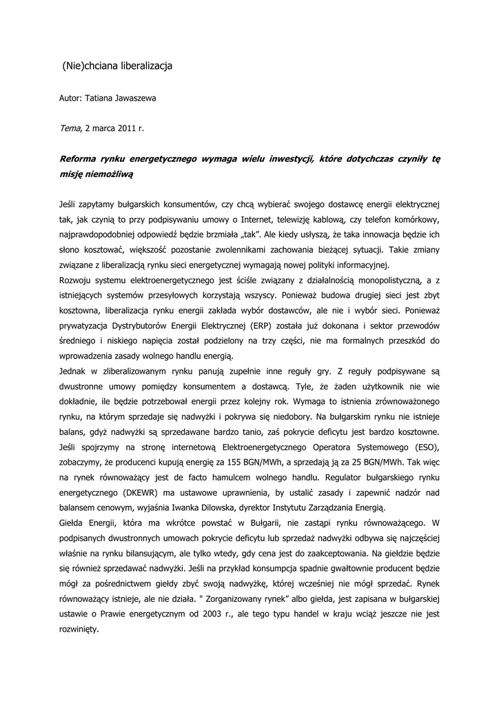 (Nie)chciana liberalizacja Autor: Tatiana Jawaszewa Tema, 2 marca 2011 r. Reforma rynku energetycznego wymaga wielu inwestycji, które dotychczas czyniły tę misję niemożliwą Jeśli zapytamy bułgarskich konsumentów, czy chcą wybierać swojego dostawcę energii elektrycznej tak, jak czynią to przy podpisywaniu umowy o Internet, telewizję kablową, czy telefon komórkowy, najprawdopodobniej odpowiedź będzie brzmiała „tak”. Ale kiedy usłyszą, że taka innowacja będzie ich słono kosztować, większość pozostanie zwolennikami zachowania bieżącej sytuacji. Takie zmiany związane z liberalizacją rynku sieci energetycznej wymagają nowej polityki informacyjnej. Rozwoju systemu elektroenergetycznego jest ściśle związany z działalnością monopolistyczną, a z istniejących systemów przesyłowych korzystają wszyscy. Ponieważ budowa drugiej sieci jest zbyt kosztowna, liberalizacja rynku energii zakłada wybór dostawców, ale nie i wybór sieci. Ponieważ prywatyzacja Dystrybutorów Energii Elektrycznej (ERP) została już dokonana i sektor przewodów średniego i niskiego napięcia został podzielony na trzy części, nie ma formalnych przeszkód do wprowadzenia zasady wolnego handlu energią. Jednak w zliberalizowanym rynku panują zupełnie inne reguły gry. Z reguły podpisywane są dwustronne umowy pomiędzy konsumentem a dostawcą. Tyle, że żaden użytkownik nie wie dokładnie, ile będzie potrzebował energii przez kolejny rok. Wymaga to istnienia zrównoważonego rynku, na którym sprzedaje się nadwyżki i pokrywa się niedobory. Na bułgarskim rynku nie istnieje balans, gdyż nadwyżki są sprzedawane bardzo tanio, zaś pokrycie deficytu jest bardzo kosztowne. Jeśli spojrzymy na stronę internetową Elektroenergetycznego Operatora Systemowego (ESO), zobaczymy, że producenci kupują energię za 155 BGN/MWh, a sprzedają ją za 25 BGN/MWh. Tak więc na rynek równoważący jest de facto hamulcem wolnego handlu. Regulator bułgarskiego rynku energetycznego (DKEWR) ma ustawowe uprawnienia, by ustalić zasady i zapewnić nadzór nad balansem cenowym, wyjaśnia Iwanka Dilowska, dyrektor Instytutu Zarządzania Energią. Giełda Energii, która ma wkrótce powstać w Bułgarii, nie zastąpi rynku równoważącego. W podpisanych dwustronnych umowach pokrycie deficytu lub sprzedaż nadwyżki odbywa się najczęściej właśnie na rynku bilansującym, ale tylko wtedy, gdy cena jest do zaakceptowania. Na giełdzie będzie się również sprzedawać nadwyżki. Jeśli na przykład konsumpcja spadnie gwałtownie producent będzie mógł za pośrednictwem giełdy zbyć swoją nadwyżkę, której wcześniej nie mógł sprzedać. Rynek równoważący istnieje, ale nie działa. " Zorganizowany rynek” albo giełda, jest zapisana w bułgarskiej ustawie o Prawie energetycznym od 2003 r., ale tego typu handel w kraju wciąż jeszcze nie jest rozwinięty. Paragraf 22 Jeśli porzucone zostaną ceny regulowane, energia na wolnym rynku będzie kosztować usługobiorców dużo więcej. Taki scenariusz będzie możliwy tak długo, dopóki producenci będą zobowiązani do sprzedaży 70% energii na rynku regulowanym i to po niższych cenach, niż te które rządzą wolnym rynkiem. Taka sytuacja ukazuje na fakt, że chcąc w najbliższym czasie uzyskać pełną swobodę w wyborze dostawcy, bułgarscy konsumenci nie będą mogli liczyć na żadne korzyści ekonomiczne, przeciwnie. Nie należy jednak zapominać, że jako członek UE, Bułgaria zobowiązała się do podjęcia działań na rzecz energetycznej efektywności, i wykorzystania odnawialnych źródeł energii, a wkrótce dojść ma do ewaluacji i podsumowania pierwszych wyników. Sieć elektroenergetyczna jest w kraju bardzo przestarzała i przez najbliższe lata będzie trzeba dokonać olbrzymich inwestycji, nie tylko na utrzymanie istniejącej sieci, ale też na budowę inteligentnych systemów, bez których europejskie postulaty pozostaną tylko na papierze. W Bułgarii nie ma w tej chwili warunków dla konkurencji w energetyce i dlatego wyłącznie utworzenie giełdy energii nie może wywołać pozytywnego impulsu na rynku konsumenckim. W obecnej sytuacji argument potrzeby funkcjonowania giełdy nie brzmi dla Bułgarów przekonująco. W przypadku rozwoju tego typu handlu, producenci sprzedający taniej raczej podwyższą stawki do poziomów rynkowych, niż pozostali ją obniżą. Jeśli zaś będzie istniała równowaga pomiędzy podażą a popytem, cena energii wytworzonej w elektrowni atomowej w Kozloduju, która obecnie jest najniższa, również najprawdopodobniej wzrośnie do poziomu cen rynkowych. I nie ma co oczekiwać, że inni producenci obniżą ceny na giełdzie. Liberalizacja rynku nie wymaga bezwzględnie istnienia giełdy energii, ponieważ w tej gałęzi gospodarki transakcje oscylują w granicach 10% całej wymiany handlowej. Gdy coraz więcej firm zaczyna kupować energię na wolnym rynku, tym bardziej przychody przedsiębiorstw dostarczających energię elektryczną będzie zależeć od cen dla gospodarstw domowych. Wówczas będą one dążyć do znacznego podniesienia cen energii, by nie były stratne. W odniesieniu do sieci dystrybucyjnych, ich zarobki, tak jak i teraz będą monitorowane przez krajowego regulatora. Wszyscy użytkownicy zarówno na wolnym rynku, jak i regulowanym i będą dalej korzystać z sieci i płacić za transport. Kolejnym absurdem jest to, że państwo zobowiązuje dostawców energii odnawialnej do przyłączenia się do niej nie zapewniając im żadnych pieniędzy. Stawia się przed nimi także wymagania jakościowe, bez zapewnienia odpowiednich środków. Kamienie pod nogi W ostatnich latach Bułgaria przejawiała słabe zainteresowanie liberalizacją rynku energii dla gospodarstw domowych, ponieważ jest ona związana z ogromnymi inwestycjami. Na razie, koszty korzystania z energii są przystępne, dlatego nikt nie podejmuje się działań zmierzających do zmiany status q