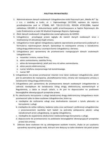 POLITYKA PRYWATNOŚCI 1. Administratorem danych osobowych Usługobiorców-osób fizycznych jest „Media 4U” Sp. z o.o. z siedzibą w Łodzi, ul. J. Dąbrowskiego 247/249, wpisana do rejestru przedsiębiorców pod nr 175848, NIP: 726-22-23-331, REGON 472012084, kapitał zakładowy 100.000 zł. dokumentacja spółki przechowywana w Sądzie Rejonowym dla Łodzi Śródmieścia w Łodzi XX Wydział Krajowego Rejestru Sądowego. 2. Zbiór danych osobowych Usługobiorców został zgłoszony do GIODO. 3. Usługobiorcy przysługuje prawo wglądu do swoich danych osobowych wraz z możliwością ich aktualizacji bądź zmiany. 4. Usługobiorca może zgłosić Usługodawcy żądanie zaprzestania przetwarzania podanych w formularzu rejestracyjnym danych. Spowoduje to rozwiązanie umowy o świadczeniu Usług drogą elektroniczną i usunięcie konta Usługobiorcy z Serwisu. 5. Usługodawca jest uprawniony do przetwarzania następujących danych osobowych Usługobiorców: a. nazwisko i imiona, nazwa firmy, b. adres zamieszkania, siedziba firmy, c. adres do korespondencji, jeżeli jest inny niż adres zamieszkania, d. adres poczty elektronicznej, e. numer telefonu stacjonarnego lub komórkowego. f. numer NIP 6. Usługodawca ma prawo przetwarzać również inne dane osobowe Usługobiorców, jeżeli jest to potrzebne do nawiązania, ukształtowania treści, zmiany lub rozwiązania umowy o świadczenie Usług drogą elektroniczną. 7. Usługodawca jest uprawniony do przetwarzania danych osobowych Usługobiorców w zakresie niezbędnym do świadczenia Usług drogą elektroniczną wymienionych w Regulaminie, a także w innych celach, o ile jest to dopuszczalne na podstawie bezwzględnie obowiązujących przepisów prawa. 8. Po zakończeniu korzystania z usługi świadczonej drogą elektroniczną Usługodawca może przetwarzać tylko te dane osobowe Usługobiorców, które są: a. niezbędne do rozliczenia usługi oraz dochodzenia roszczeń z tytułu płatności za korzystanie z usługi, b. niezbędne do celów reklamy, badania rynku oraz zachowań i preferencji usługobiorców z przeznaczeniem wyników tych badań na potrzeby polepszenia jakości usług świadczonych przez usługodawcę, za zgodą Usługobiorcy, c. niezbędne do wyjaśnienia okoliczności niedozwolonego korzystania z usługi, d. dopuszczone do przetwarzania na podstawie bezwzględnie obowiązujących przepisów prawa lub umowy. 9. Zebrane dane osobowe nie są udostępniane osobom trzecim, chyba że po uzyskaniu uprzedniej wyraźnej zgody osób, których one dotyczą na takie działanie lub jeżeli prawo lub obowiązek przekazania tych danych wynika z bezwzględnie obowiązujących przepisów prawa. 10. Usługodawca stosuje środki bezpieczeństwa, mające na celu ochronę danych przed ich utratą, niewłaściwym wykorzystaniem czy modyfikacją. Prawa dostępu do danych osobowych Usługobiorców zostały w restrykcyjny sposób ograniczone, tak aby informacje te nie znalazły się w rękach osób niepowołanych. Dostęp do danych osobowych ma tylko ograniczona liczba uprawnionych osób zgodnie z ustawą o ochronie danych osobowych oraz rozporządzeniem Ministra Spraw Wewnętrznych i Administracji z dn. 29 kwietnia 2004 r. w sprawie dokumentacji przetwarzania danych osobowych oraz warunków technicznych i organizacyjnych, jakim powinny odpowiadać urządzenia i systemy informatyczne służące do przetwarzania danych osobowych.