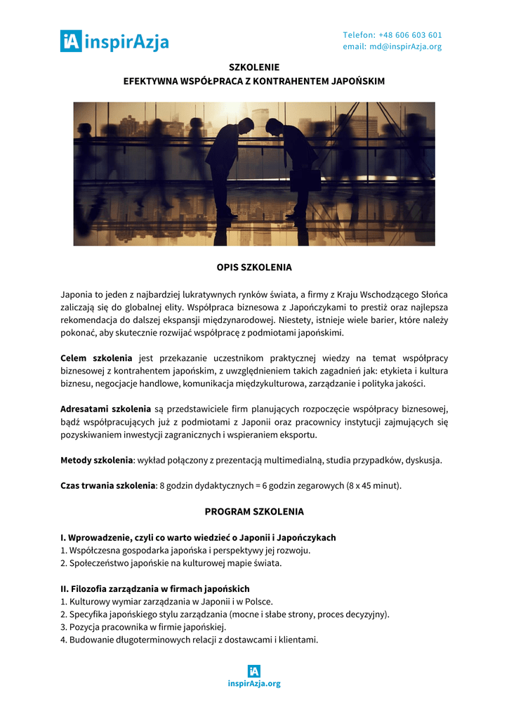 Telefon: +48 606 603 601 email: [email protected] SZKOLENIE EFEKTYWNA WSPÓŁPRACA Z KONTRAHENTEM JAPOŃSKIM OPIS SZKOLENIA Japonia to jeden z najbardziej lukratywnych rynków świata, a firmy z Kraju Wschodzącego Słońca zaliczają się do globalnej elity. Współpraca biznesowa z Japończykami to prestiż oraz najlepsza rekomendacja do dalszej ekspansji międzynarodowej. Niestety, istnieje wiele barier, które należy pokonać, aby skutecznie rozwijać współpracę z podmiotami japońskimi. Celem szkolenia jest przekazanie uczestnikom praktycznej wiedzy na temat współpracy biznesowej z kontrahentem japońskim, z uwzględnieniem takich zagadnień jak: etykieta i kultura biznesu, negocjacje handlowe, komunikacja międzykulturowa, zarządzanie i polityka jakości. Adresatami szkolenia są przedstawiciele firm planujących rozpoczęcie współpracy biznesowej, bądź współpracujących już z podmiotami z Japonii oraz pracownicy instytucji zajmujących się pozyskiwaniem inwestycji zagranicznych i wspieraniem eksportu. Metody szkolenia: wykład połączony z prezentacją multimedialną, studia przypadków, dyskusja. Czas trwania szkolenia: 8 godzin dydaktycznych = 6 godzin zegarowych (8 x 45 minut). PROGRAM SZKOLENIA I. Wprowadzenie, czyli co warto wiedzieć o Japonii i Japończykach 1. Współczesna gospodarka japońska i perspektywy jej rozwoju. 2. Społeczeństwo japońskie na kulturowej mapie świata. II. Filozofia zarządzania w firmach japońskich 1. Kulturowy wymiar zarządzania w Japonii i w Polsce. 2. Specyfika japońskiego stylu zarządzania (mocne i słabe strony, proces decyzyjny). 3. Pozycja pracownika w firmie japońskiej. 4. Budowanie długoterminowych relacji z dostawcami i klientami. inspirAzja.org Telefon: +48 606 603 601 email: [email protected] III. Orientacja na klienta i polityka jakości 1. Wymagania klientów japońskich. 2. Geneza polityki projakościowej w Japonii. 3. Kultura ciągłego doskonalenia w organizacjach japońskich. 4. Zasady dobrej organizacji stanowiska pracy. IV. Kultura biznesowa w Japonii 1. Etykieta w biznesie (m.in. wymiana wizytówek i prezentów, ubiór, usadzenie osób przy stole). 2. Skuteczna komunikacja z Japończykami (komunikacja werbalna i niewerbalna, prezentacje). 3. Specyfika prowadzenia negocjacji handlowych. 4. Spotkania nieformalne oraz preferencje Japończyków dotyczące hotelu i restauracji. V. Studia przypadków 1. Przykłady udanej i nieudanej współpracy z firmami japońskimi. 2. Polska w oczach Japończyków. PROWADZĄCY SZKOLENIE Mariusz Dąbrowski – ekonomista, doktorant na Wydziale Ekonomii i Zarządzania Uniwersytetu w Białymstoku, członek Polsko-Japońskiego Komitetu Gospodarczego. Autor szkoleń i publikacji dotyczących rynków azjatyckich oraz japońskiej kultury biznesu. Prowadził szkolenia m.in. dla Polskiej Agencji Informacji i Inwestycji Zagranicznych (PAIiIZ), Polskiej Organizacji Turystycznej (POT), samorządów lokalnych (Radomsko, Szczecinek), firm prywatnych (Adampol, Fujitsu, mBank, Rosti, Valeo) oraz przedstawicieli przedsiębiorstw japońskich (Sumitomo Electric, Denso Thermal Systems). Wielokrotnie był cytowany lub komentował wydarzenia dotyczące Azji Wschodniej oraz polskojapońskiej współpracy gospodarczej, w takich mediach jak: Japan Today, TVN24 Biznes i Świat (poprzednio TVN CNBC), Polsat News, Telewizja Polska, Polskie Radio, Radio PiN, Radio TOK FM. W przeszłości organizował import i sprzedaż produktów japońskich w Polsce oraz był zaangażowany w realizację programu Ministerstwa Gospodarki „Do IT with Poland”, promującego polską branżę usług ICT/IT na rynku japońskim. Rodzinnie związany z Japonią, skąd pochodzi jego małżonka. Interesuje się rozwojem gospodarczym krajów azjatyckich. Uwaga: Szkolenie może zostać zmodyfikowane oraz dostosowane do potrzeb Zamawiającego, łącznie z czasem trwania zajęć. Uczestnicy otrzymają materiały szkoleniowe oraz przez miesiąc – od dnia zakończenia szkolenia – będą mogli korzystać z bezpłatnej pomocy prowadzącego. inspirAzja.org