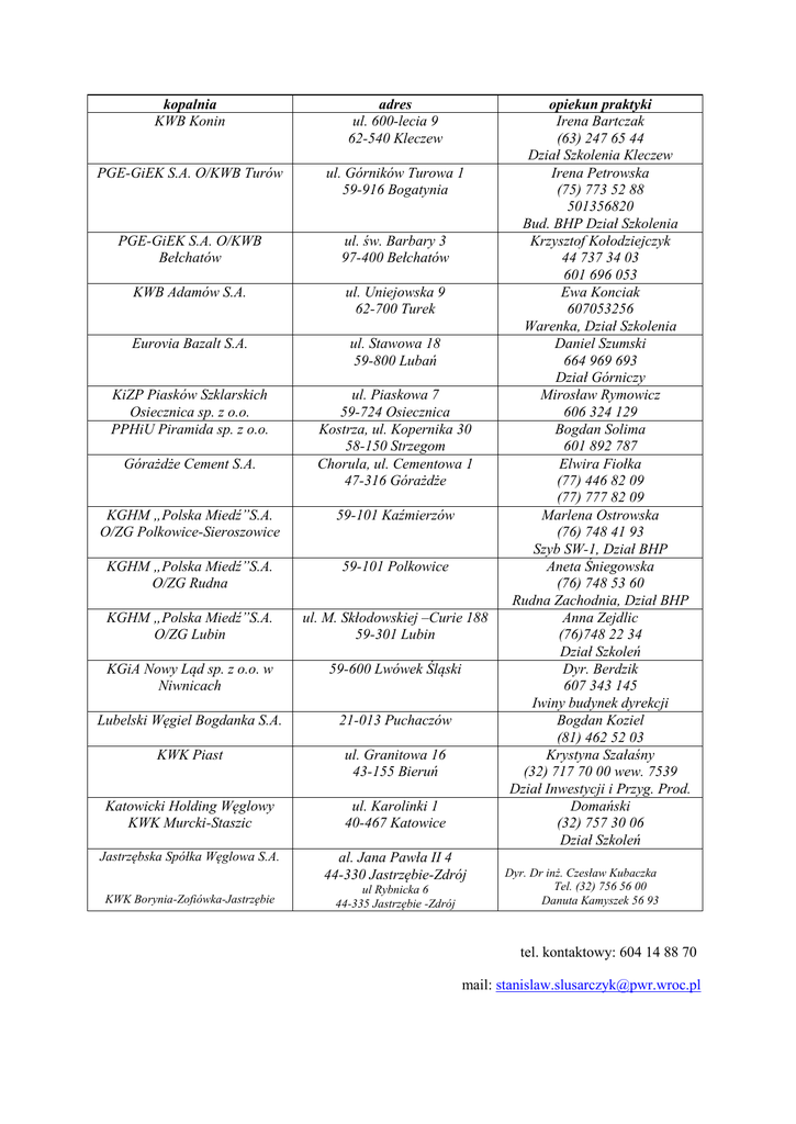kopalnia KWB Konin adres ul. 600-lecia 9 62-540 Kleczew PGE-GiEK S.A. O/KWB Turów ul. Górników Turowa 1 59-916 Bogatynia PGE-GiEK S.A. O/KWB Bełchatów ul. św. Barbary 3 97-400 Bełchatów KWB Adamów S.A. ul. Uniejowska 9 62-700 Turek Eurovia Bazalt S.A. ul. Stawowa 18 59-800 Lubań KiZP Piasków Szklarskich Osiecznica sp. z o.o. PPHiU Piramida sp. z o.o. ul. Piaskowa 7 59-724 Osiecznica Kostrza, ul. Kopernika 30 58-150 Strzegom Chorula, ul. Cementowa 1 47-316 Górażdże Górażdże Cement S.A. KGHM „Polska Miedź”S.A. O/ZG Polkowice-Sieroszowice 59-101 Kaźmierzów KGHM „Polska Miedź”S.A. O/ZG Rudna 59-101 Polkowice KGHM „Polska Miedź”S.A. O/ZG Lubin ul. M. Skłodowskiej –Curie 188 59-301 Lubin KGiA Nowy Ląd sp. z o.o. w Niwnicach 59-600 Lwówek Śląski Lubelski Węgiel Bogdanka S.A. 21-013 Puchaczów KWK Piast ul. Granitowa 16 43-155 Bieruń Katowicki Holding Węglowy KWK Murcki-Staszic ul. Karolinki 1 40-467 Katowice Jastrzębska Spółka Węglowa S.A. al. Jana Pawła II 4 44-330 Jastrzębie-Zdrój KWK Borynia-Zofiówka-Jastrzębie ul Rybnicka 6 44-335 Jastrzębie -Zdrój opiekun praktyki Irena Bartczak (63) 247 65 44 Dział Szkolenia Kleczew Irena Petrowska (75) 773 52 88 501356820 Bud. BHP Dział Szkolenia Krzysztof Kołodziejczyk 44 737 34 03 601 696 053 Ewa Konciak 607053256 Warenka, Dział Szkolenia Daniel Szumski 664 969 693 Dział Górniczy Mirosław Rymowicz 606 324 129 Bogdan Solima 601 892 787 Elwira Fiołka (77) 446 82 09 (77) 777 82 09 Marlena Ostrowska (76) 748 41 93 Szyb SW-1, Dział BHP Aneta Śniegowska (76) 748 53 60 Rudna Zachodnia, Dział BHP Anna Zejdlic (76)748 22 34 Dział Szkoleń Dyr. Berdzik 607 343 145 Iwiny budynek dyrekcji Bogdan Koziel (81) 462 52 03 Krystyna Szałaśny (32) 717 70 00 wew. 7539 Dział Inwestycji i Przyg. Prod. Domański (32) 757 30 06 Dział Szkoleń Dyr. Dr inż. Czesław Kubaczka Tel. (32) 756 56 00 Danuta Kamyszek 56 93 tel. kontaktowy: 604 14 88 70 mail: [email protected]